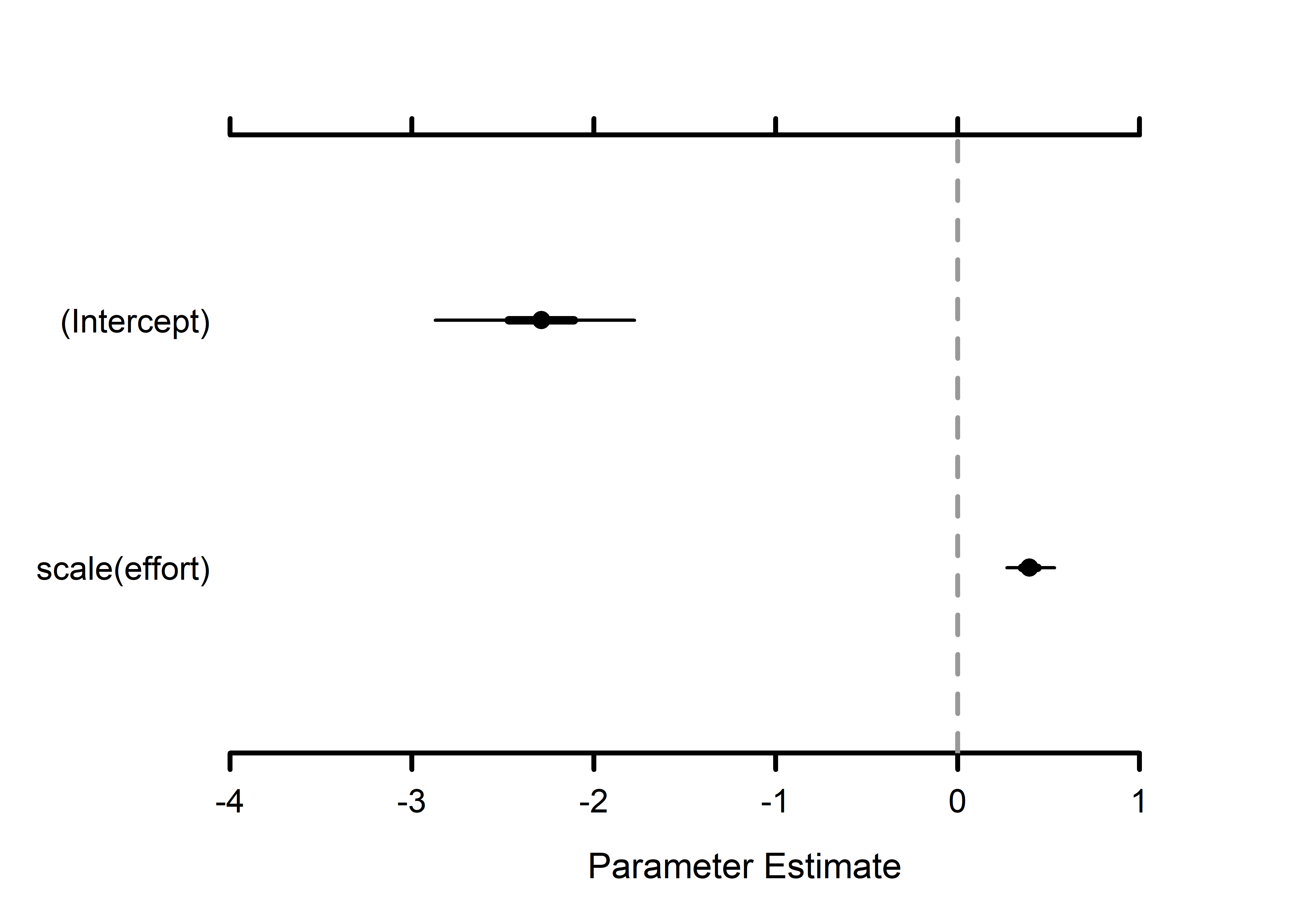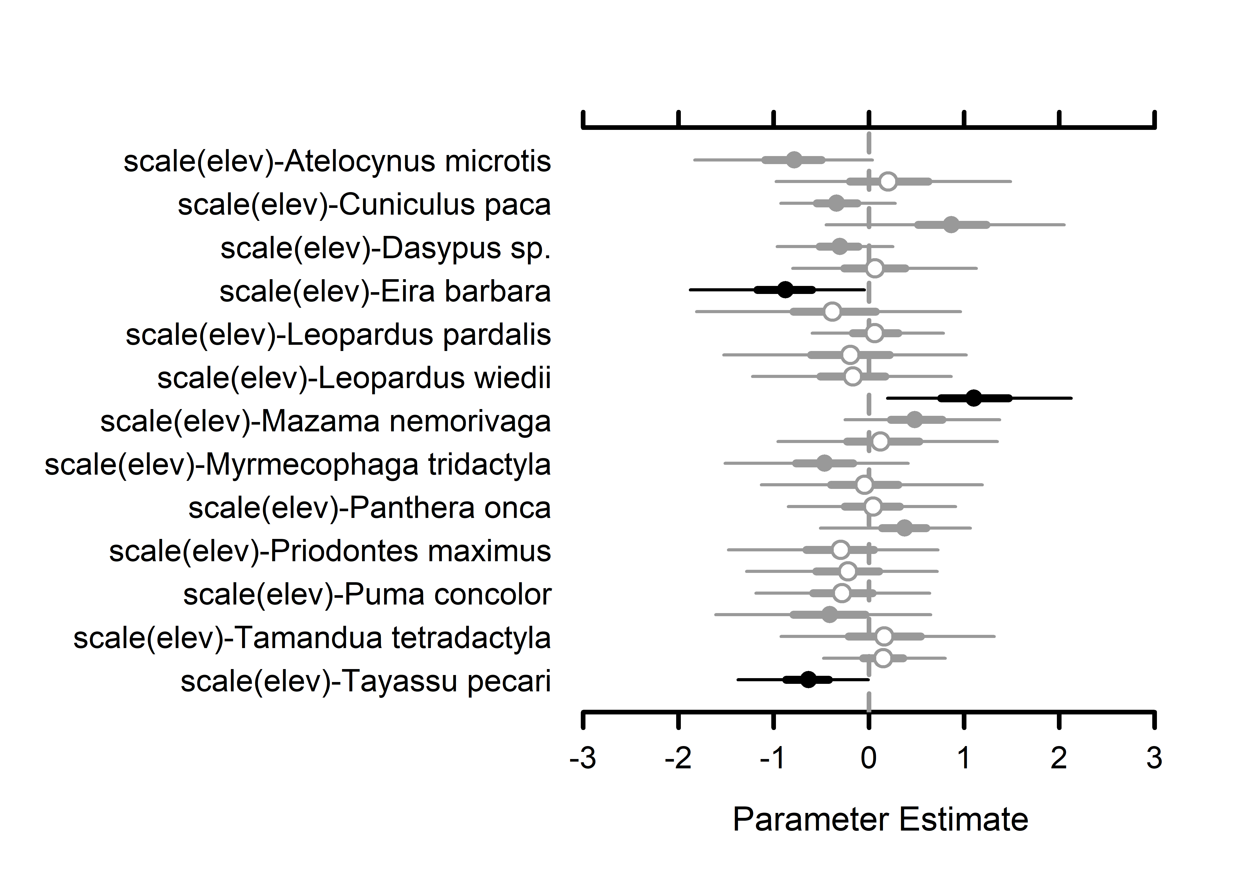 # Create simple plot summaries using MCMCvis package.# Detection covariate effects --------- MCMCplot(out.sp$alpha.comm.samples, ref_ovl =TRUE, ci =c(50, 95))# Occupancy community-level effects MCMCplot(out.sp$beta.comm.samples, ref_ovl =TRUE, ci =c(50, 95))