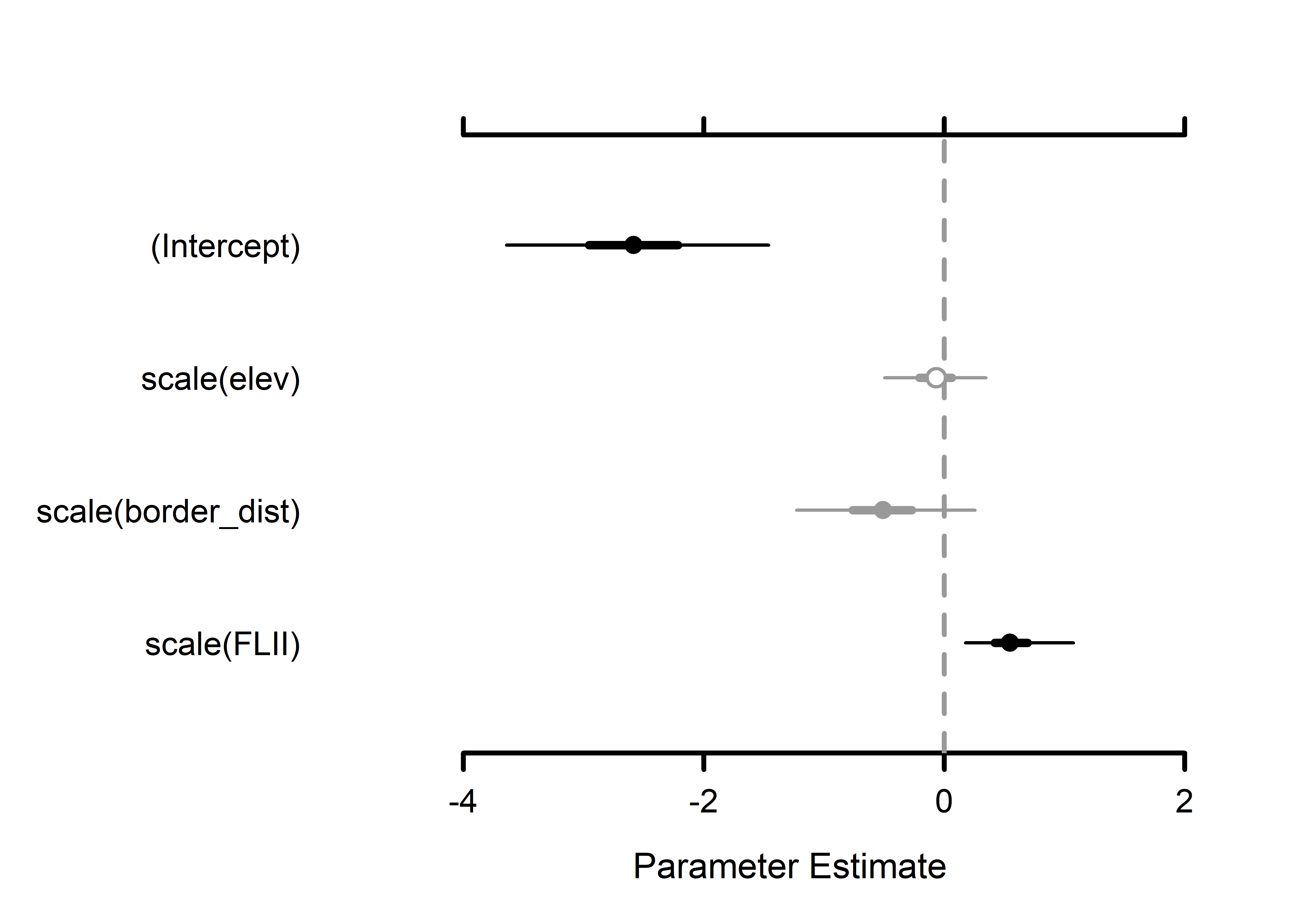# 6. Prediction -----------------------------------------------------------# Predict occupancy along a gradient of elev # Create a set of values across the range of observed elev valueselev.pred.vals<-seq(min(data_list$occ.covs$elev), max(data_list$occ.covs$elev), length.out =100)# Scale predicted values by mean and standard deviation used to fit the modelelev.pred.vals.scale<-(elev.pred.vals-mean(data_list$occ.covs$elev))/sd(data_list$occ.covs$elev)# Create a set of values across the range of observed elev valuesborder_dist.pred.vals<-seq(min(data_list$occ.covs$border_dist), max(data_list$occ.covs$border_dist), length.out =100)# Scale predicted values by mean and standard deviation used to fit the modelborder_dist.pred.vals.scale<-(border_dist.pred.vals-mean(data_list$occ.covs$border_dist))/sd(data_list$occ.covs$border_dist)# Predict occupancy across elev values at mean values of all other variablespred.df1<-as.matrix(data.frame(intercept =1, elev =elev.pred.vals.scale, border_dist =0, FLII=0))#, catchment = 0, density = 0, # slope = 0))# Predict occupancy across elev values at mean values of all other variablespred.df2<-as.matrix(data.frame(intercept =1, elev =0, border_dist =border_dist.pred.vals.scale, FLII=0))#, catchment = 0, density = 0, # slope = 0))out.pred1<-predict(out, pred.df1)# using non spatialstr(out.pred1)