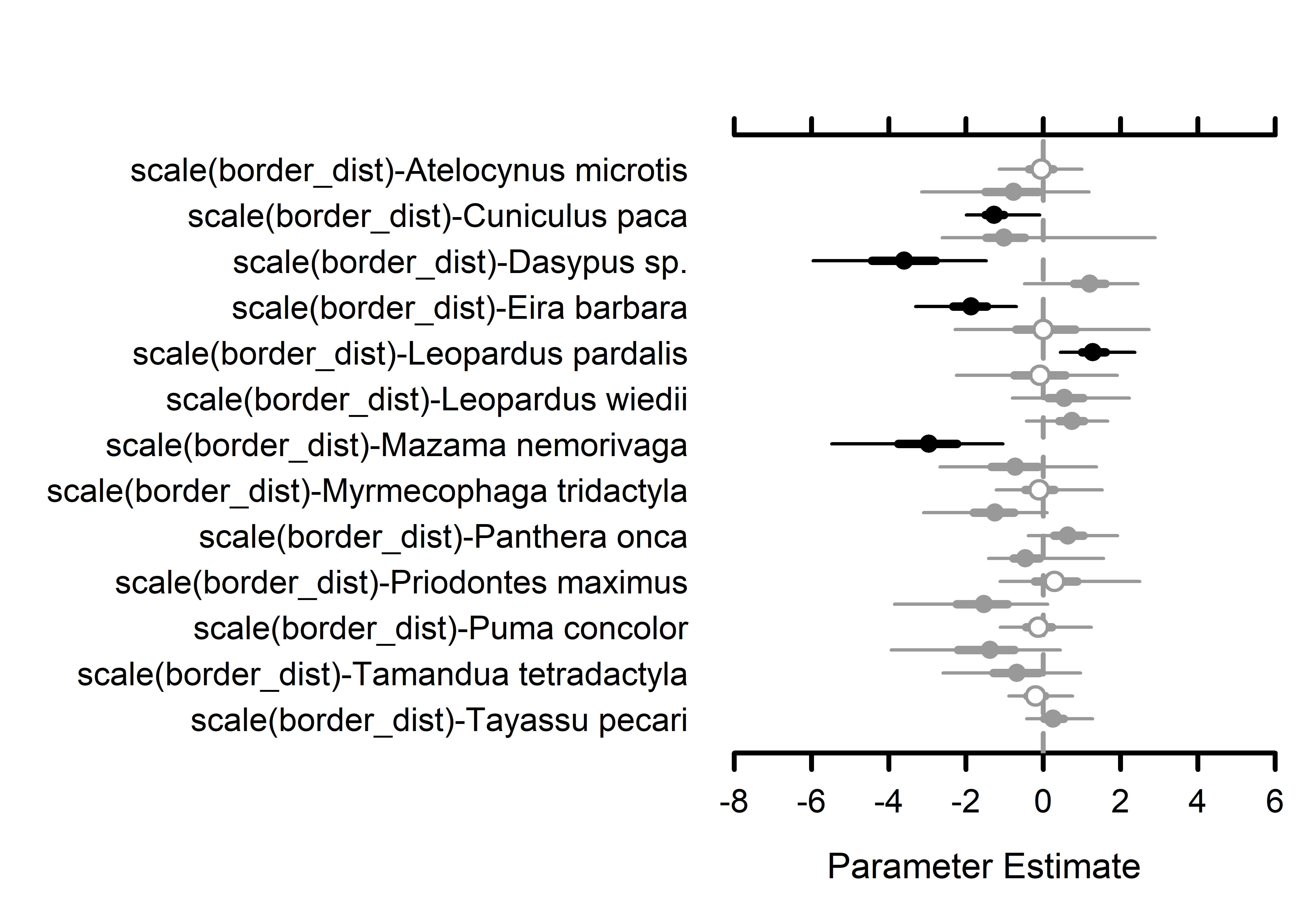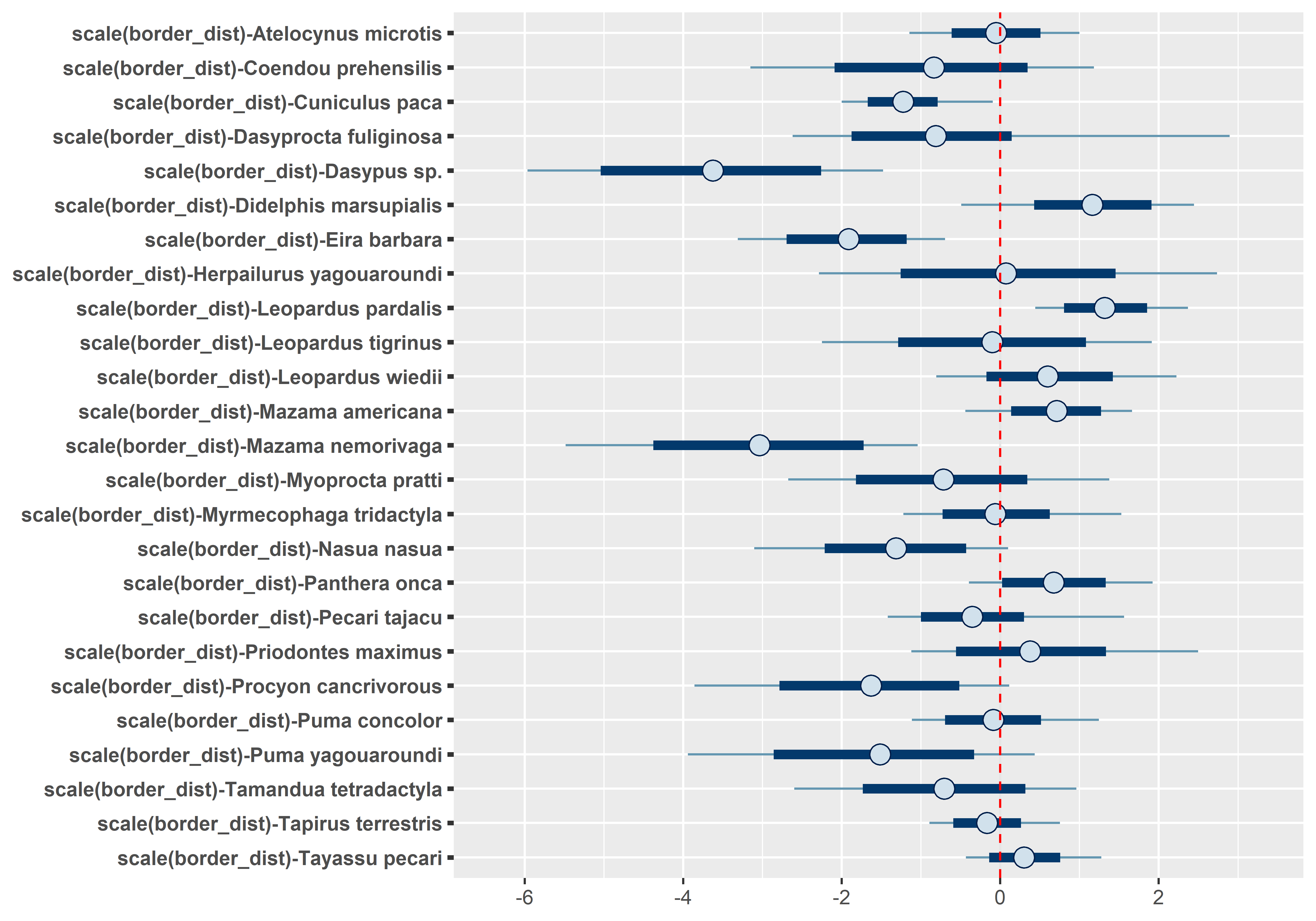 We want to asses the effect of protected areas on the occupancy of the species. We hypothesize that several mammal species have benefited of the conservation actions provided by protected areas, so we expect a decreases in occupancy from the interior of the protected area to the exterior as a function of the distance to the protected area border.