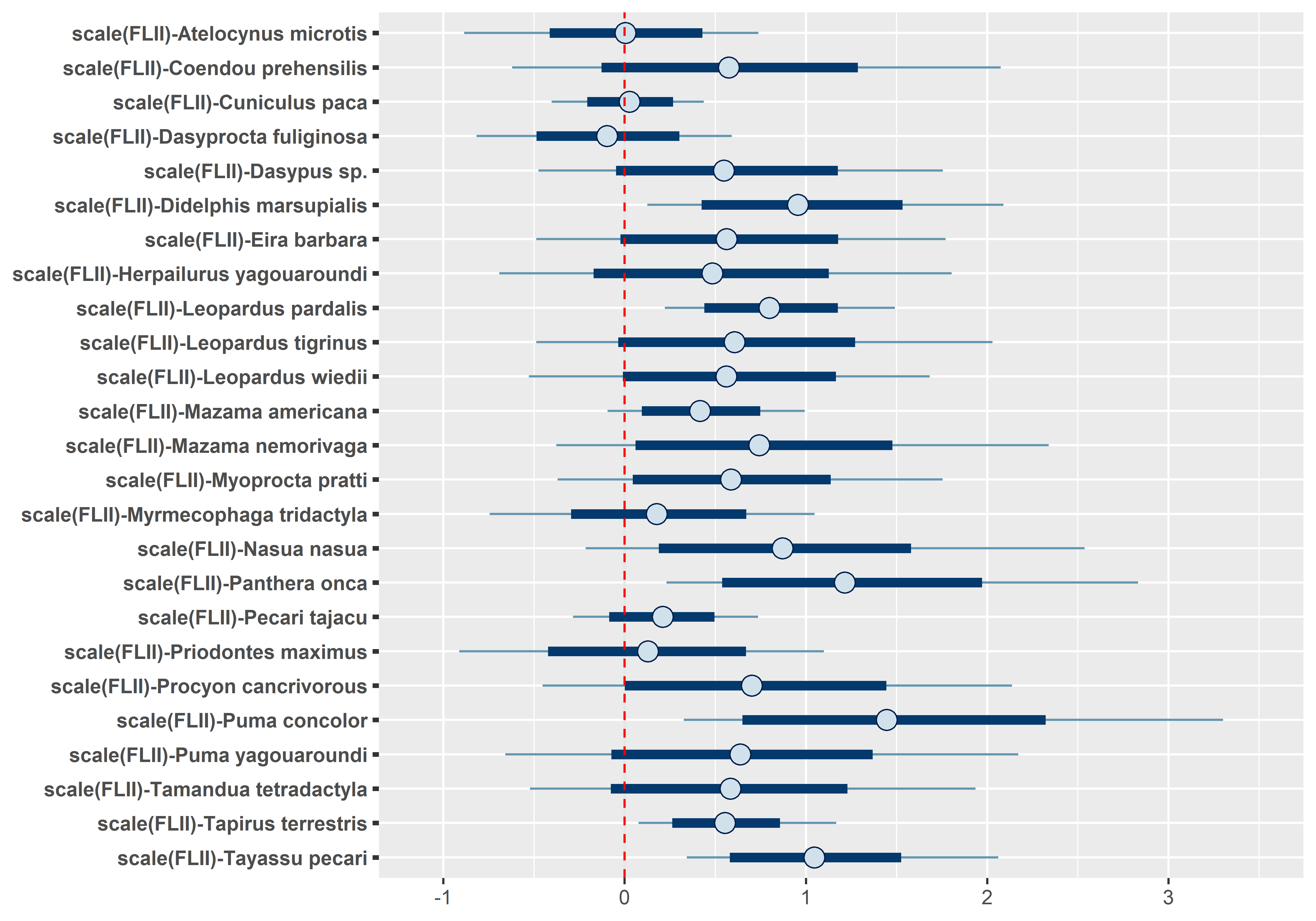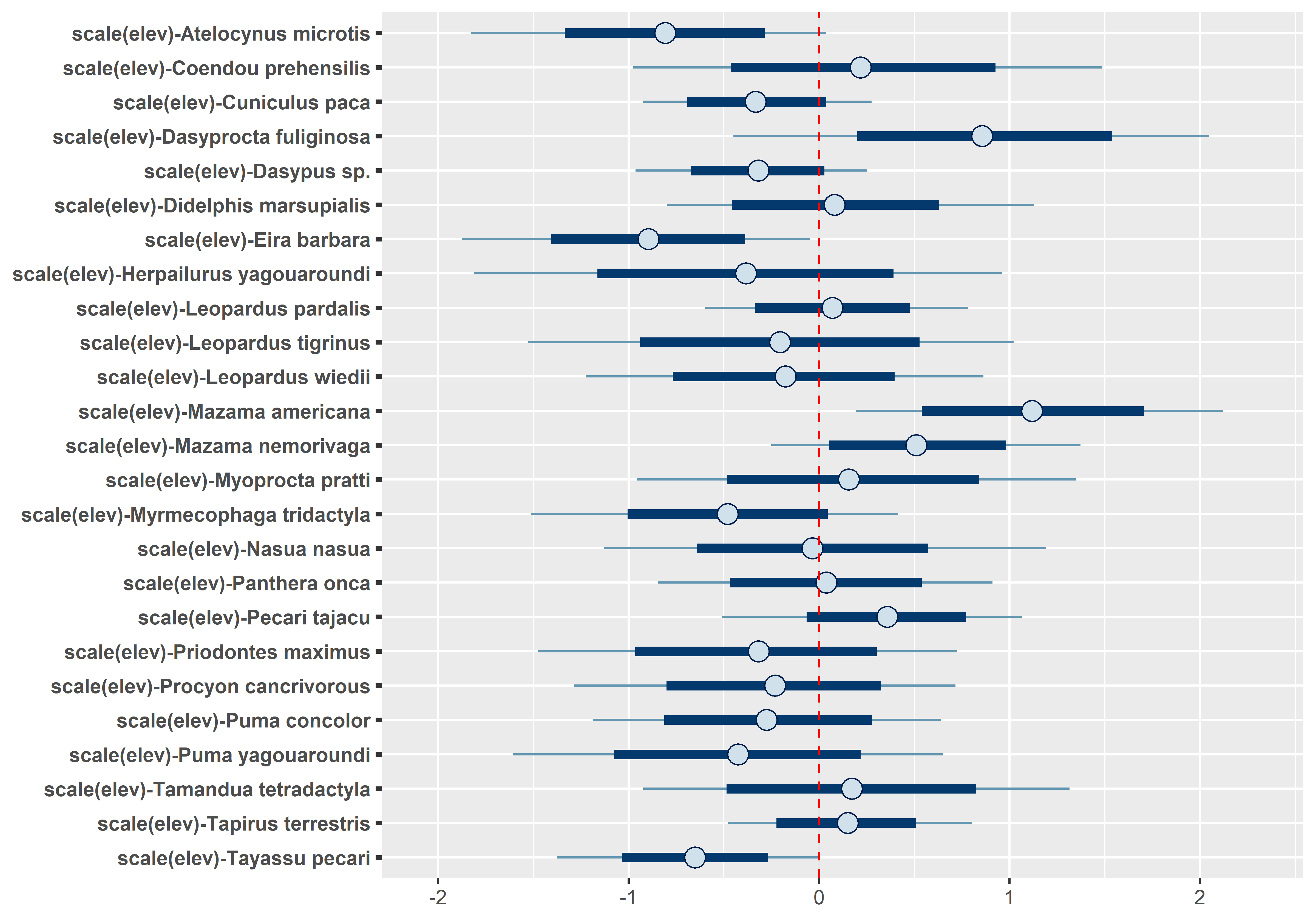 # Occupancy species-level effects MCMCplot(out.sp$beta.samples[,26:50], ref_ovl =TRUE, ci =c(50, 95))# Occupancy species-level effects MCMCplot(out.sp$beta.samples[,51:75], ref_ovl =TRUE, ci =c(50, 95))