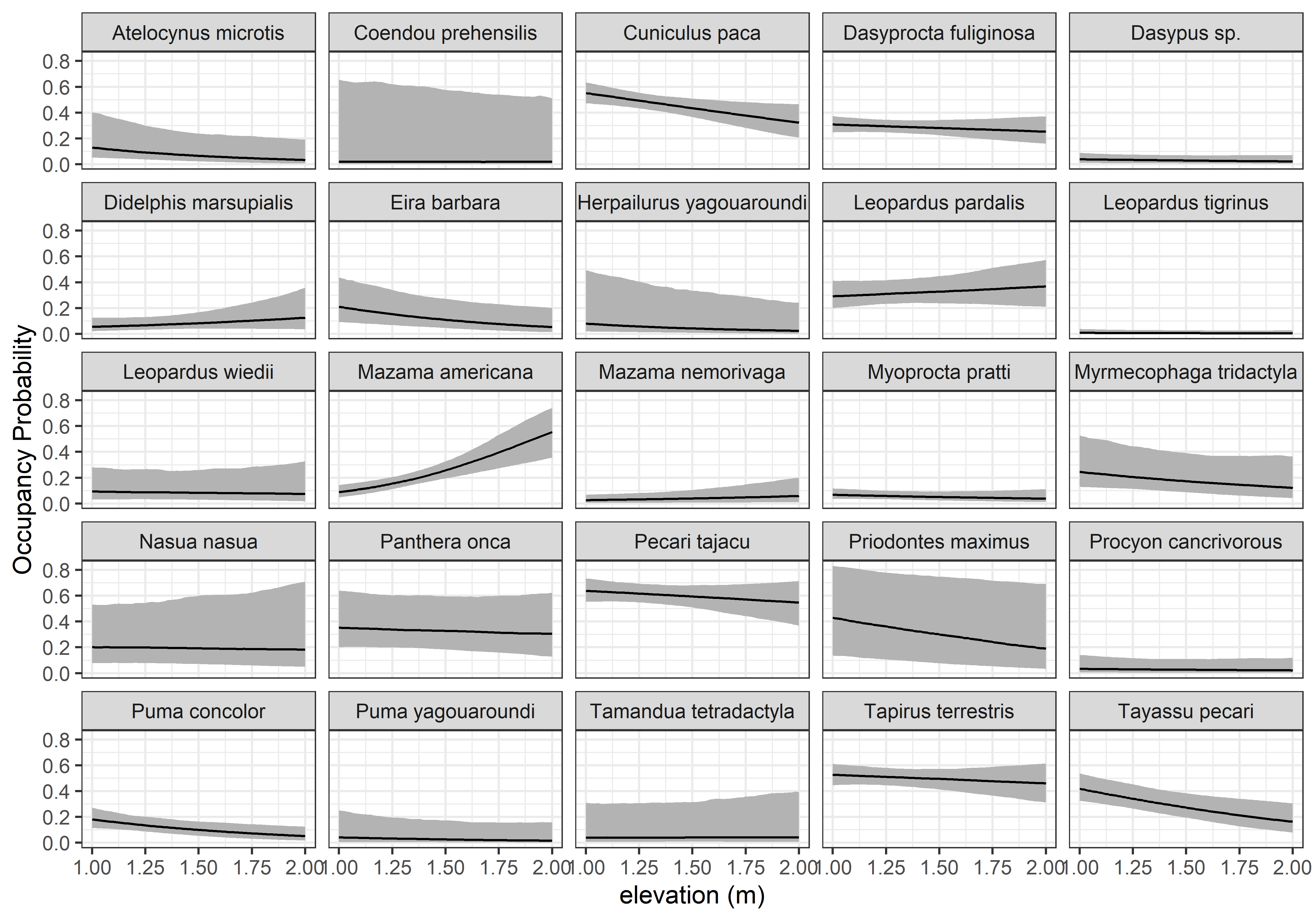 psi.0.quants<-apply(out.pred1$psi.0.samples, c(2, 3), quantile, prob =c(0.025, 0.5, 0.975))sp.codes<-attr(data_list$y, "dimnames")[[1]]psi.plot.dat<-data.frame(psi.med =c(t(psi.0.quants[2, , ])), psi.low =c(t(psi.0.quants[1, , ])), psi.high =c(t(psi.0.quants[3, , ])), elev =elev.pred.vals, sp.codes =rep(sp.codes, each =length(elev.pred.vals)))ggplot(psi.plot.dat, aes(x =elev, y =psi.med))+geom_ribbon(aes(ymin =psi.low, ymax =psi.high), fill ='grey70')+geom_line()+facet_wrap(vars(sp.codes))+theme_bw()+labs(x ='elevation (m)', y ='Occupancy Probability')