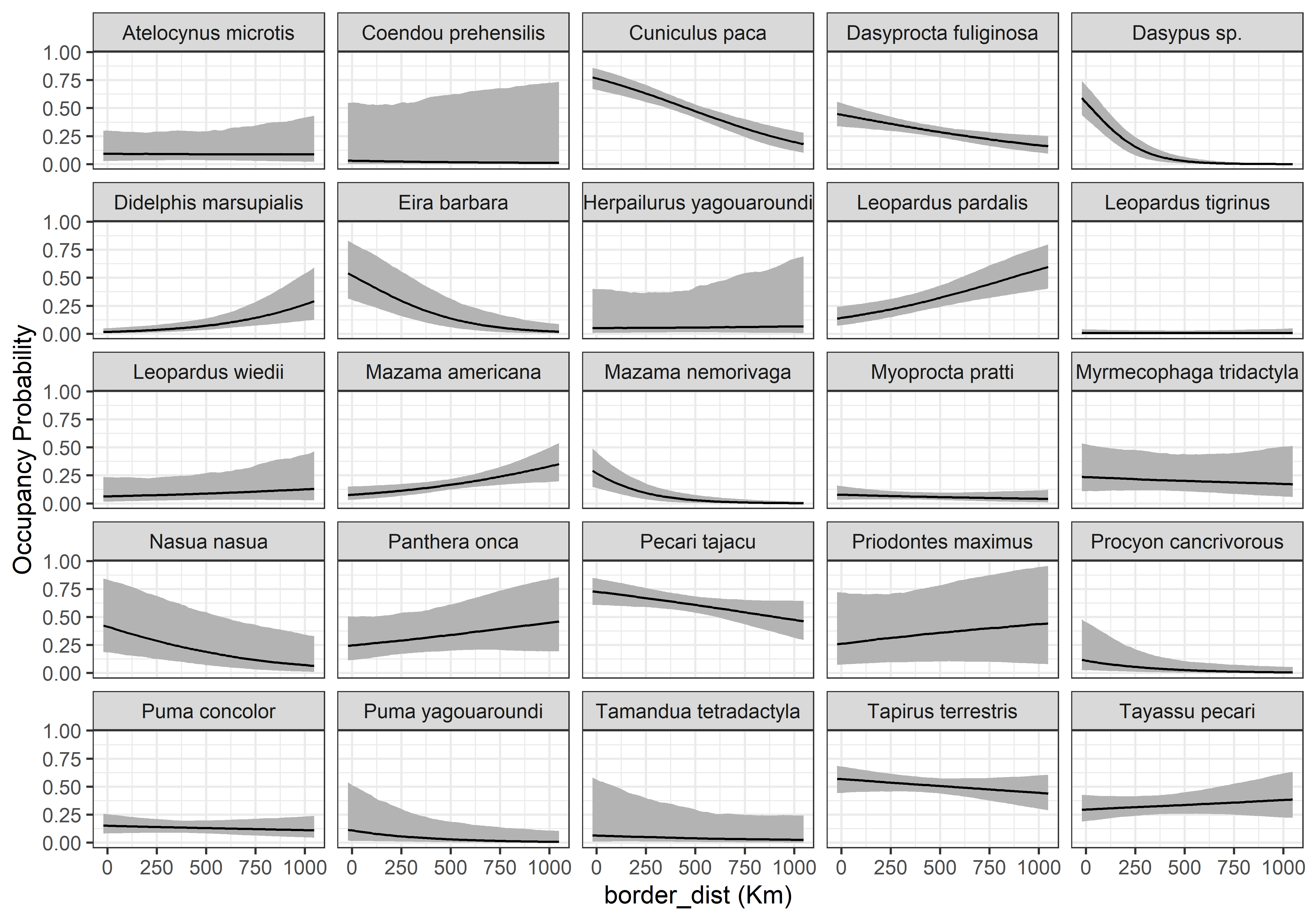 psi.0.quants<-apply(out.pred2$psi.0.samples, c(2, 3), quantile, prob =c(0.025, 0.5, 0.975))sp.codes<-attr(data_list$y, "dimnames")[[1]]psi.plot.dat<-data.frame(psi.med =c(t(psi.0.quants[2, , ])), psi.low =c(t(psi.0.quants[1, , ])), psi.high =c(t(psi.0.quants[3, , ])), border_dist =border_dist.pred.vals, sp.codes =rep(sp.codes, each =length(border_dist.pred.vals)))ggplot(psi.plot.dat, aes(x =border_dist/1000, y =psi.med))+geom_ribbon(aes(ymin =psi.low, ymax =psi.high), fill ='grey70')+geom_line()+facet_wrap(vars(sp.codes))+theme_bw()+labs(x ='border_dist (Km)', y ='Occupancy Probability')