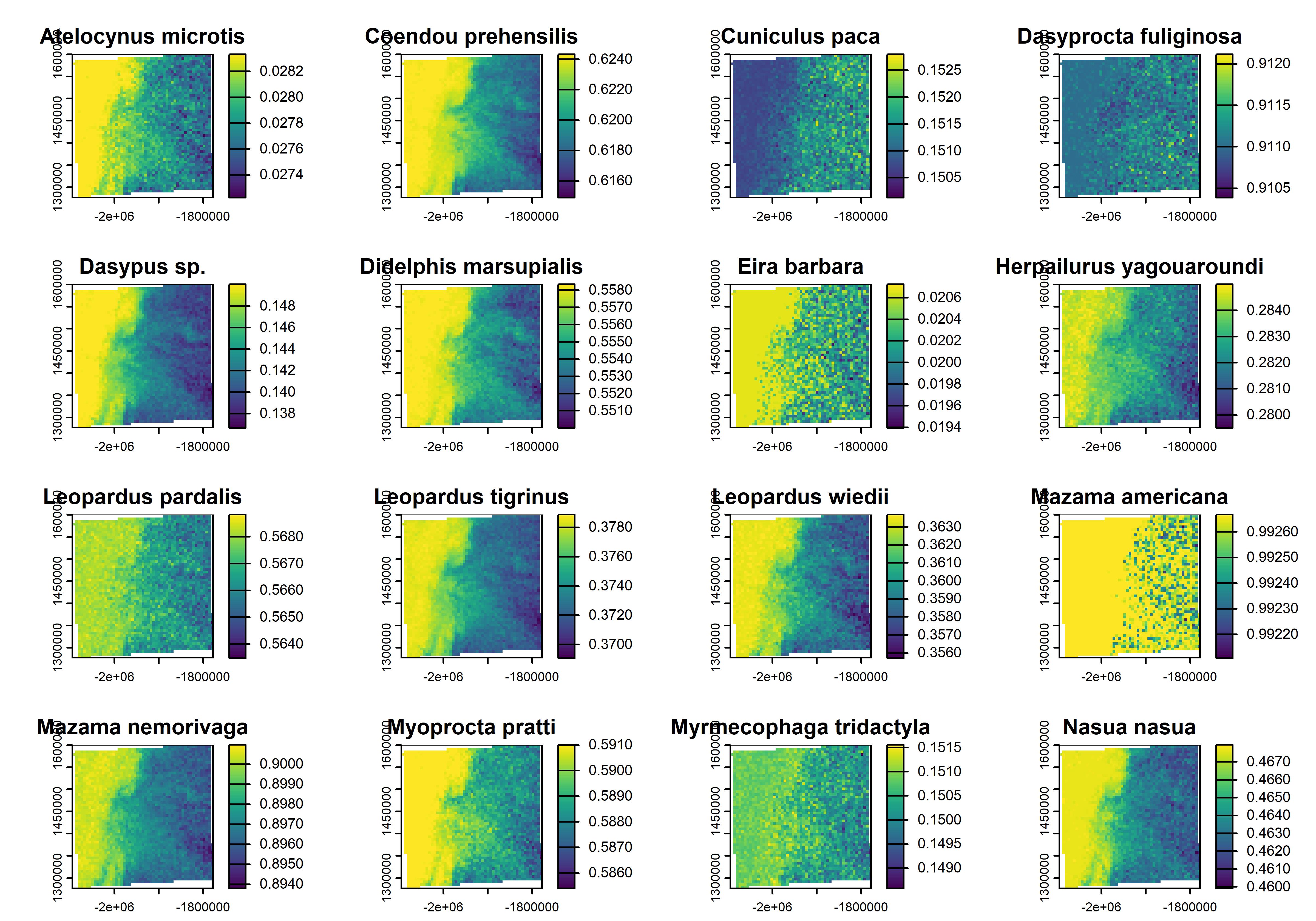 aresult=(plyr::aaply(predicted_array, # mean fo all iterationsc(2,3), mean))################################################## Loop to make rasters and put in a list# array order: itera=3000, sp=22, pixels=5202for(iin1:dim(predicted_array)[2]){# Convert array slice to data frame# df_plot[i] <- as.data.frame(predicted_array[1, i, ]) # sp_i# df_plot[i] <- as.vector(aresult[i,]) # Extract sp# Producing an SDM for all (posterior mean)plot.dat<-data.frame(x =df_coords$X, y =df_coords$Y, psi.sp =as.vector(aresult[i,]))pred_rast<-rast(plot.dat, type ="xyz", crs ="EPSG:10603")# Replace EPSG:4326 with your CRSpredicted_raster_list[[i]]<-pred_rast}# Convert the list to a SpatRaster stackpredictad_raster_stack<-rast(predicted_raster_list)# put species namesnames(predictad_raster_stack)<-selected.spplot(predictad_raster_stack)
