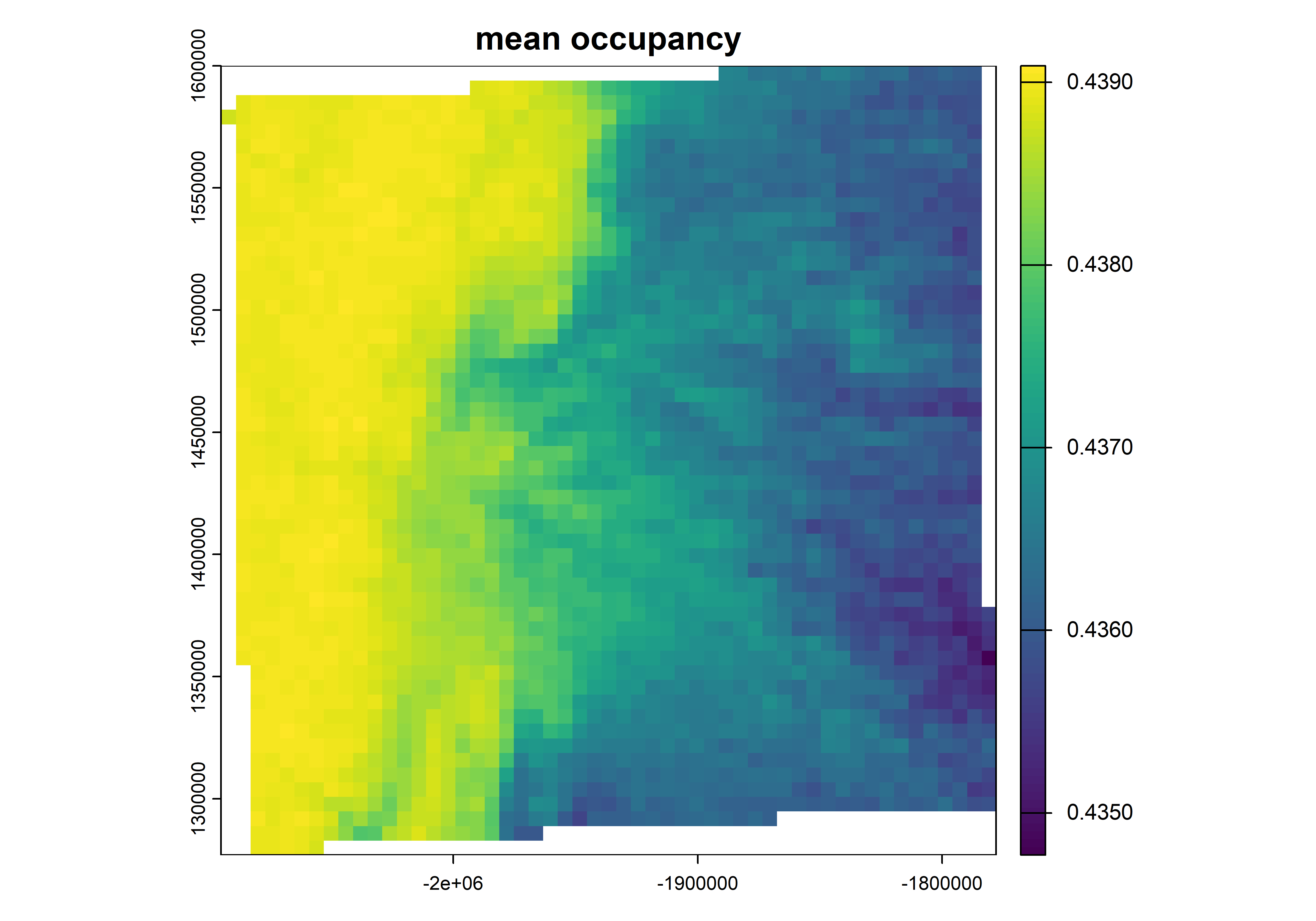 # get the meanpredicted_mean<-mean(predictad_raster_stack)plot(predicted_mean, main="mean occupancy")