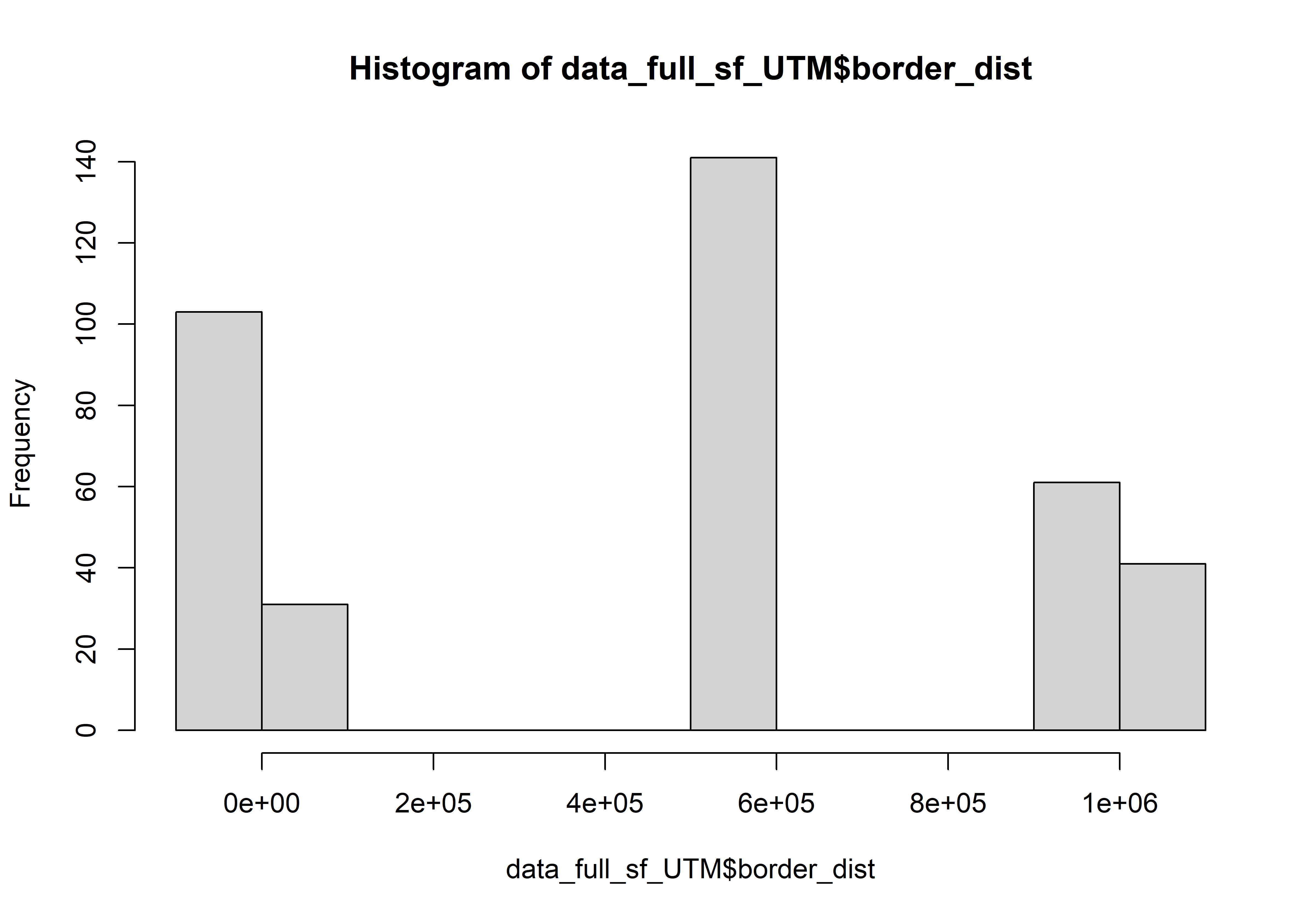 # Replace all NAs with min flii in a numeric columndata_full_sf$FLII[is.na(data_full_sf$FLII)]<-min(data_full_sf$FLII, na.rm =TRUE)# mapview(full_sites_14_15_16_sf, zcol = "in_AP", burst = TRUE)# Transform coord to Lambert Azimuthal Equal-Areadata_full_sf_UTM<-st_transform(data_full_sf, "EPSG:10603")coords<-st_coordinates(data_full_sf_UTM)#str(coords)#### fix duplicated coord# -1840583.53296873 en x# -1842515.36969736 en x# 1547741.44311964 en y# 1541202.24796904 en y# which(coords[,1]=="-1840583.53296873")# which(coords[,1]=="-1842515.36969736")# which(coords[,2]=="1547741.44311964")# which(coords[,2]=="1541202.24796904")# make Ecu_14_15_16 an sf object# cam_sf <- st_as_sf(Ecu_14_15_16, coords = c("lon","lat")) #crs="EPSG:4326")#--- set CRS ---## st_crs(cam_sf) <- 4326# Calculate the distance#multiplic <- full_sites_14_15_16_sf_UTM |> mutate(multiplic= as.numeric(in_AP)) multiplic=ifelse(data_full_sf_UTM$in_AP=="TRUE",-1,1)data_full_sf_UTM$border_dist<-as.numeric(st_distance(data_full_sf_UTM, AP_Tahuayo_UTM_line)*multiplic)# print(border_dist)# convert true false to inside 1, outside 0data_full_sf_UTM<-data_full_sf_UTM|>mutate(in_AP =case_when(str_detect(in_AP, "TRUE")~1, # "inside_AP",str_detect(in_AP, "FALSE")~0#"outside_AP"))|>mutate(in_AP=as.factor(in_AP))hist(data_full_sf_UTM$border_dist)