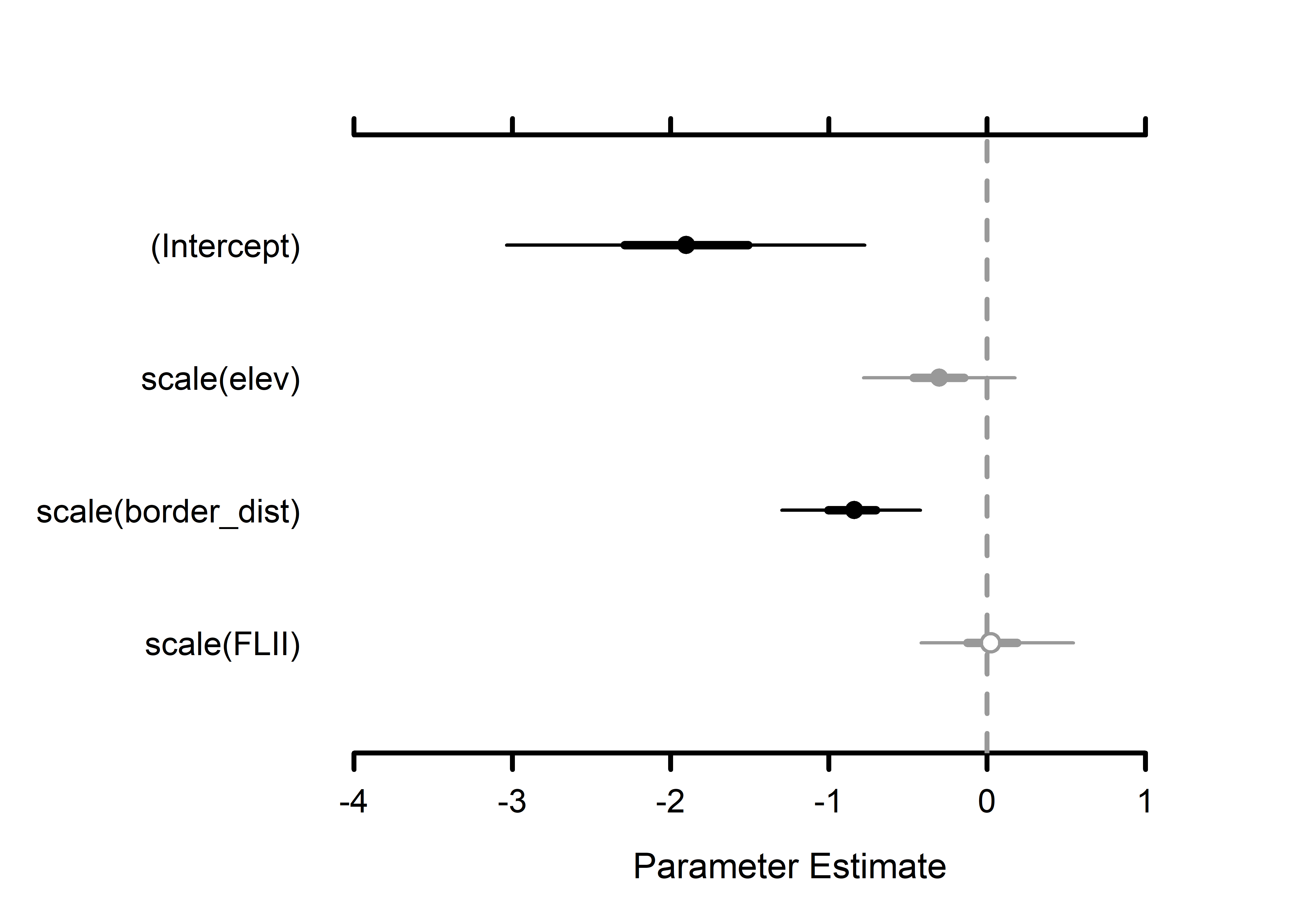 # 6. Prediction -----------------------------------------------------------# Predict occupancy along a gradient of elev # Create a set of values across the range of observed elev valueselev.pred.vals<-seq(min(data_list$occ.covs$elev), max(data_list$occ.covs$elev), length.out =100)# Scale predicted values by mean and standard deviation used to fit the modelelev.pred.vals.scale<-(elev.pred.vals-mean(data_list$occ.covs$elev))/sd(data_list$occ.covs$elev)# Create a set of values across the range of observed elev valuesborder_dist.pred.vals<-seq(min(data_list$occ.covs$border_dist), max(data_list$occ.covs$border_dist), length.out =100)# Scale predicted values by mean and standard deviation used to fit the modelborder_dist.pred.vals.scale<-(border_dist.pred.vals-mean(data_list$occ.covs$border_dist))/sd(data_list$occ.covs$border_dist)# Create a set of values across the range of observed FLII valuesFLII.pred.vals<-seq(min(data_list$occ.covs$FLII), max(data_list$occ.covs$FLII), length.out =100)# Scale predicted values by mean and standard deviation used to fit the modelFLII.pred.vals.scale<-(FLII.pred.vals-mean(data_list$occ.covs$FLII))/sd(data_list$occ.covs$FLII)# Predict occupancy across elev values at mean values of all other variablespred.df1<-as.matrix(data.frame(intercept =1, elev =elev.pred.vals.scale, border_dist =0, FLII=0))#, catchment = 0, density = 0, # slope = 0))# Predict occupancy across elev values at mean values of all other variablespred.df2<-as.matrix(data.frame(intercept =1, elev =0, border_dist =border_dist.pred.vals.scale, FLII=0))#, catchment = 0, density = 0, # slope = 0))# Predict occupancy across elev values at mean values of all other variablespred.df3<-as.matrix(data.frame(intercept =1, elev =0, border_dist =0, FLII=FLII.pred.vals.scale))#, catchment = 0, density = 0, # slope = 0))out.pred1<-predict(out.null, pred.df1)# using non spatialstr(out.pred1)