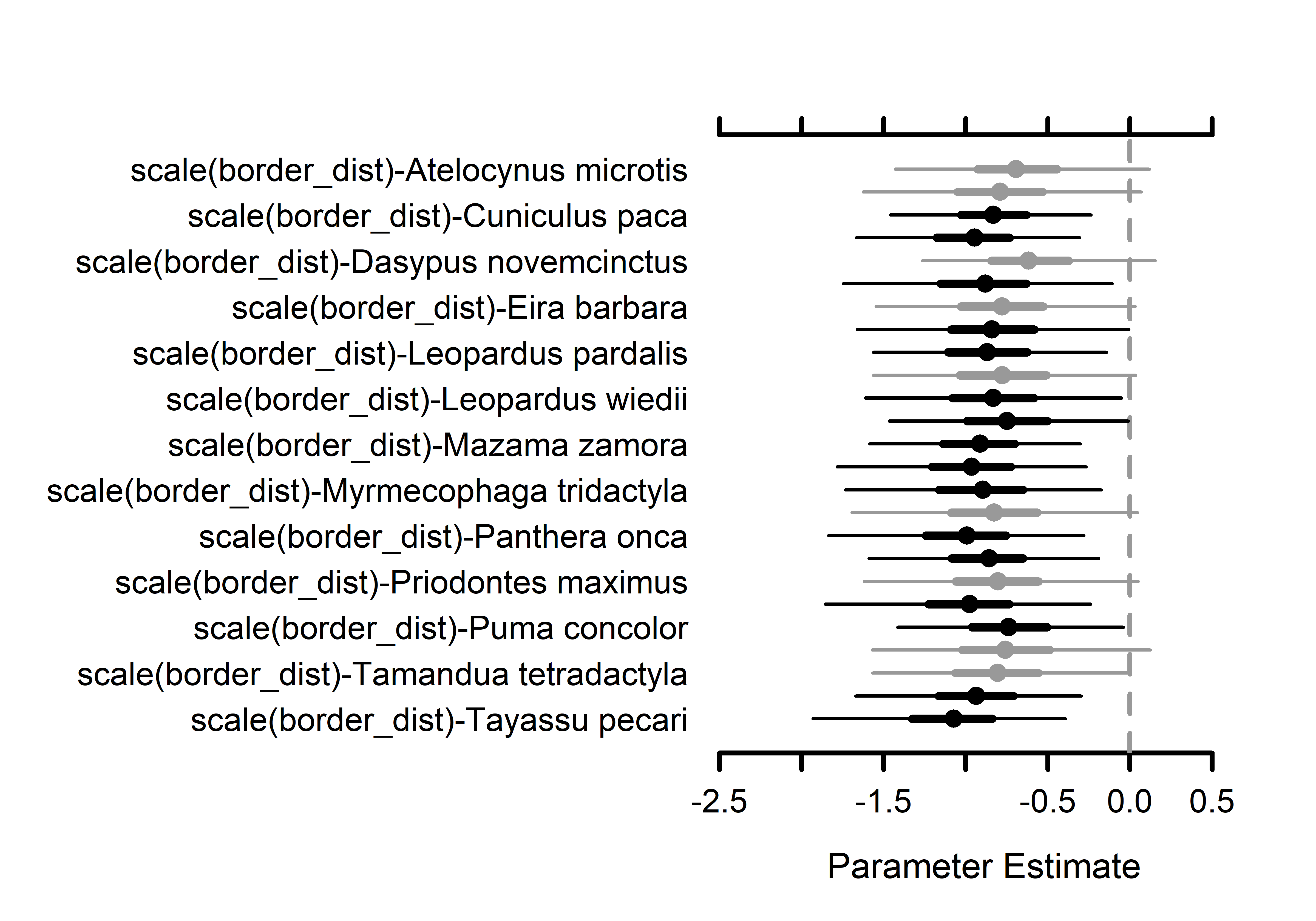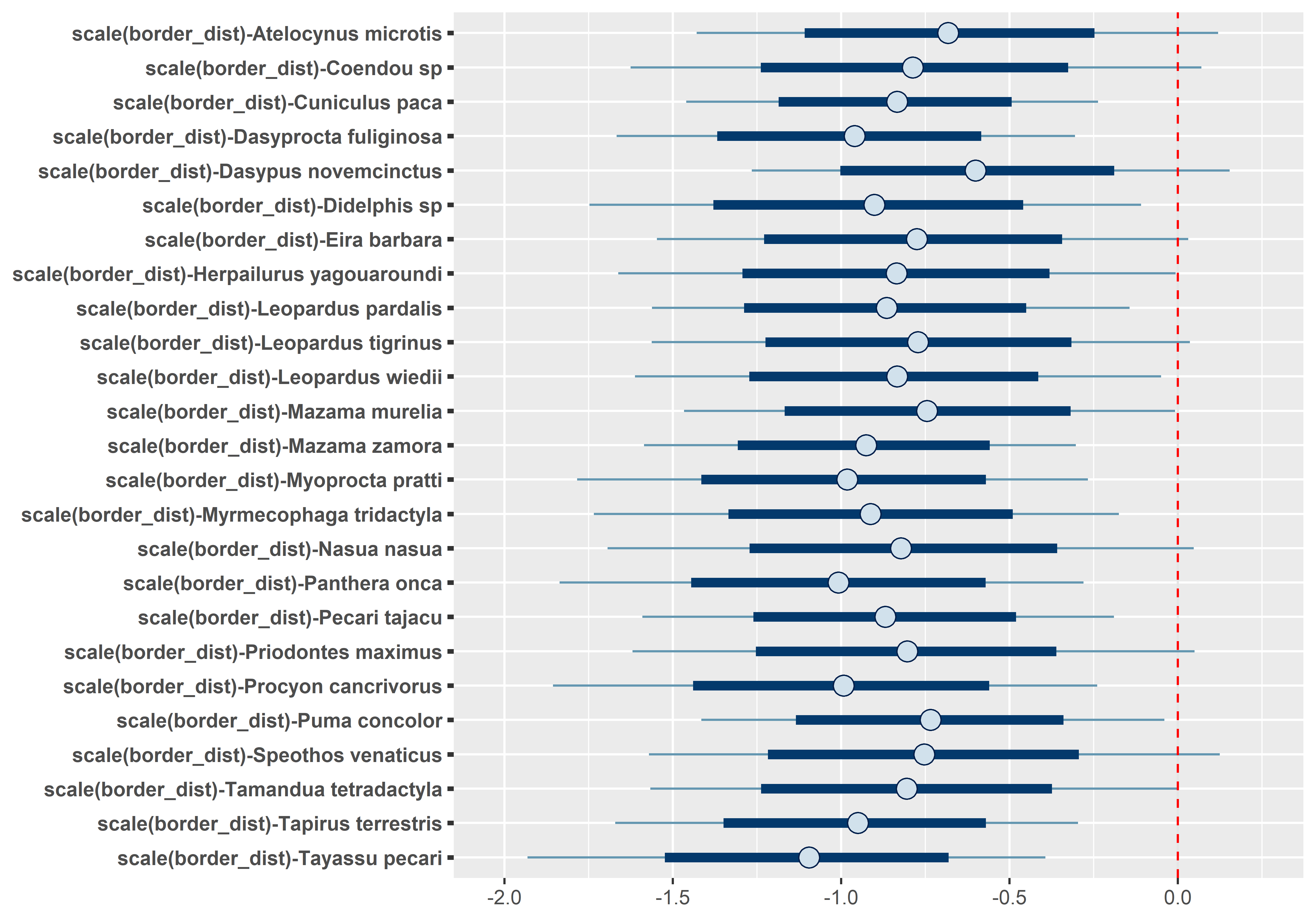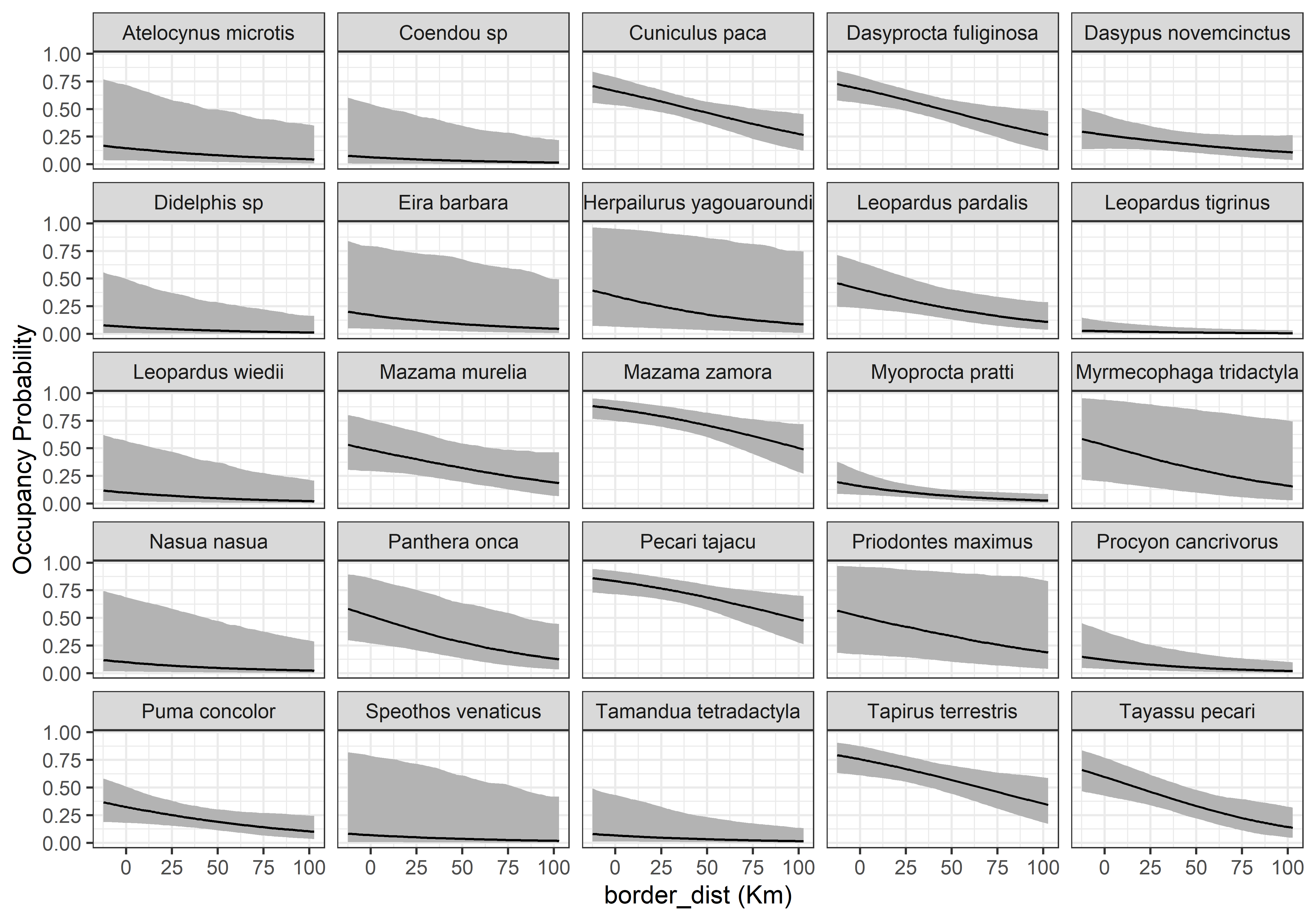 We want to asses the effect of protected areas on the occupancy of the species. We hypothesize that several mammal species have benefited of the conservation actions provided by protected areas, so we expect a decreases in occupancy from the interior of the protected area to the exterior as a function of the distance to the protected area border.