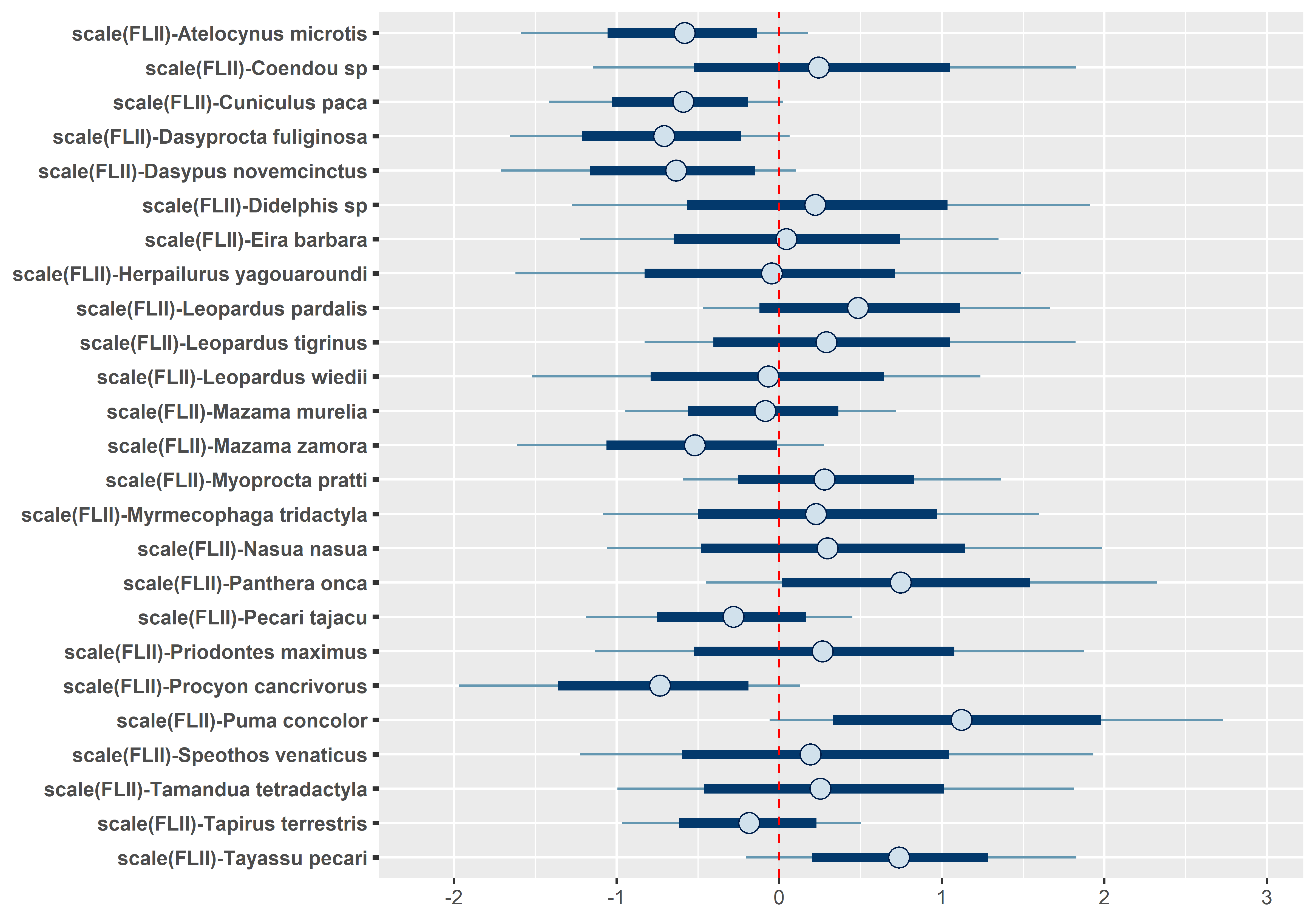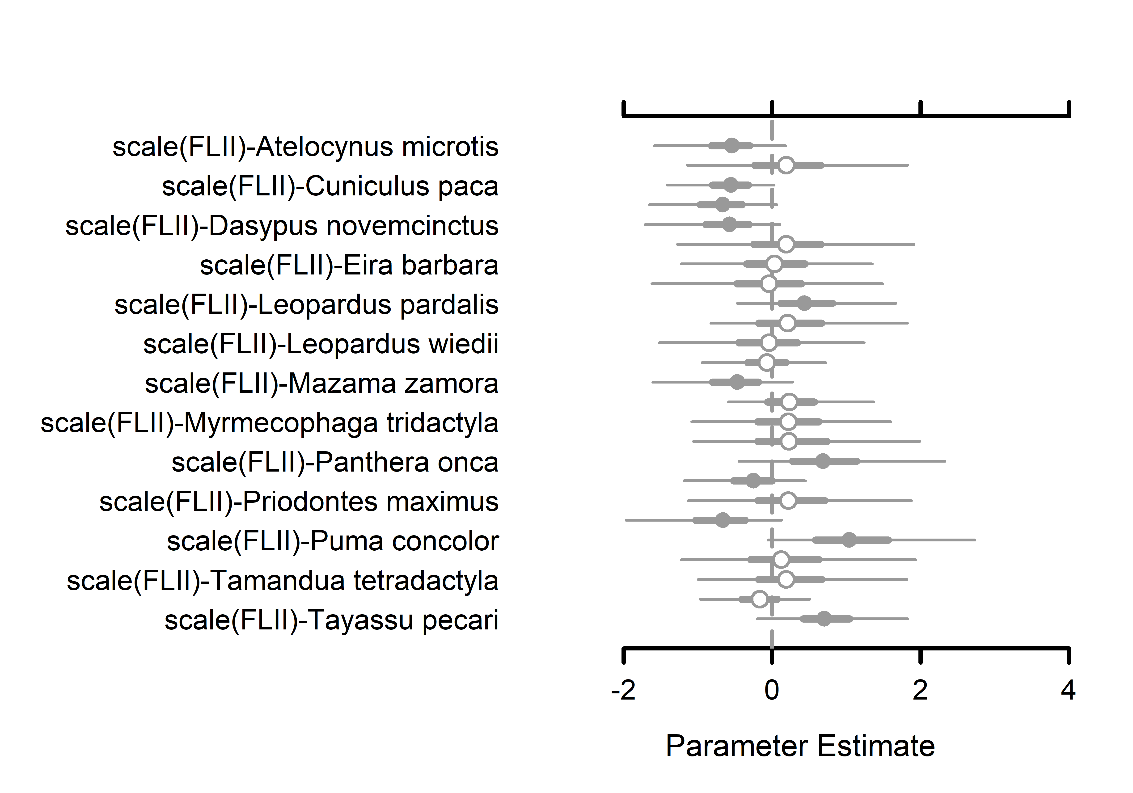 # Running the model# 3. 1 Modelo multi-especie -----------------------------------------# 2. Model fitting --------------------------------------------------------# Fit a non-spatial, multi-species occupancy model. out.null<-msPGOcc(occ.formula =~scale(elev)+scale(border_dist)+scale(FLII) , det.formula =~scale(effort) , # Ordinal.day + I(Ordinal.day^2) + Year data =data_list, n.samples =6000, n.thin =10, n.burn =1000, n.chains =3, n.report =1000);beep(sound =4)