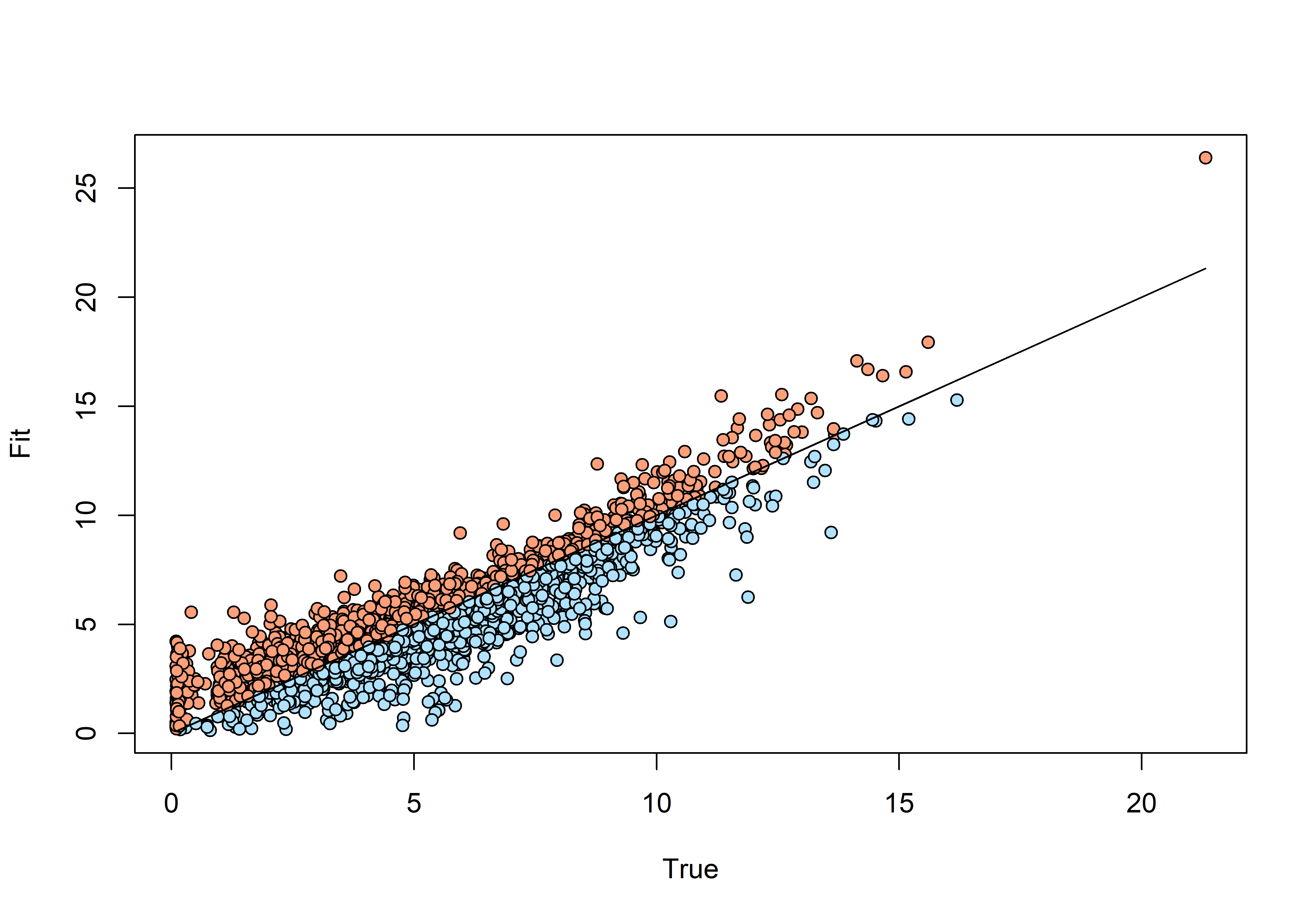 #### fit plotppc.df<-data.frame(fit =ppc.out.sp$fit.y, fit.rep =ppc.out.sp$fit.y.rep, color ='lightskyblue1')ppc.df$color[ppc.df$fit.rep.1>ppc.df$fit.1]<-'lightsalmon'plot(ppc.df$fit.1, ppc.df$fit.rep.1, bg =ppc.df$color, pch =21, ylab ='Fit', xlab ='True')lines(ppc.df$fit.1, ppc.df$fit.1, col ='black')
