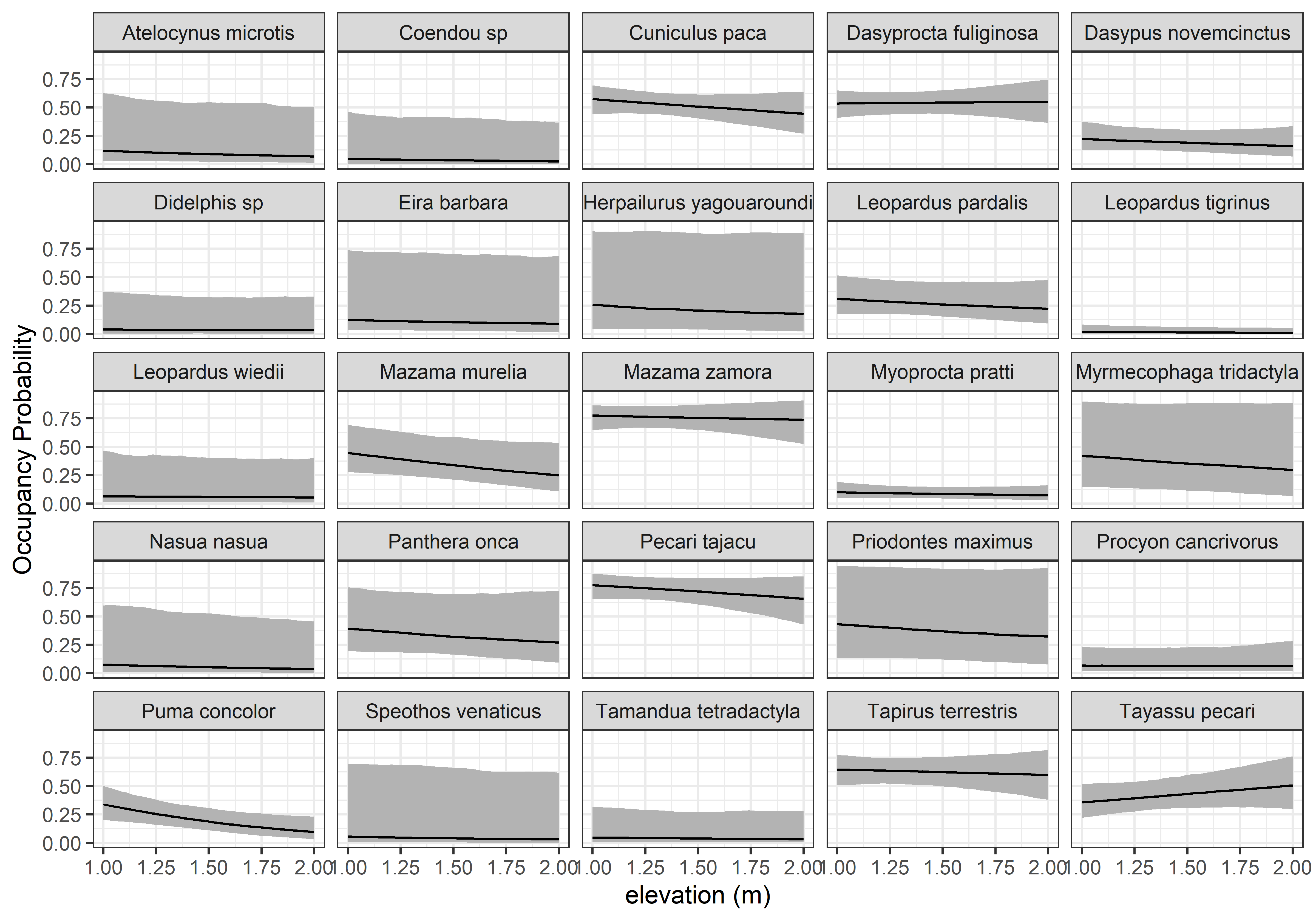 psi.0.quants<-apply(out.pred1$psi.0.samples, c(2, 3), quantile, prob =c(0.025, 0.5, 0.975))sp.codes<-attr(data_list$y, "dimnames")[[1]]psi.plot.dat<-data.frame(psi.med =c(t(psi.0.quants[2, , ])), psi.low =c(t(psi.0.quants[1, , ])), psi.high =c(t(psi.0.quants[3, , ])), elev =elev.pred.vals, sp.codes =rep(sp.codes, each =length(elev.pred.vals)))ggplot(psi.plot.dat, aes(x =elev, y =psi.med))+geom_ribbon(aes(ymin =psi.low, ymax =psi.high), fill ='grey70')+geom_line()+facet_wrap(vars(sp.codes))+theme_bw()+labs(x ='elevation (m)', y ='Occupancy Probability')