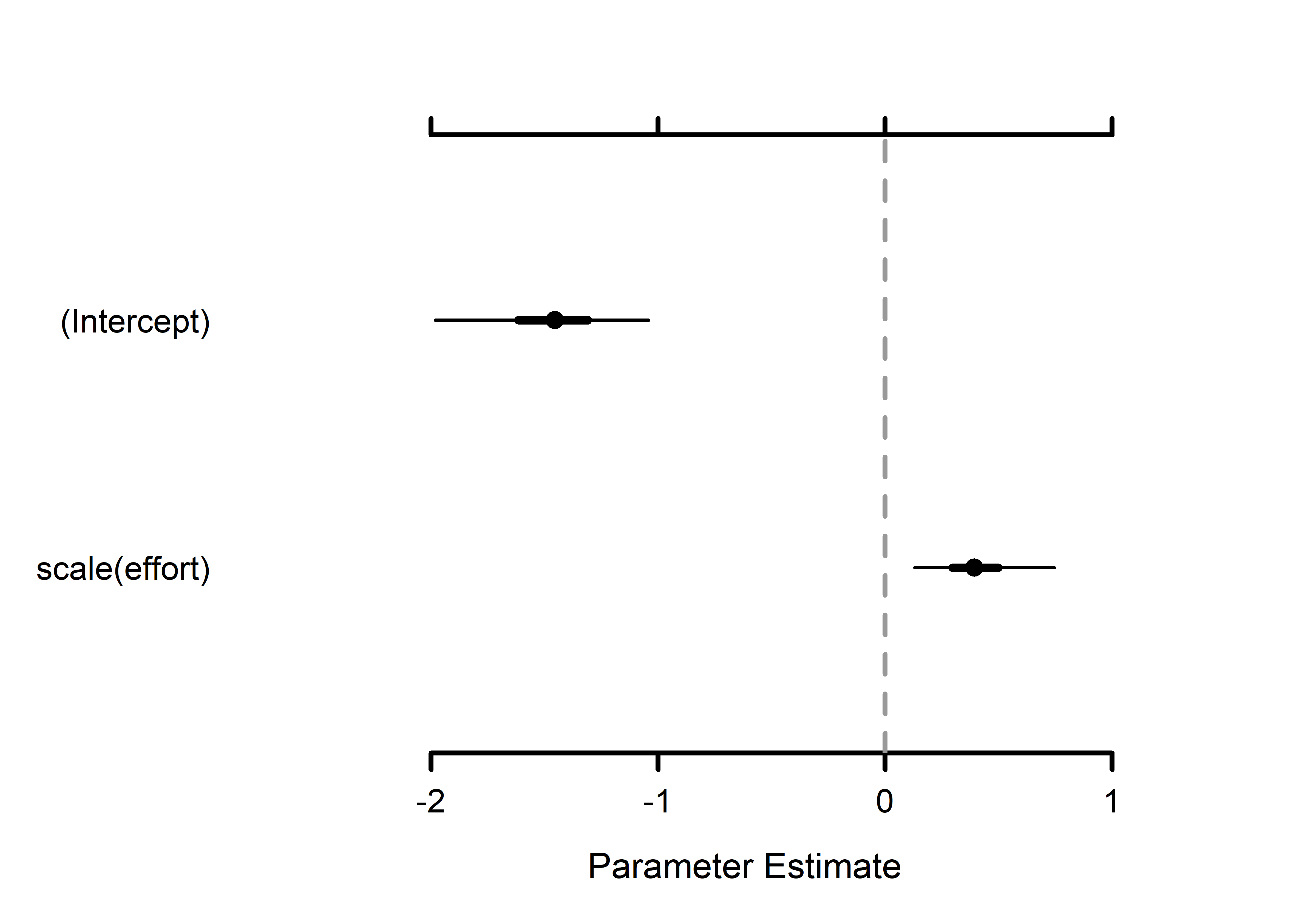 # Create simple plot summaries using MCMCvis package.# Detection covariate effects --------- MCMCplot(out.sp$alpha.comm.samples, ref_ovl =TRUE, ci =c(50, 95))# Occupancy community-level effects MCMCplot(out.sp$beta.comm.samples, ref_ovl =TRUE, ci =c(50, 95))