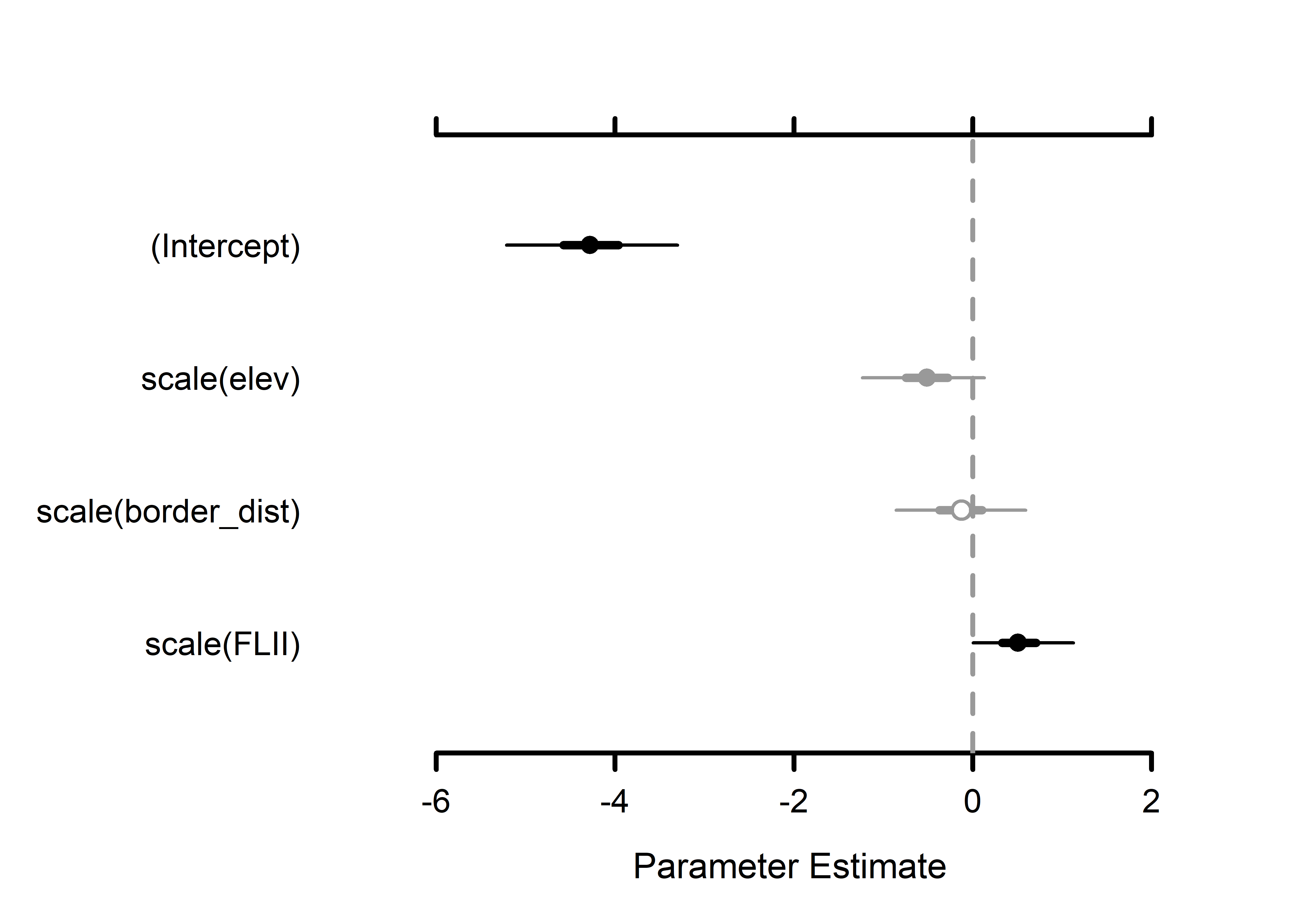 # 6. Prediction -----------------------------------------------------------# Predict occupancy along a gradient of elev # Create a set of values across the range of observed elev valueselev.pred.vals<-seq(min(data_list$occ.covs$elev), max(data_list$occ.covs$elev), length.out =100)# Scale predicted values by mean and standard deviation used to fit the modelelev.pred.vals.scale<-(elev.pred.vals-mean(data_list$occ.covs$elev))/sd(data_list$occ.covs$elev)# Create a set of values across the range of observed elev valuesborder_dist.pred.vals<-seq(min(data_list$occ.covs$border_dist), max(data_list$occ.covs$border_dist), length.out =100)# Scale predicted values by mean and standard deviation used to fit the modelborder_dist.pred.vals.scale<-(border_dist.pred.vals-mean(data_list$occ.covs$border_dist))/sd(data_list$occ.covs$border_dist)# Create a set of values across the range of observed FLII valuesFLII.pred.vals<-seq(min(data_list$occ.covs$FLII), max(data_list$occ.covs$FLII), length.out =100)# Scale predicted values by mean and standard deviation used to fit the modelFLII.pred.vals.scale<-(FLII.pred.vals-mean(data_list$occ.covs$FLII))/sd(data_list$occ.covs$FLII)# Predict occupancy across elev values at mean values of all other variablespred.df1<-as.matrix(data.frame(intercept =1, elev =elev.pred.vals.scale, border_dist =0, FLII=0))#, catchment = 0, density = 0, # slope = 0))# Predict occupancy across elev values at mean values of all other variablespred.df2<-as.matrix(data.frame(intercept =1, elev =0, border_dist =border_dist.pred.vals.scale, FLII=0))#, catchment = 0, density = 0, # slope = 0))# Predict occupancy across elev values at mean values of all other variablespred.df3<-as.matrix(data.frame(intercept =1, elev =0, border_dist =0, FLII=FLII.pred.vals.scale))#, catchment = 0, density = 0, # slope = 0))out.pred1<-predict(out.null, pred.df1)# using non spatialstr(out.pred1)