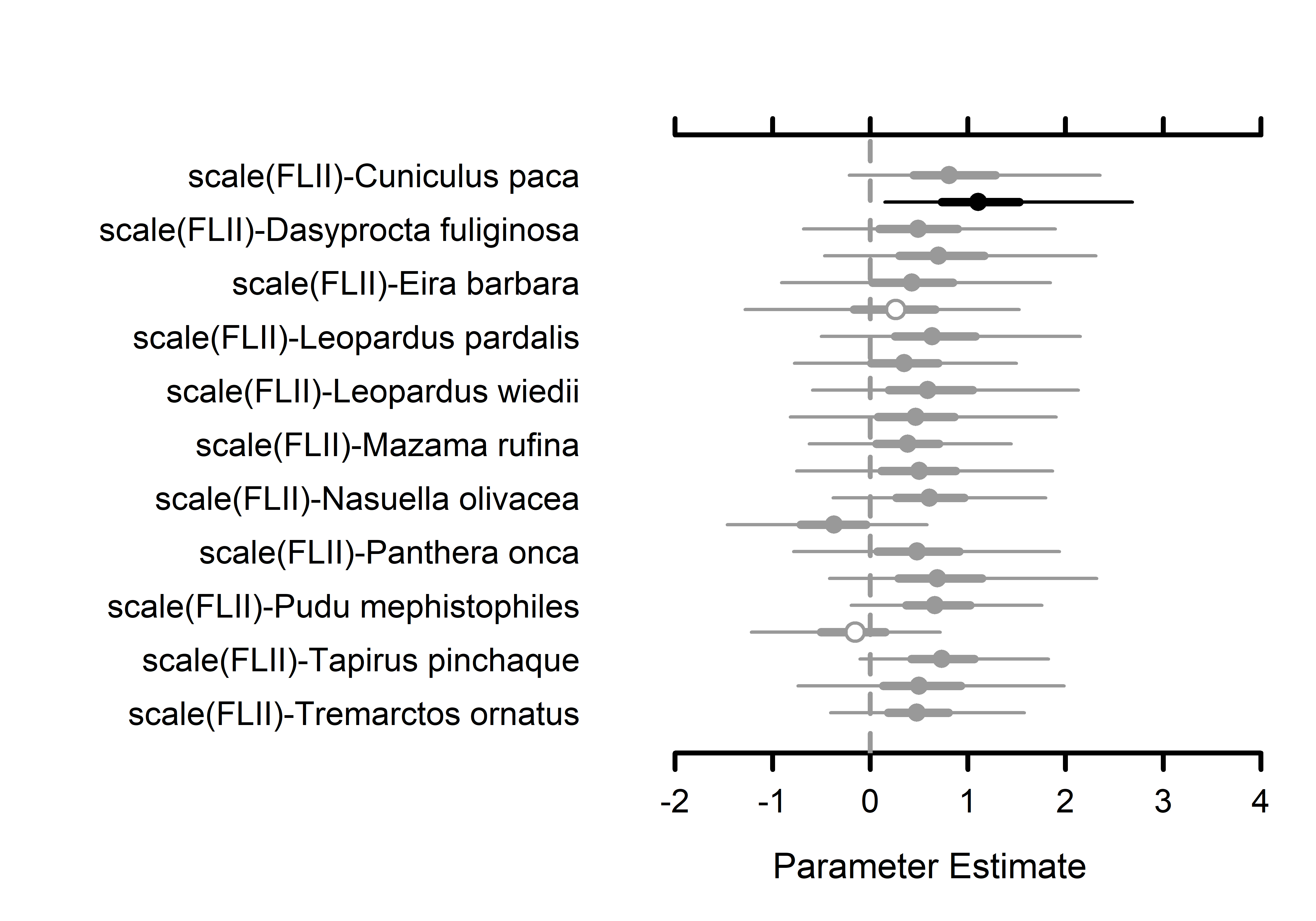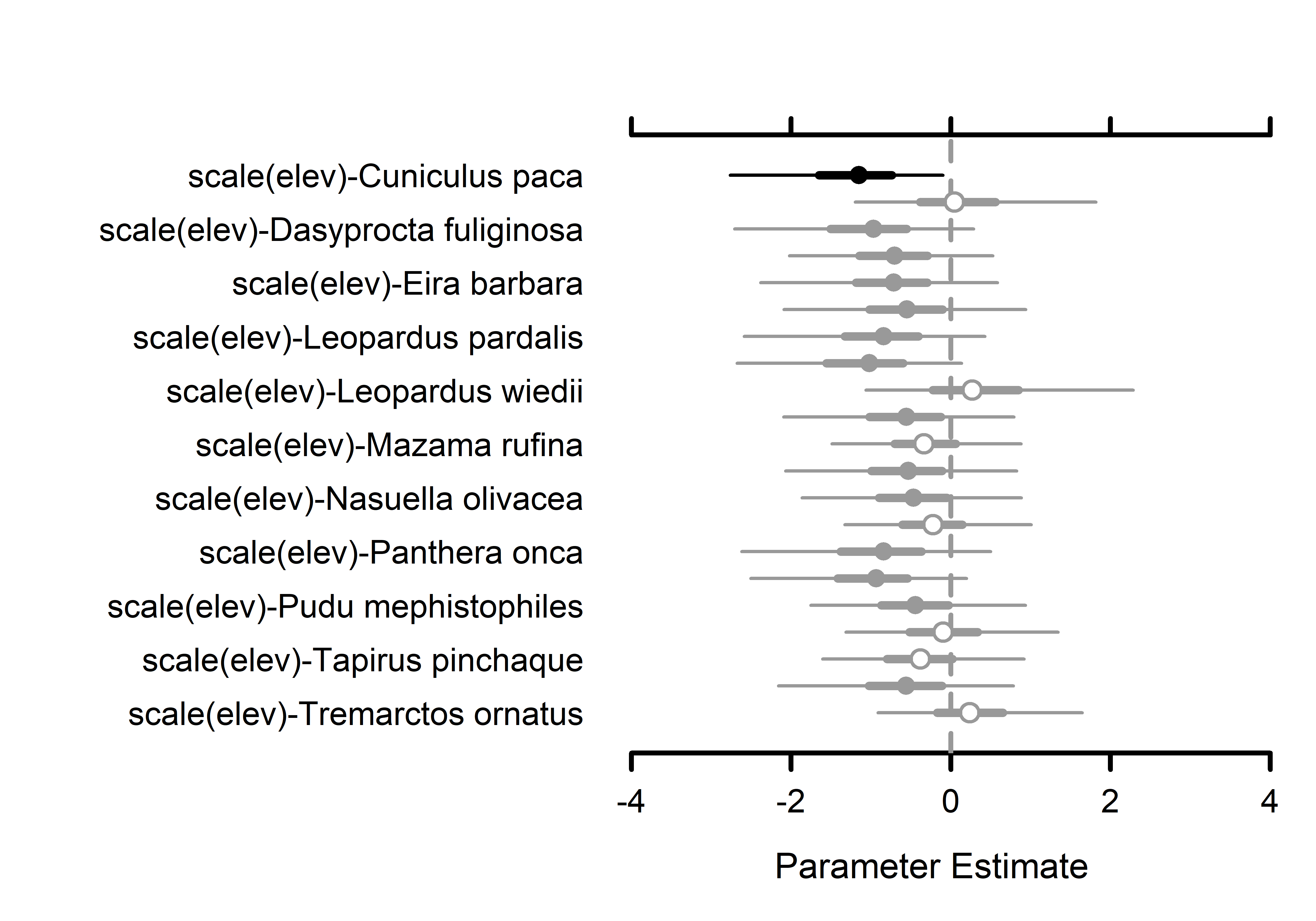 # Running the model# 3. 1 Modelo multi-especie -----------------------------------------# 2. Model fitting --------------------------------------------------------# Fit a non-spatial, multi-species occupancy model. out.null<-msPGOcc(occ.formula =~scale(elev)+scale(border_dist)+scale(FLII) , det.formula =~scale(effort) , # Ordinal.day + I(Ordinal.day^2) + Year data =data_list, n.samples =6000, n.thin =10, n.burn =1000, n.chains =3, n.report =1000);beep(sound =4)