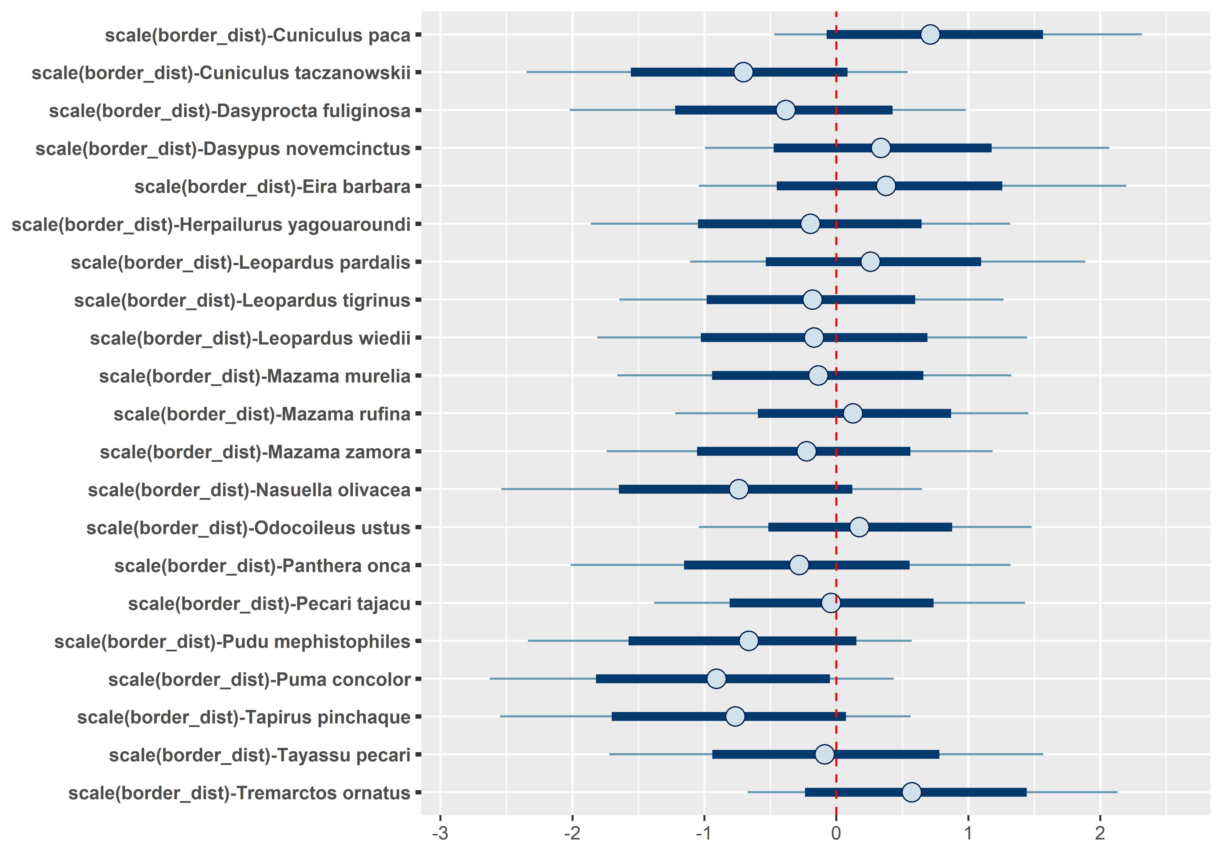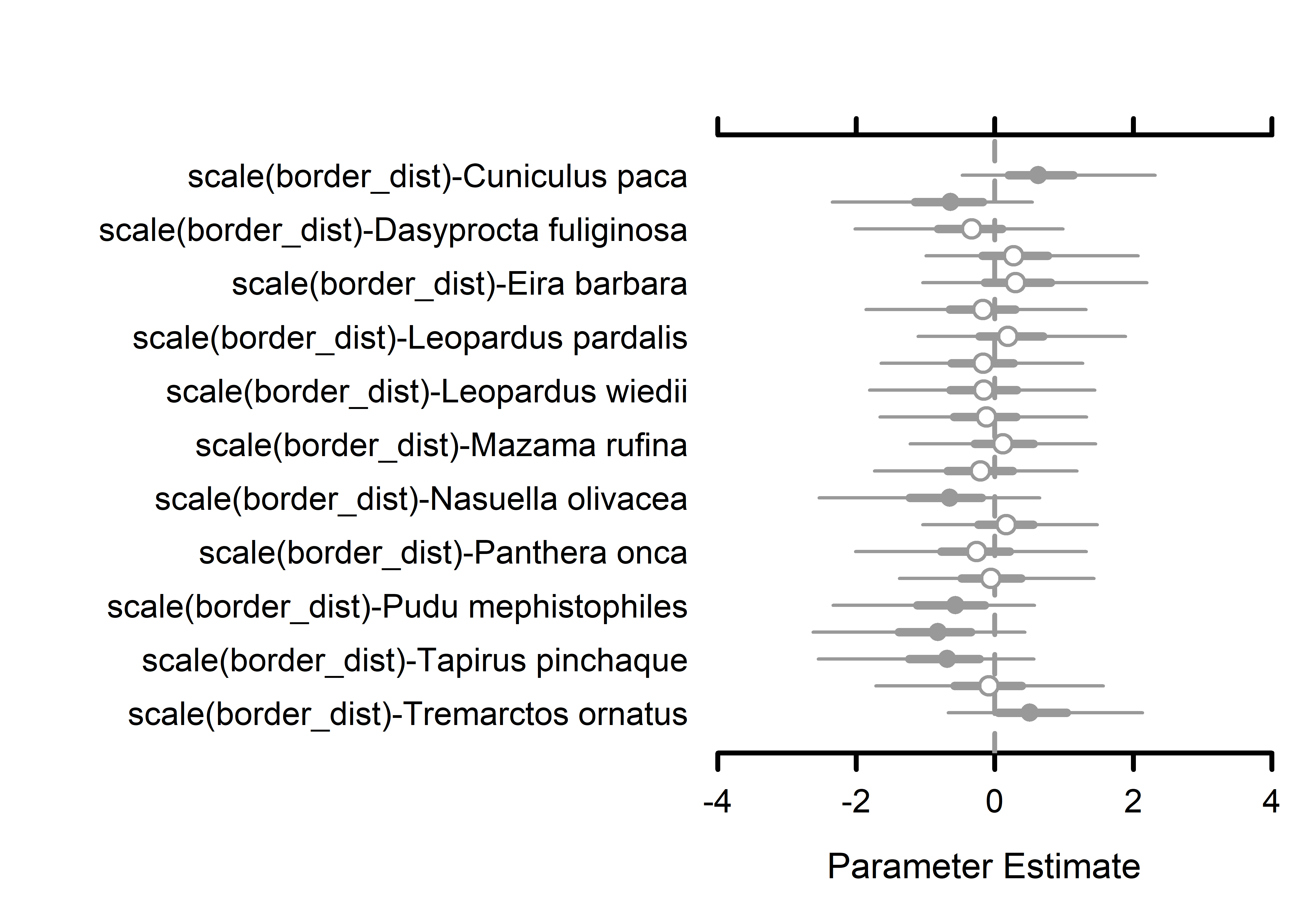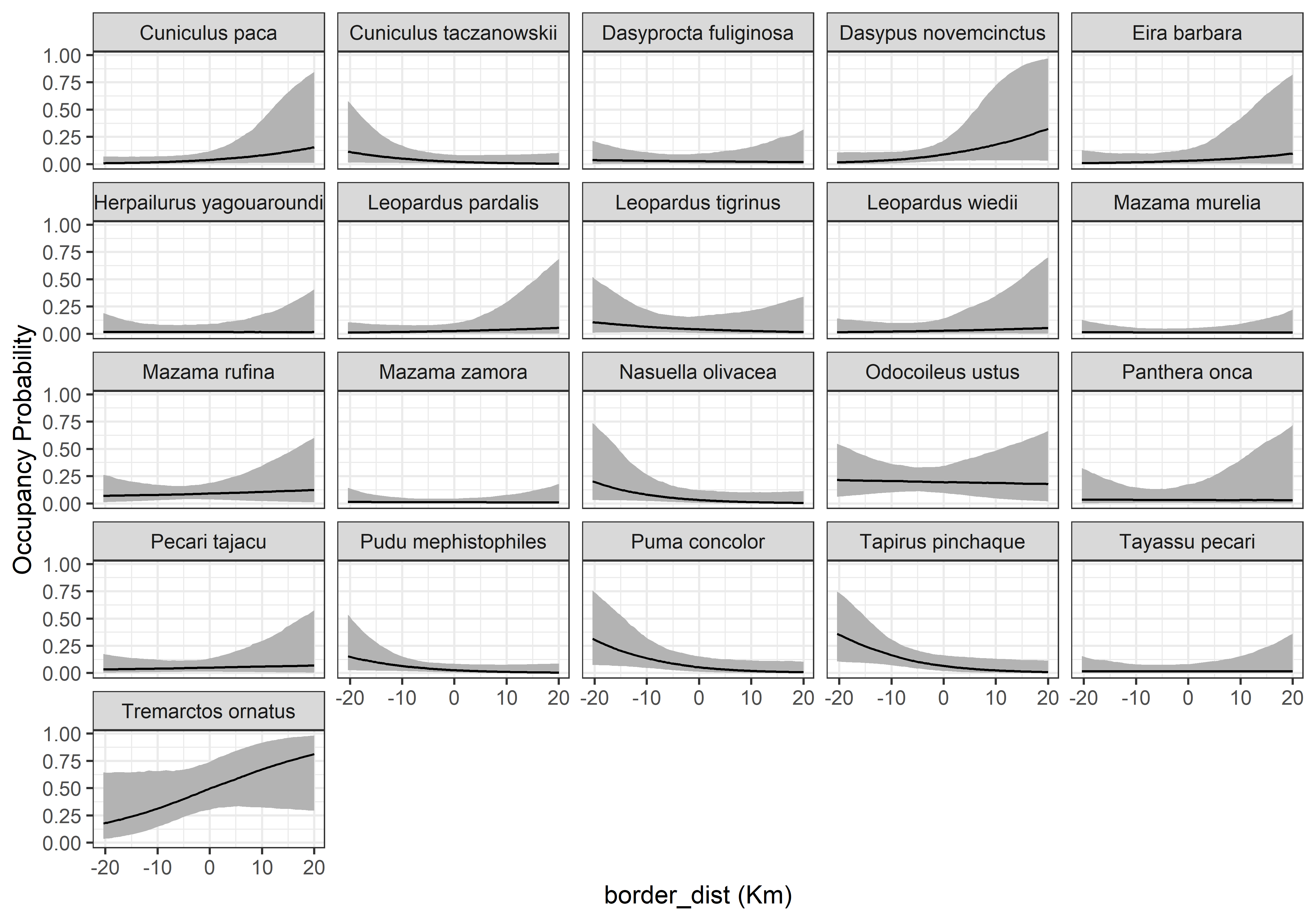 We want to asses the effect of protected areas on the occupancy of the species. We hypothesize that several mammal species have benefited of the conservation actions provided by protected areas, so we expect a decreases in occupancy from the interior of the protected area to the exterior as a function of the distance to the protected area border.