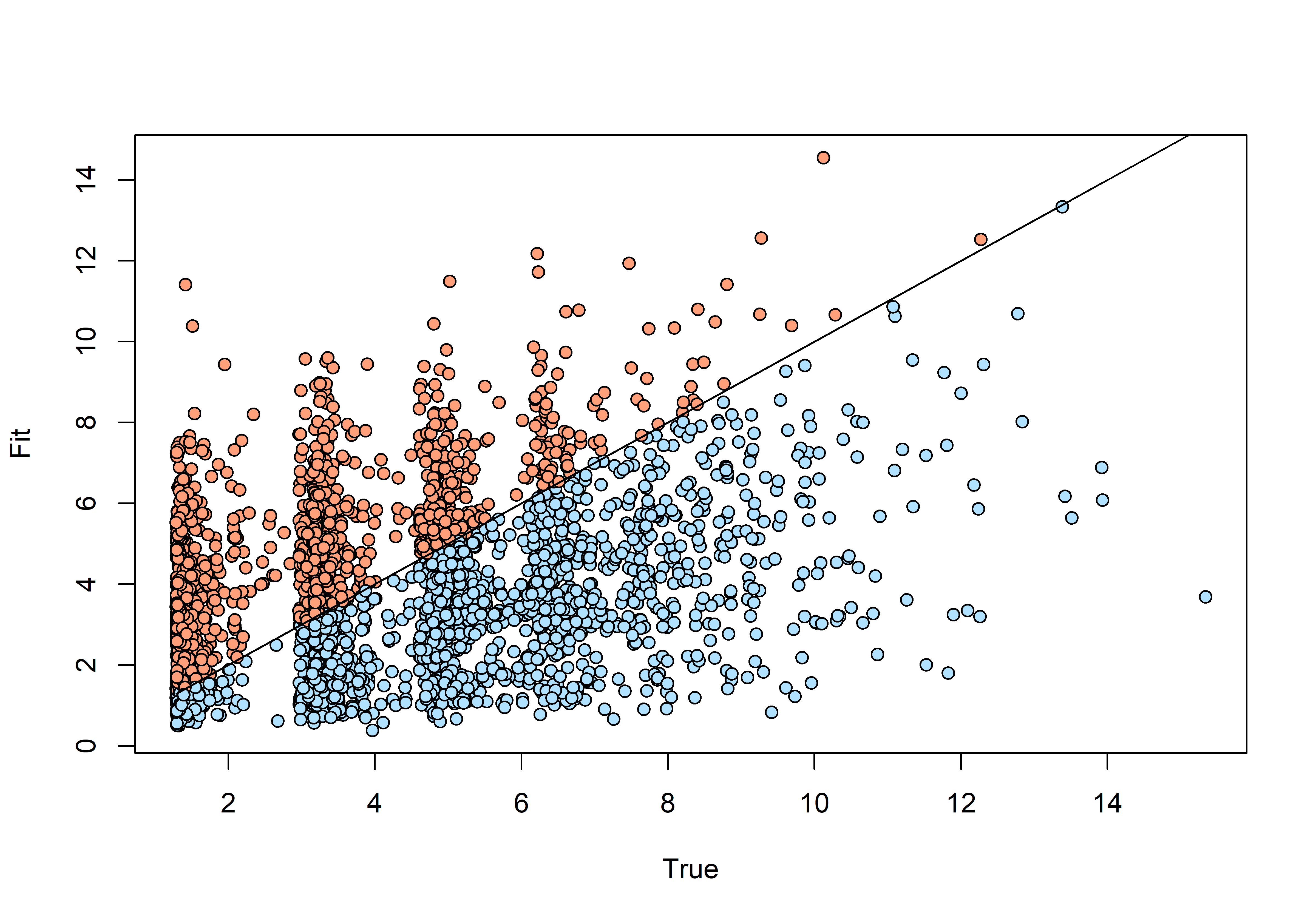 #### fit plotppc.df<-data.frame(fit =ppc.out.sp$fit.y, fit.rep =ppc.out.sp$fit.y.rep, color ='lightskyblue1')ppc.df$color[ppc.df$fit.rep.1>ppc.df$fit.1]<-'lightsalmon'plot(ppc.df$fit.1, ppc.df$fit.rep.1, bg =ppc.df$color, pch =21, ylab ='Fit', xlab ='True')lines(ppc.df$fit.1, ppc.df$fit.1, col ='black')