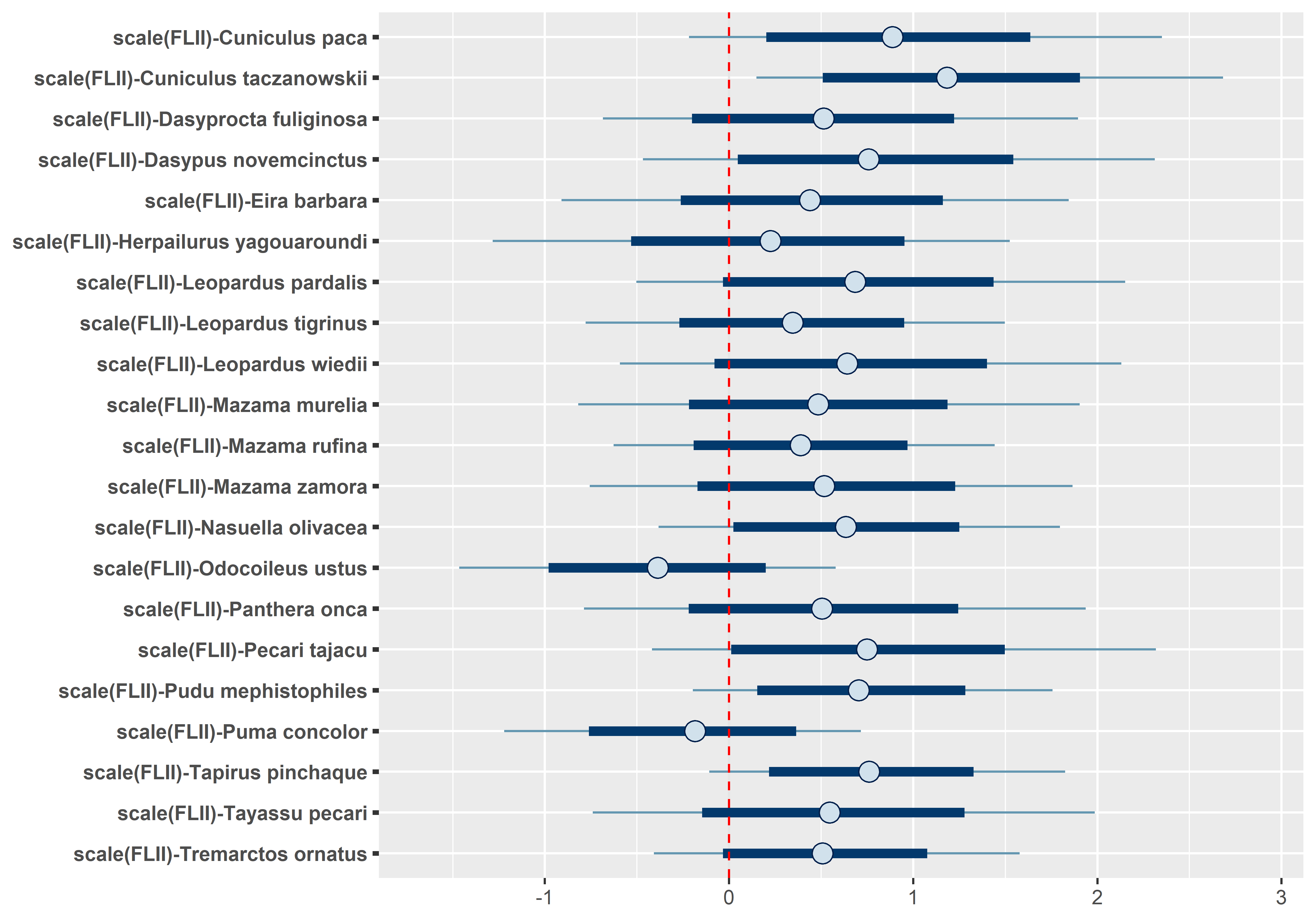# Occupancy species-level effects MCMCplot(out.sp$beta.samples[,22:42], ref_ovl =TRUE, ci =c(50, 95))# Occupancy species-level effects MCMCplot(out.sp$beta.samples[,43:63], ref_ovl =TRUE, ci =c(50, 95))# Occupancy species-level effects MCMCplot(out.sp$beta.samples[,64:84], ref_ovl =TRUE, ci =c(50, 95))