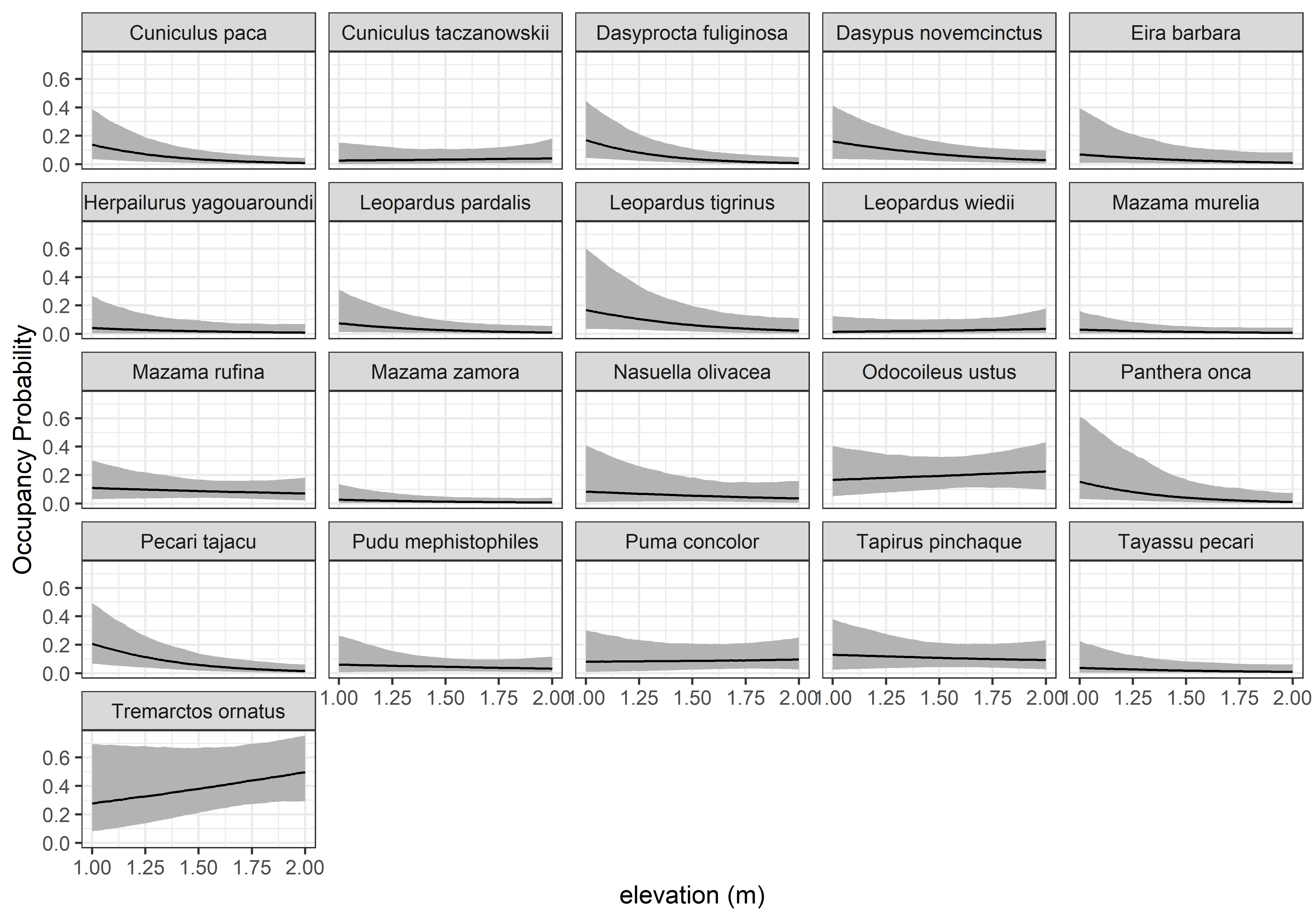 psi.0.quants<-apply(out.pred1$psi.0.samples, c(2, 3), quantile, prob =c(0.025, 0.5, 0.975))sp.codes<-attr(data_list$y, "dimnames")[[1]]psi.plot.dat<-data.frame(psi.med =c(t(psi.0.quants[2, , ])), psi.low =c(t(psi.0.quants[1, , ])), psi.high =c(t(psi.0.quants[3, , ])), elev =elev.pred.vals, sp.codes =rep(sp.codes, each =length(elev.pred.vals)))ggplot(psi.plot.dat, aes(x =elev, y =psi.med))+geom_ribbon(aes(ymin =psi.low, ymax =psi.high), fill ='grey70')+geom_line()+facet_wrap(vars(sp.codes))+theme_bw()+labs(x ='elevation (m)', y ='Occupancy Probability')