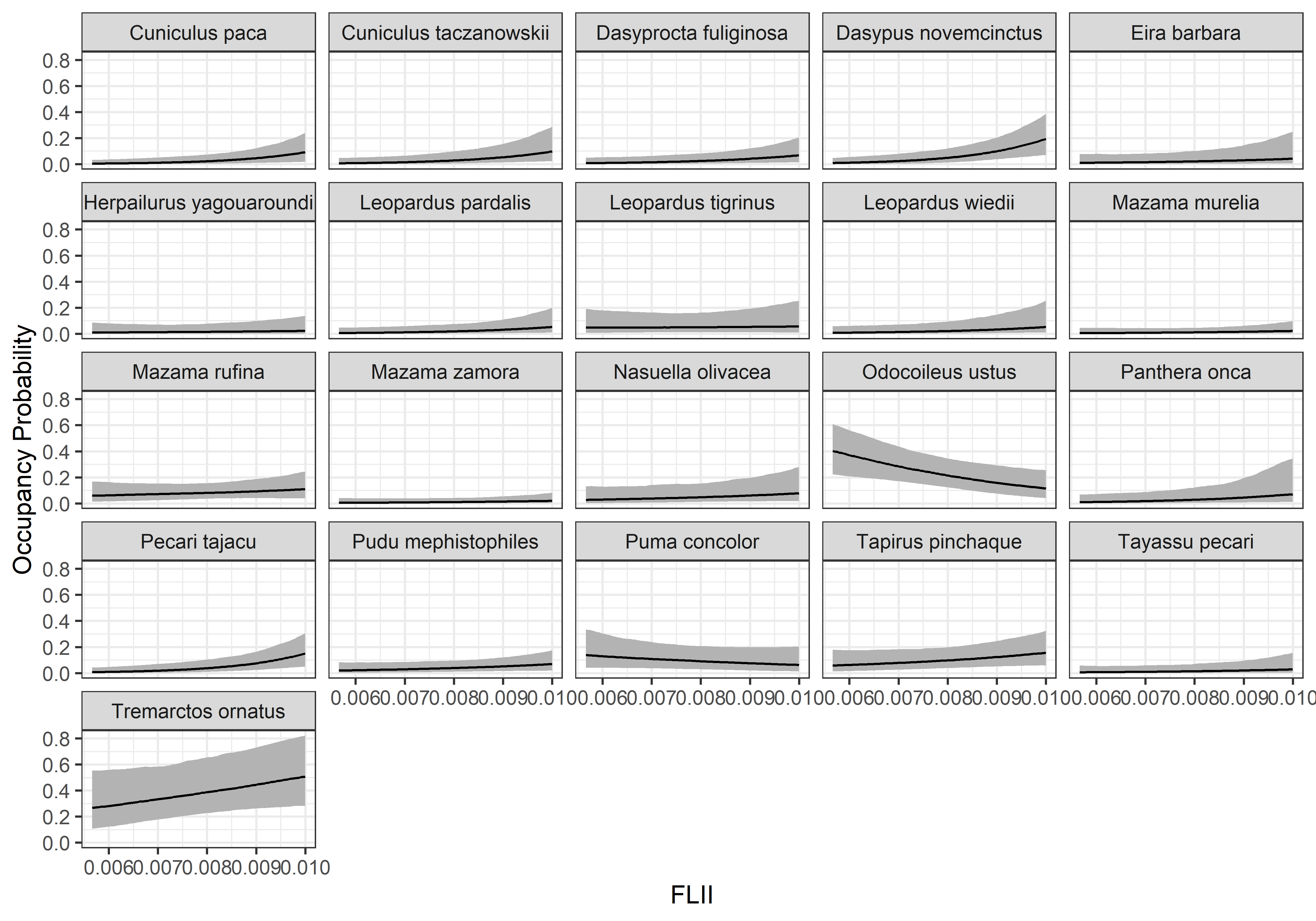 psi.0.quants<-apply(out.pred3$psi.0.samples, c(2, 3), quantile, prob =c(0.025, 0.5, 0.975))sp.codes<-attr(data_list$y, "dimnames")[[1]]psi.plot.dat<-data.frame(psi.med =c(t(psi.0.quants[2, , ])), psi.low =c(t(psi.0.quants[1, , ])), psi.high =c(t(psi.0.quants[3, , ])), FLII =FLII.pred.vals, sp.codes =rep(sp.codes, each =length(FLII.pred.vals)))ggplot(psi.plot.dat, aes(x =FLII/1000, y =psi.med))+geom_ribbon(aes(ymin =psi.low, ymax =psi.high), fill ='grey70')+geom_line()+facet_wrap(vars(sp.codes))+theme_bw()+labs(x ='FLII', y ='Occupancy Probability')