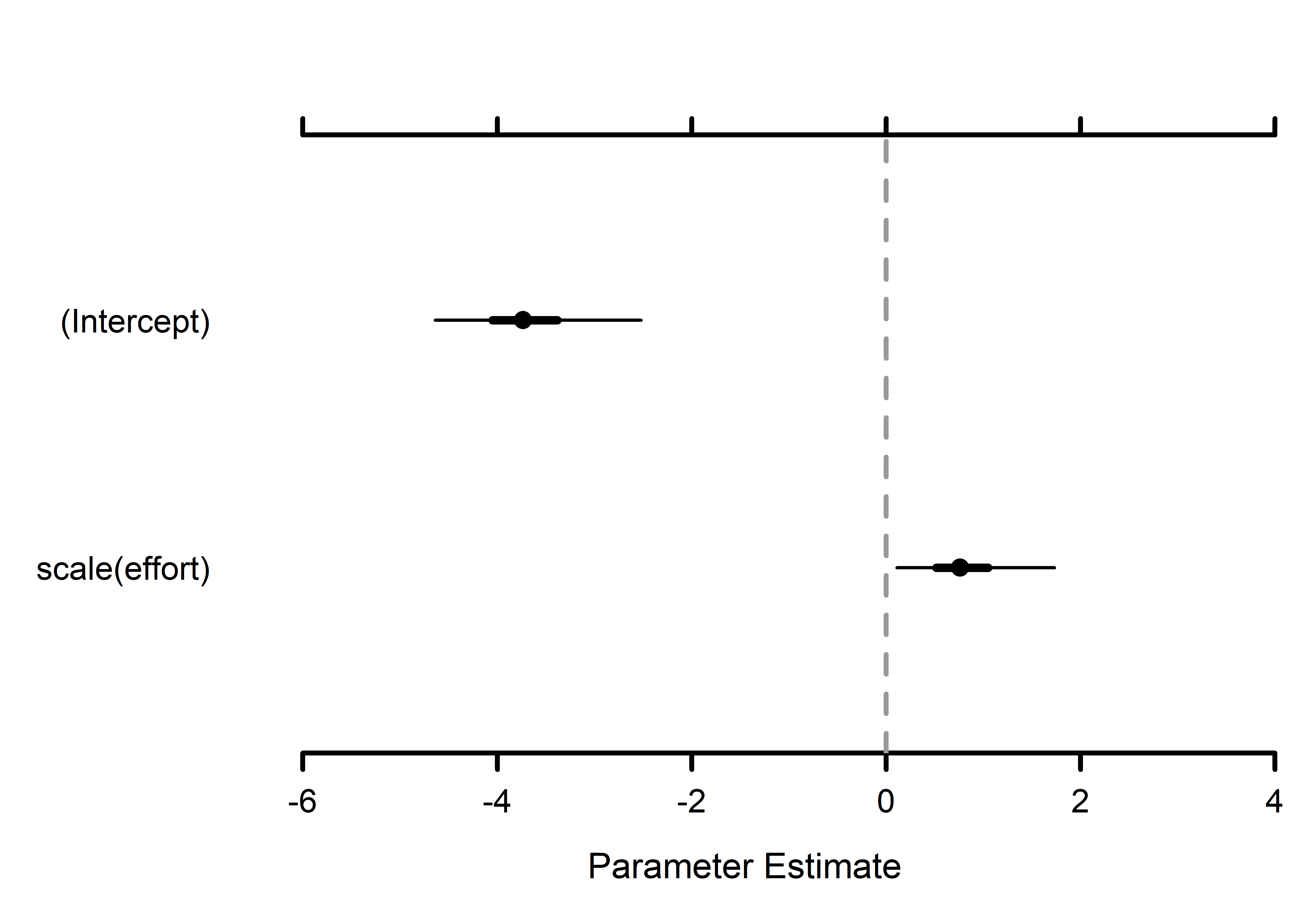 # Create simple plot summaries using MCMCvis package.# Detection covariate effects --------- MCMCplot(out.sp.int$alpha.comm.samples, ref_ovl =TRUE, ci =c(50, 95))# Occupancy community-level effects MCMCplot(out.sp.int$beta.comm.samples, ref_ovl =TRUE, ci =c(50, 95))
