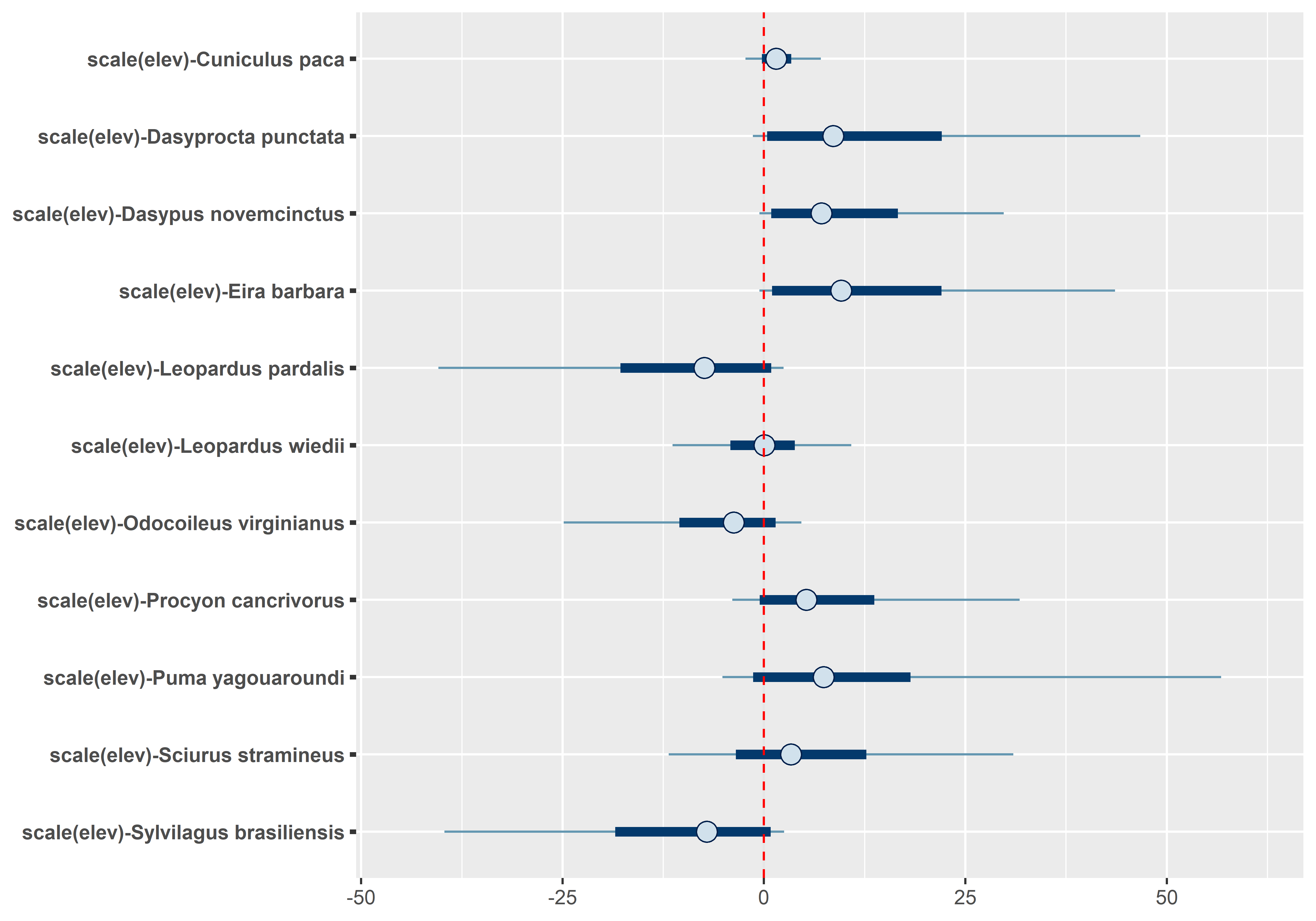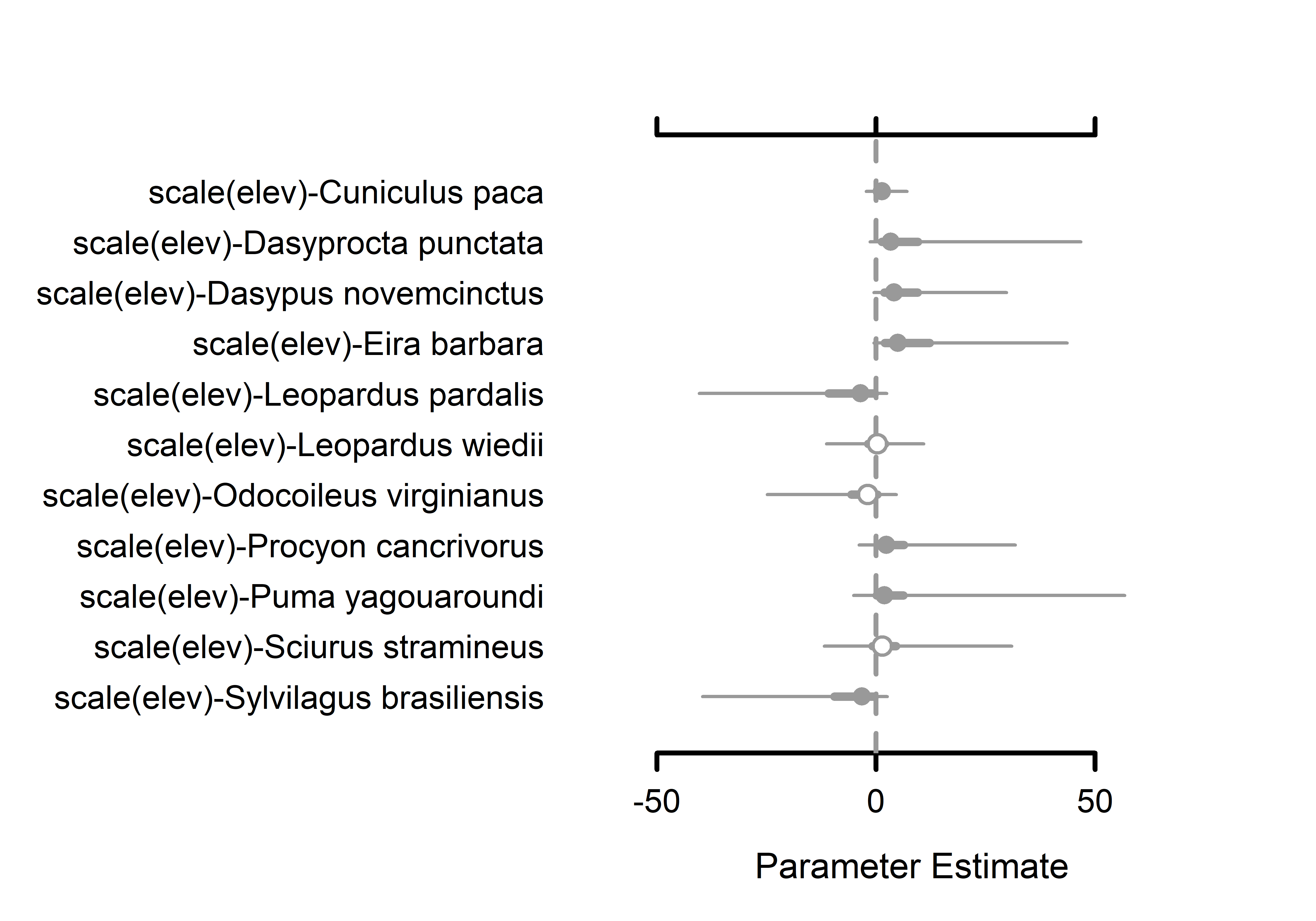 # Running the model# 3. 1 Modelo multi-especie -----------------------------------------# 2. Model fitting --------------------------------------------------------# Fit a non-spatial, multi-species occupancy model. out.null<-msPGOcc(occ.formula =~scale(elev)+scale(border_dist)+scale(FLII) , det.formula =~scale(effort) , # Ordinal.day + I(Ordinal.day^2) + Year data =data_list, n.samples =6000, n.thin =10, n.burn =1000, n.chains =3, n.report =1000);beep(sound =4)