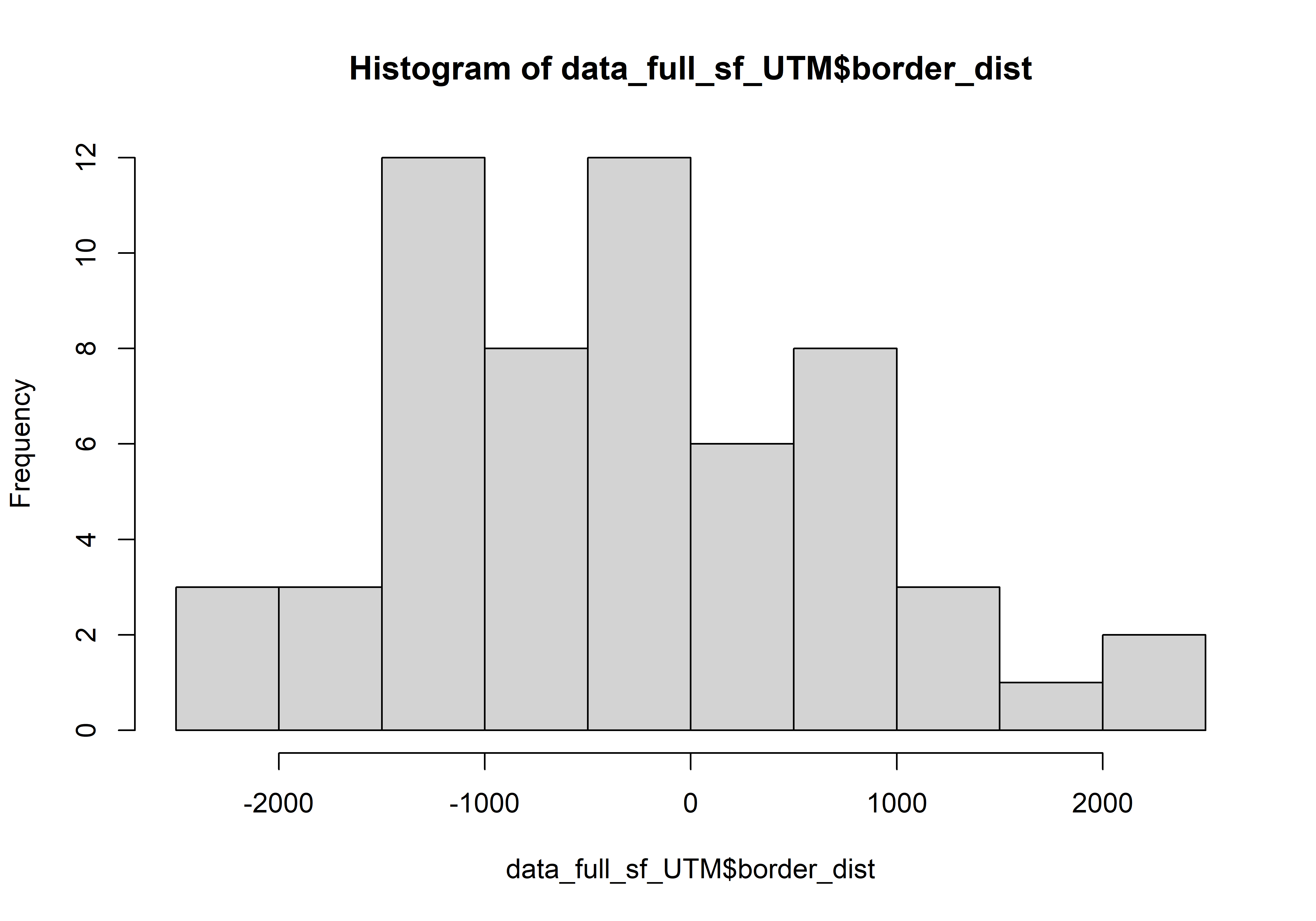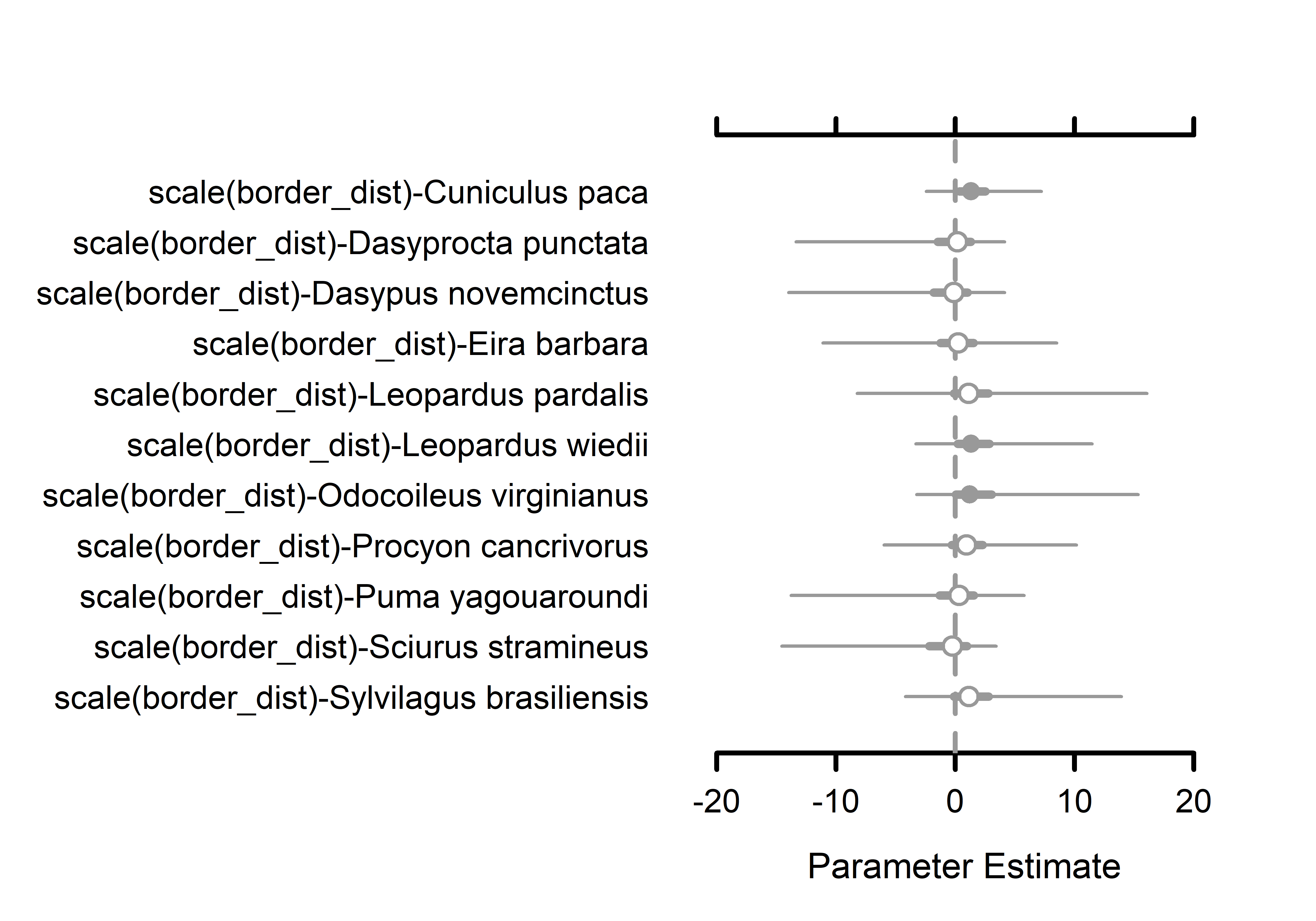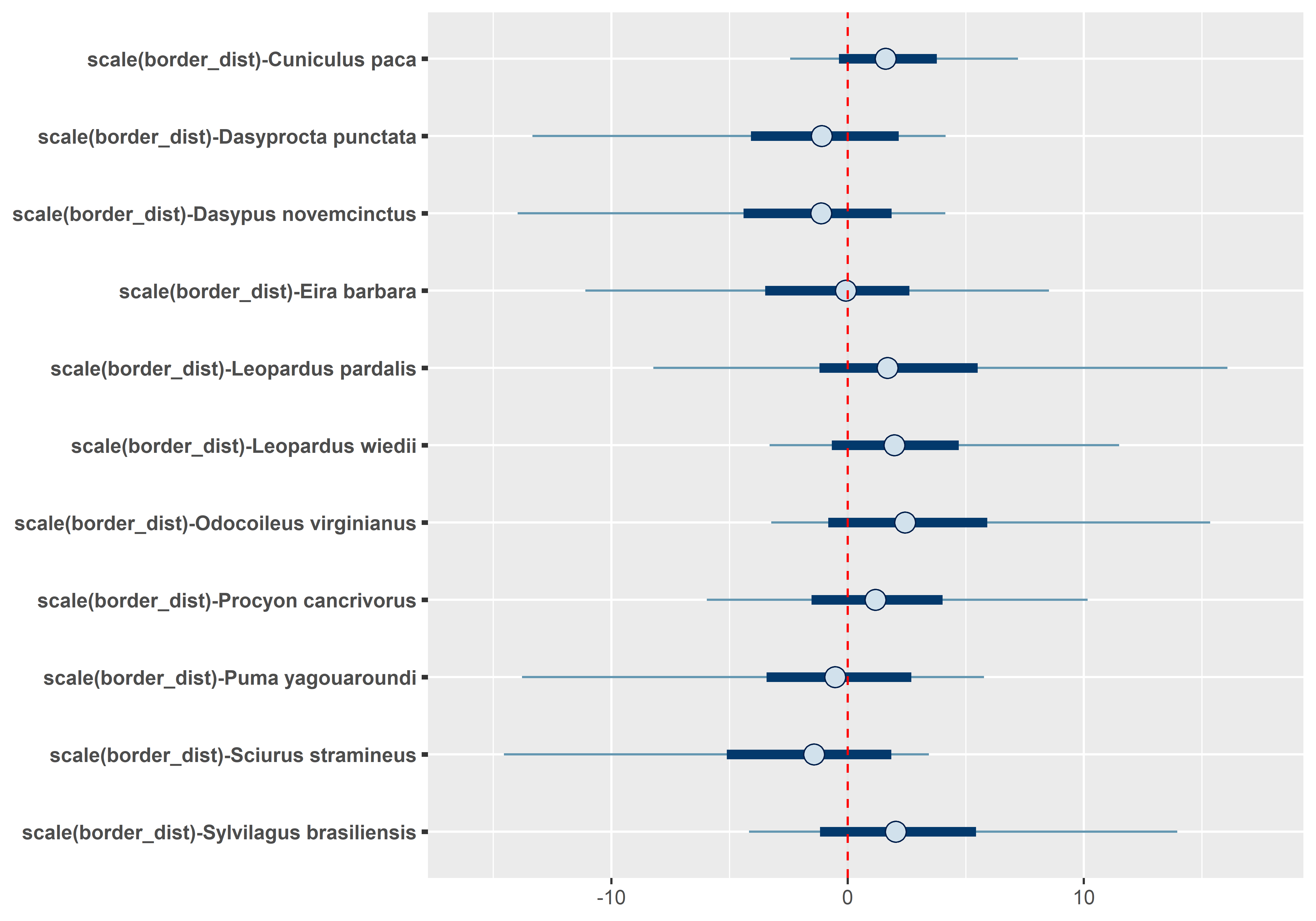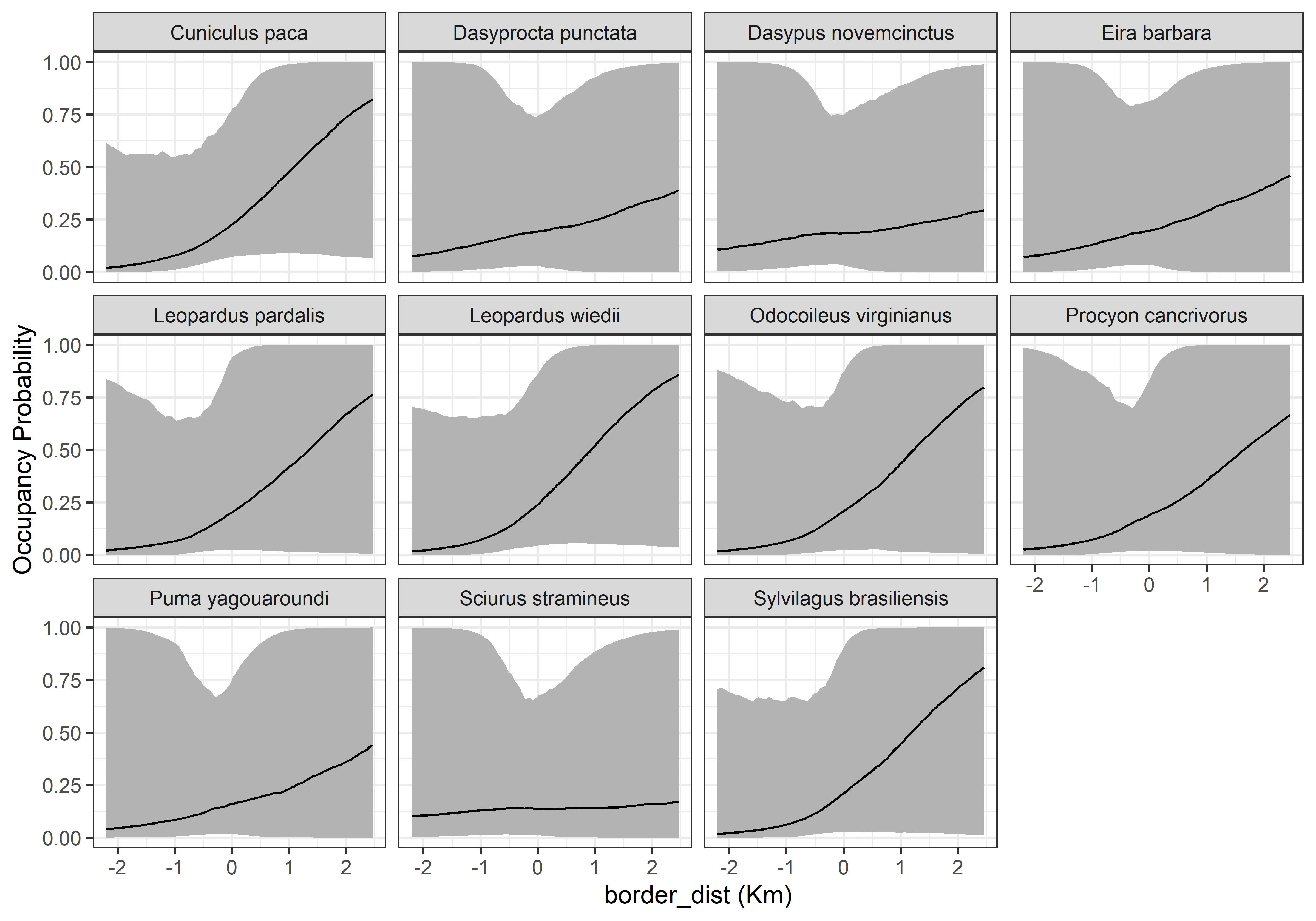 We want to asses the effect of protected areas on the occupancy of the species. We hypothesize that several mammal species have benefited of the conservation actions provided by protected areas, so we expect a decreases in occupancy from the interior of the protected area to the exterior as a function of the distance to the protected area border.