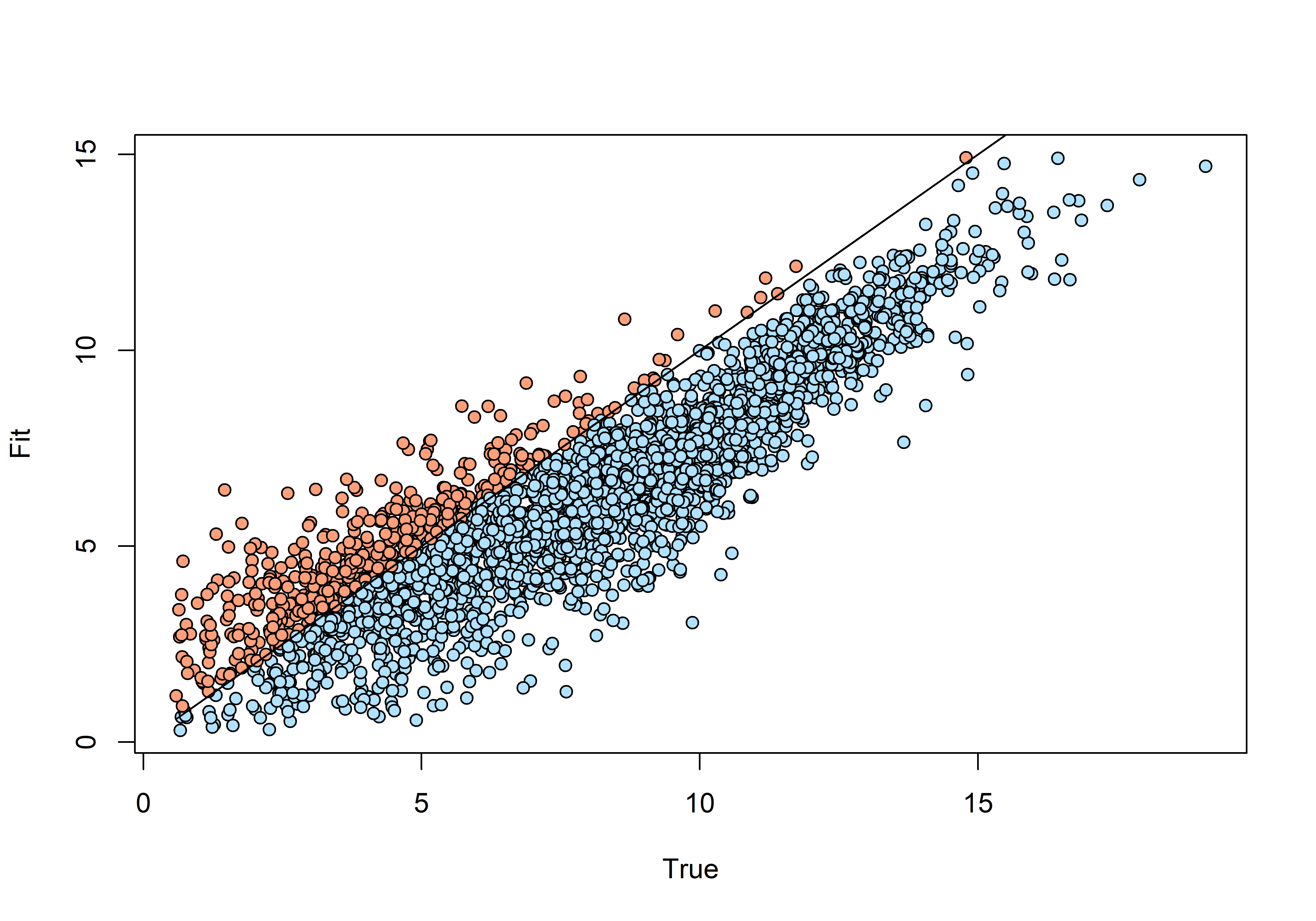 We next perform a posterior predictive check using the Freeman-Tukey statistic grouping the data by sites. We summarize the posterior predictive check with the summary() function, which reports a Bayesian p-value. A Bayesian p-value that hovers around 0.5 indicates adequate model fit, while values less than 0.1 or greater than 0.9 suggest our model does not fit the data well (Hobbs and Hooten 2015). As always with a simulation-based analysis using MCMC, you will get numerically slightly different values.
