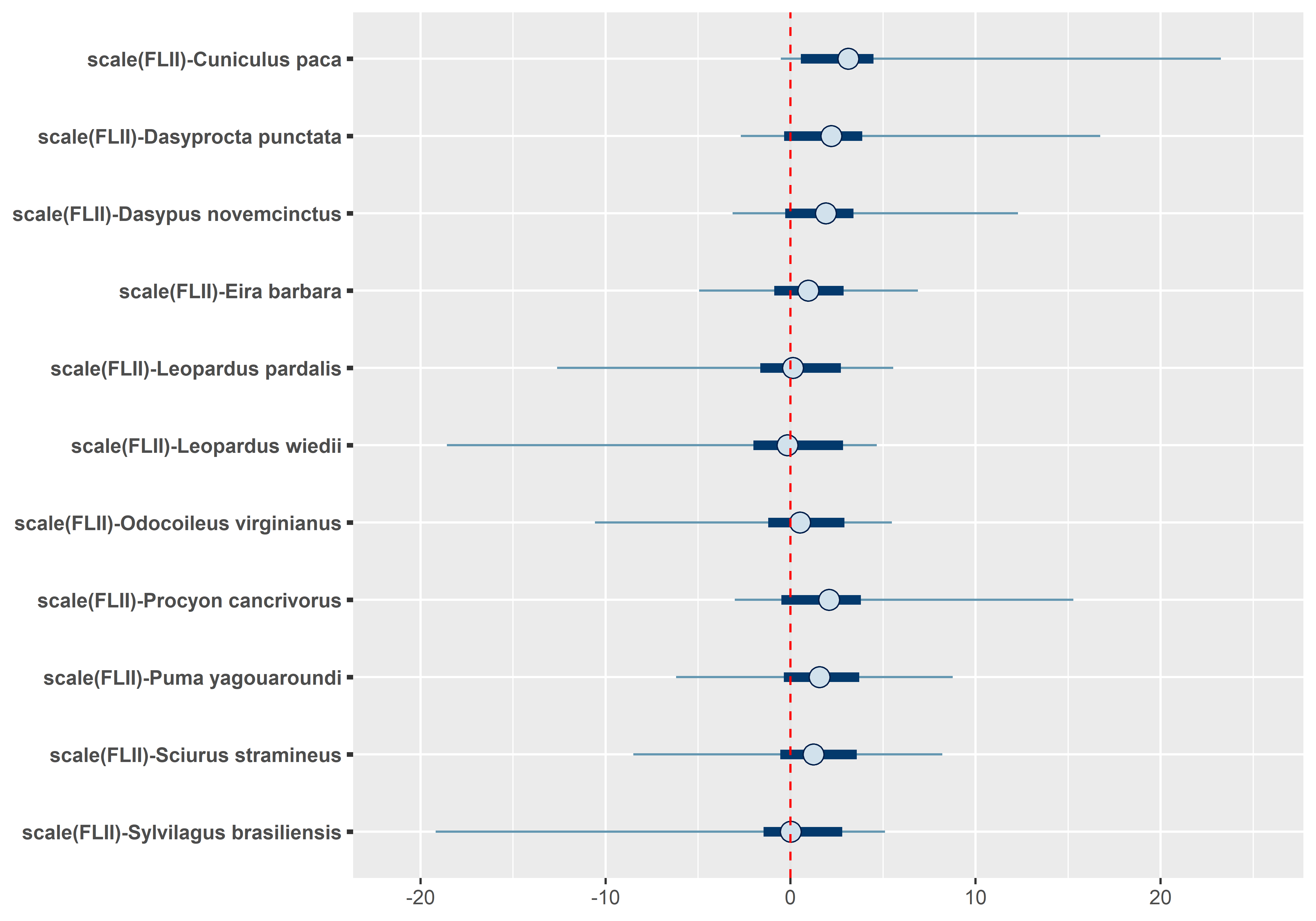 # Occupancy species-level effects MCMCplot(out.sp.int$beta.samples[,12:22], ref_ovl =TRUE, ci =c(50, 95))# Occupancy species-level effects MCMCplot(out.sp.int$beta.samples[,23:33], ref_ovl =TRUE, ci =c(50, 95))# Occupancy species-level effects MCMCplot(out.sp.int$beta.samples[,34:44], ref_ovl =TRUE, ci =c(50, 95))