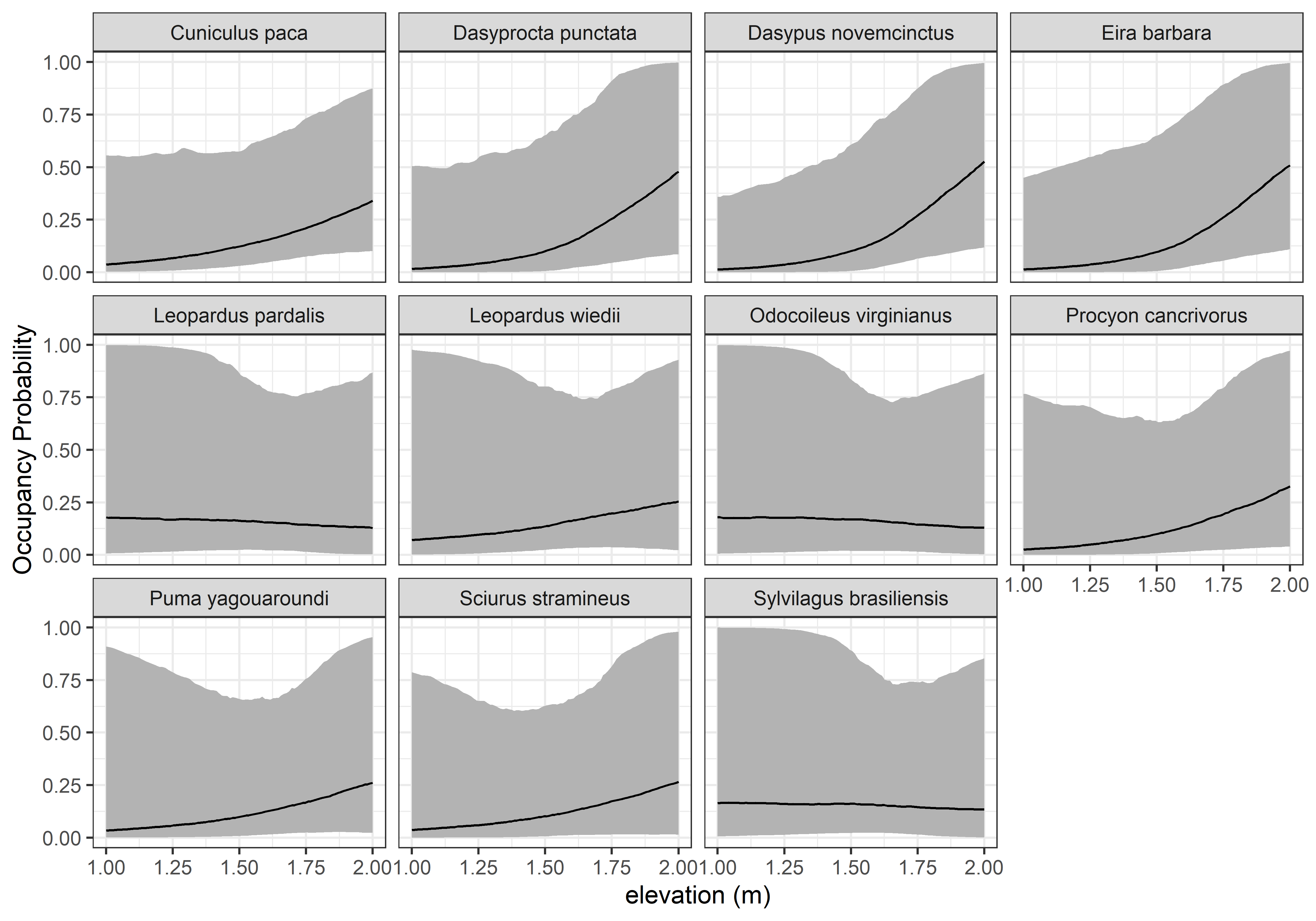 psi.0.quants<-apply(out.pred1$psi.0.samples, c(2, 3), quantile, prob =c(0.025, 0.5, 0.975))sp.codes<-attr(data_list$y, "dimnames")[[1]]psi.plot.dat<-data.frame(psi.med =c(t(psi.0.quants[2, , ])), psi.low =c(t(psi.0.quants[1, , ])), psi.high =c(t(psi.0.quants[3, , ])), elev =elev.pred.vals, sp.codes =rep(sp.codes, each =length(elev.pred.vals)))ggplot(psi.plot.dat, aes(x =elev, y =psi.med))+geom_ribbon(aes(ymin =psi.low, ymax =psi.high), fill ='grey70')+geom_line()+facet_wrap(vars(sp.codes))+theme_bw()+labs(x ='elevation (m)', y ='Occupancy Probability')