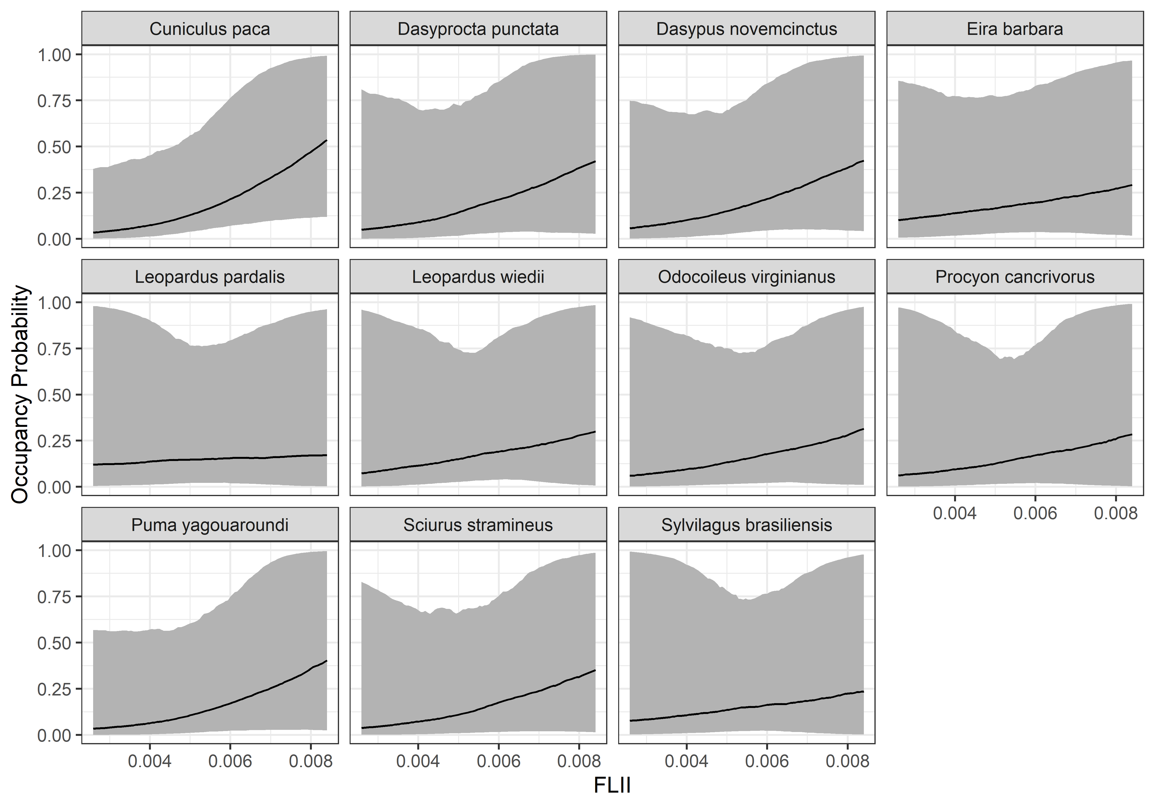 psi.0.quants<-apply(out.pred3$psi.0.samples, c(2, 3), quantile, prob =c(0.025, 0.5, 0.975))sp.codes<-attr(data_list$y, "dimnames")[[1]]psi.plot.dat<-data.frame(psi.med =c(t(psi.0.quants[2, , ])), psi.low =c(t(psi.0.quants[1, , ])), psi.high =c(t(psi.0.quants[3, , ])), FLII =FLII.pred.vals, sp.codes =rep(sp.codes, each =length(FLII.pred.vals)))ggplot(psi.plot.dat, aes(x =FLII/1000, y =psi.med))+geom_ribbon(aes(ymin =psi.low, ymax =psi.high), fill ='grey70')+geom_line()+facet_wrap(vars(sp.codes))+theme_bw()+labs(x ='FLII', y ='Occupancy Probability')