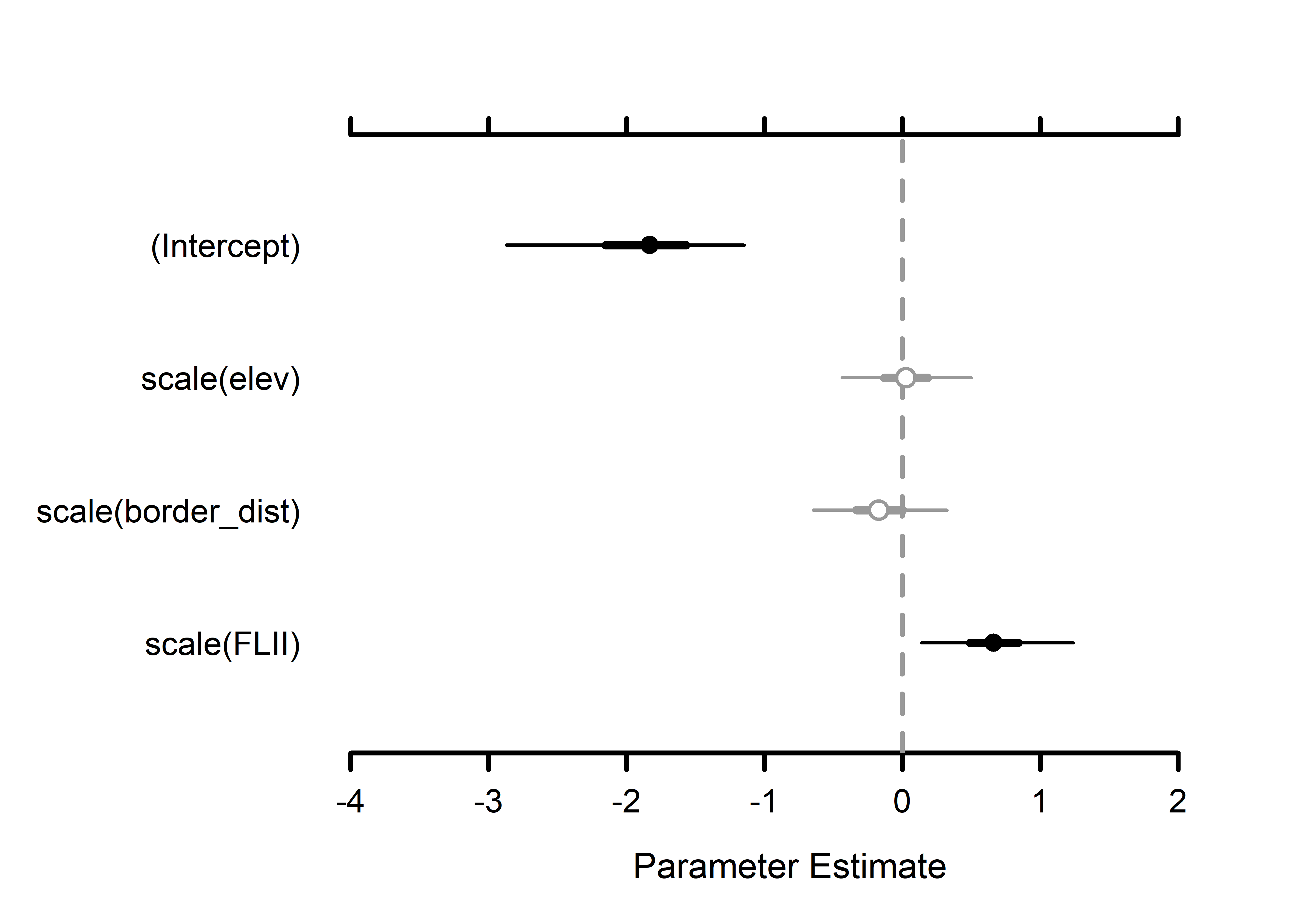 # 6. Prediction -----------------------------------------------------------# Predict occupancy along a gradient of elev # Create a set of values across the range of observed elev valueselev.pred.vals<-seq(min(data_list$occ.covs$elev), max(data_list$occ.covs$elev), length.out =100)# Scale predicted values by mean and standard deviation used to fit the modelelev.pred.vals.scale<-(elev.pred.vals-mean(data_list$occ.covs$elev))/sd(data_list$occ.covs$elev)# Create a set of values across the range of observed elev valuesborder_dist.pred.vals<-seq(min(data_list$occ.covs$border_dist), max(data_list$occ.covs$border_dist), length.out =100)# Scale predicted values by mean and standard deviation used to fit the modelborder_dist.pred.vals.scale<-(border_dist.pred.vals-mean(data_list$occ.covs$border_dist))/sd(data_list$occ.covs$border_dist)# Create a set of values across the range of observed FLII valuesFLII.pred.vals<-seq(min(data_list$occ.covs$FLII), max(data_list$occ.covs$FLII), length.out =100)# Scale predicted values by mean and standard deviation used to fit the modelFLII.pred.vals.scale<-(FLII.pred.vals-mean(data_list$occ.covs$FLII))/sd(data_list$occ.covs$FLII)# Predict occupancy across elev values at mean values of all other variablespred.df1<-as.matrix(data.frame(intercept =1, elev =elev.pred.vals.scale, border_dist =0, FLII=0))#, catchment = 0, density = 0, # slope = 0))# Predict occupancy across elev values at mean values of all other variablespred.df2<-as.matrix(data.frame(intercept =1, elev =0, border_dist =border_dist.pred.vals.scale, FLII=0))#, catchment = 0, density = 0, # slope = 0))# Predict occupancy across elev values at mean values of all other variablespred.df3<-as.matrix(data.frame(intercept =1, elev =0, border_dist =0, FLII=FLII.pred.vals.scale))#, catchment = 0, density = 0, # slope = 0))out.pred1<-predict(out.null, pred.df1)# using non spatialstr(out.pred1)