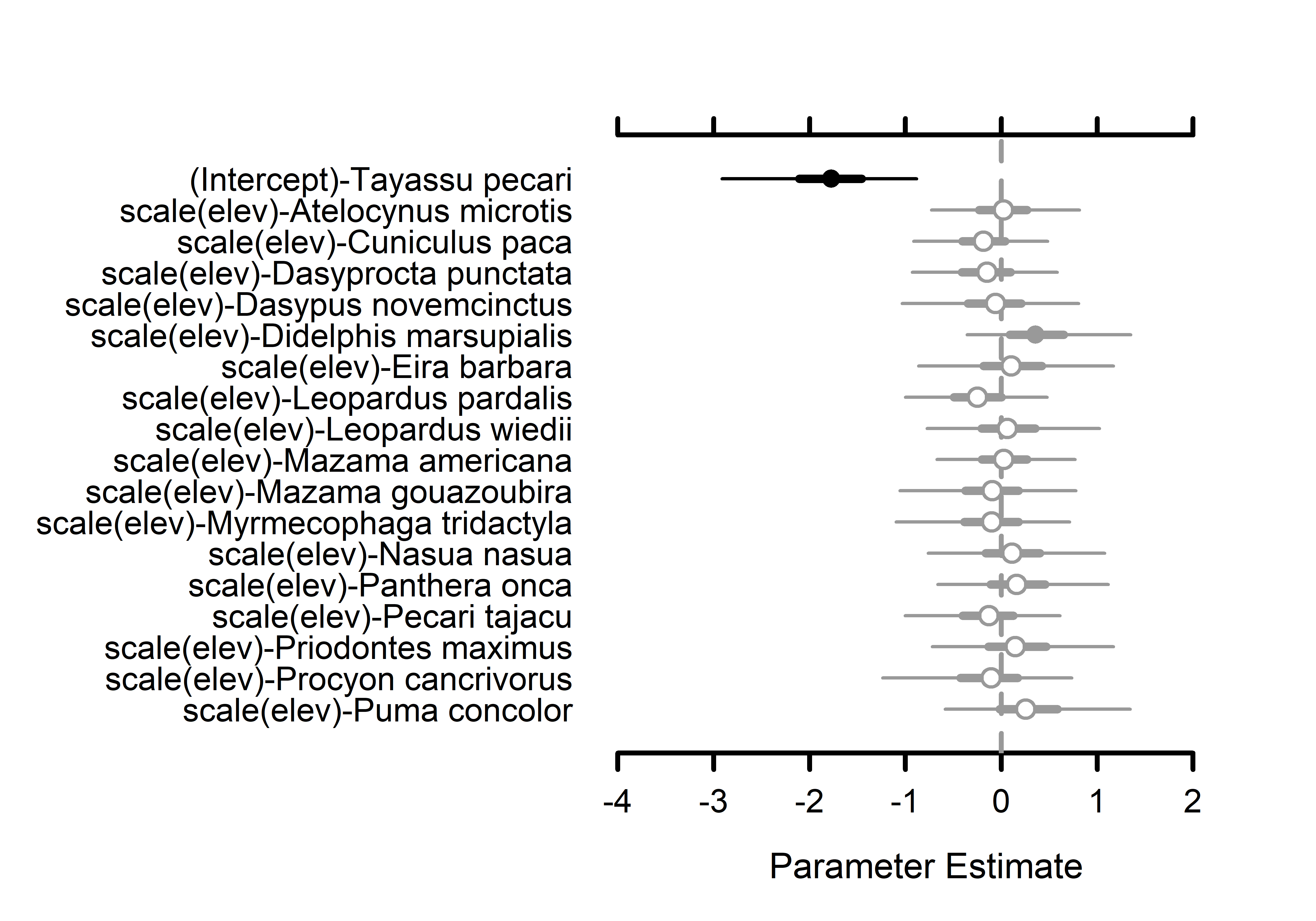 # Running the model# 3. 1 Modelo multi-especie -----------------------------------------# 2. Model fitting --------------------------------------------------------# Fit a non-spatial, multi-species occupancy model. out.null<-msPGOcc(occ.formula =~scale(elev)+scale(border_dist)+scale(FLII) , det.formula =~scale(effort) , # Ordinal.day + I(Ordinal.day^2) + Year data =data_list, n.samples =6000, n.thin =10, n.burn =1000, n.chains =3, n.report =1000);beep(sound =4)