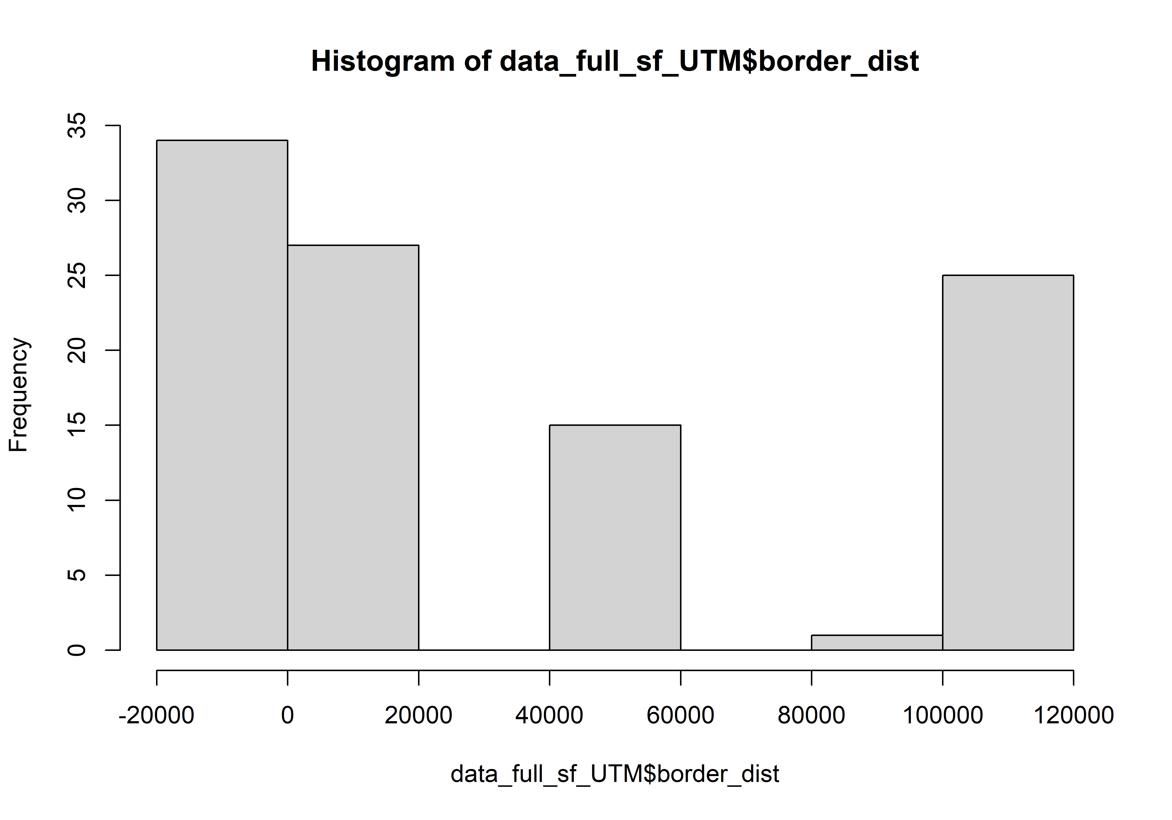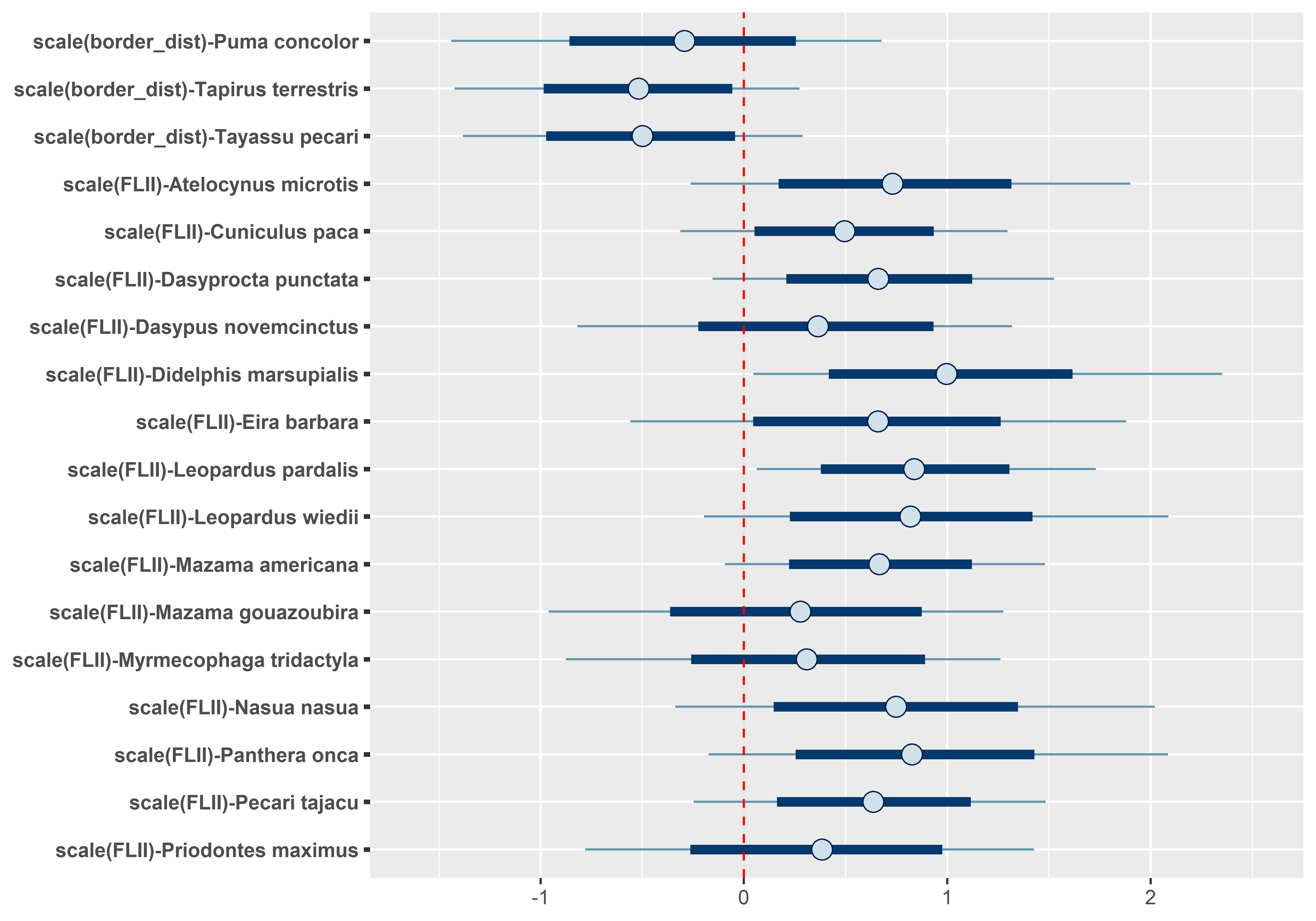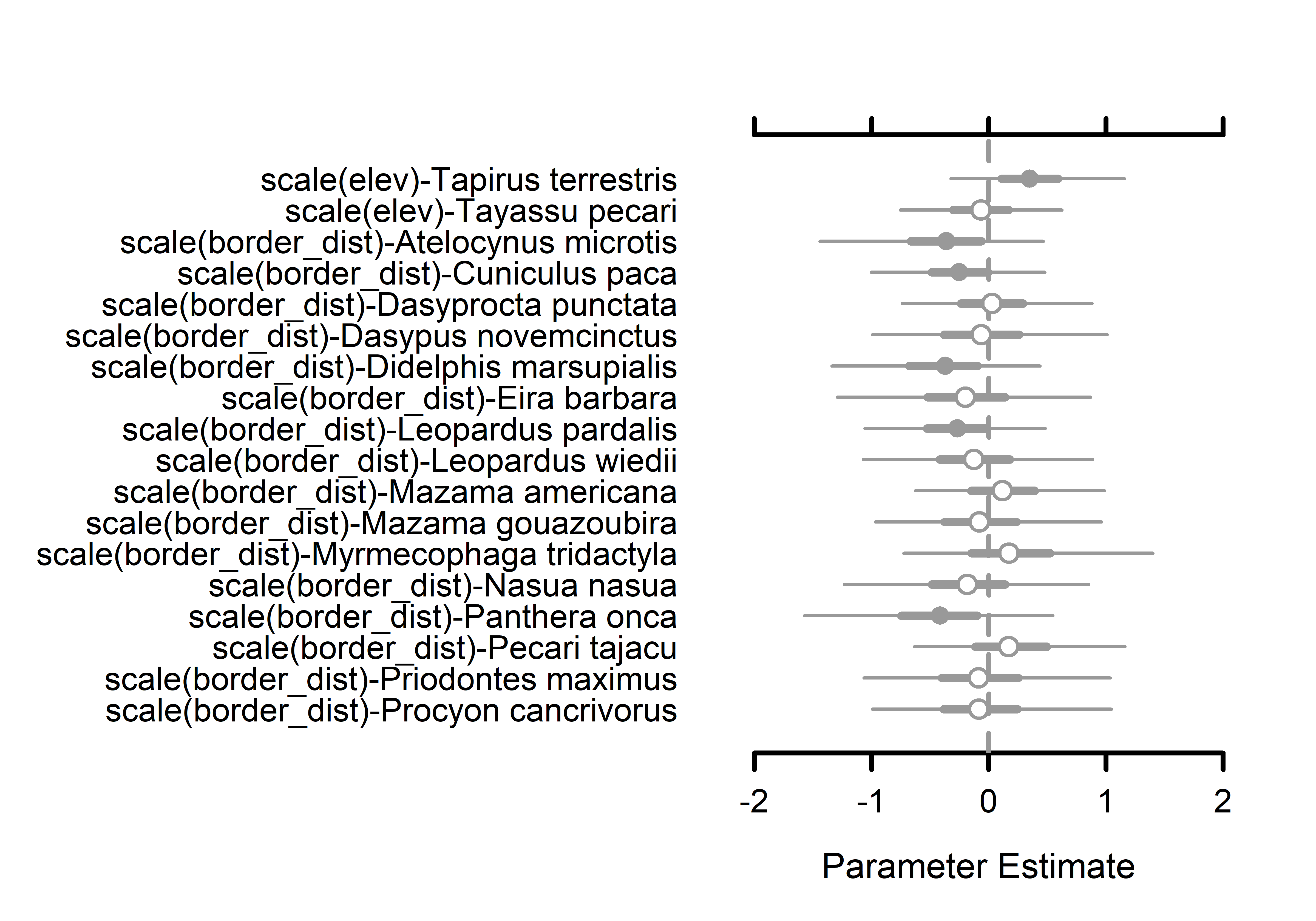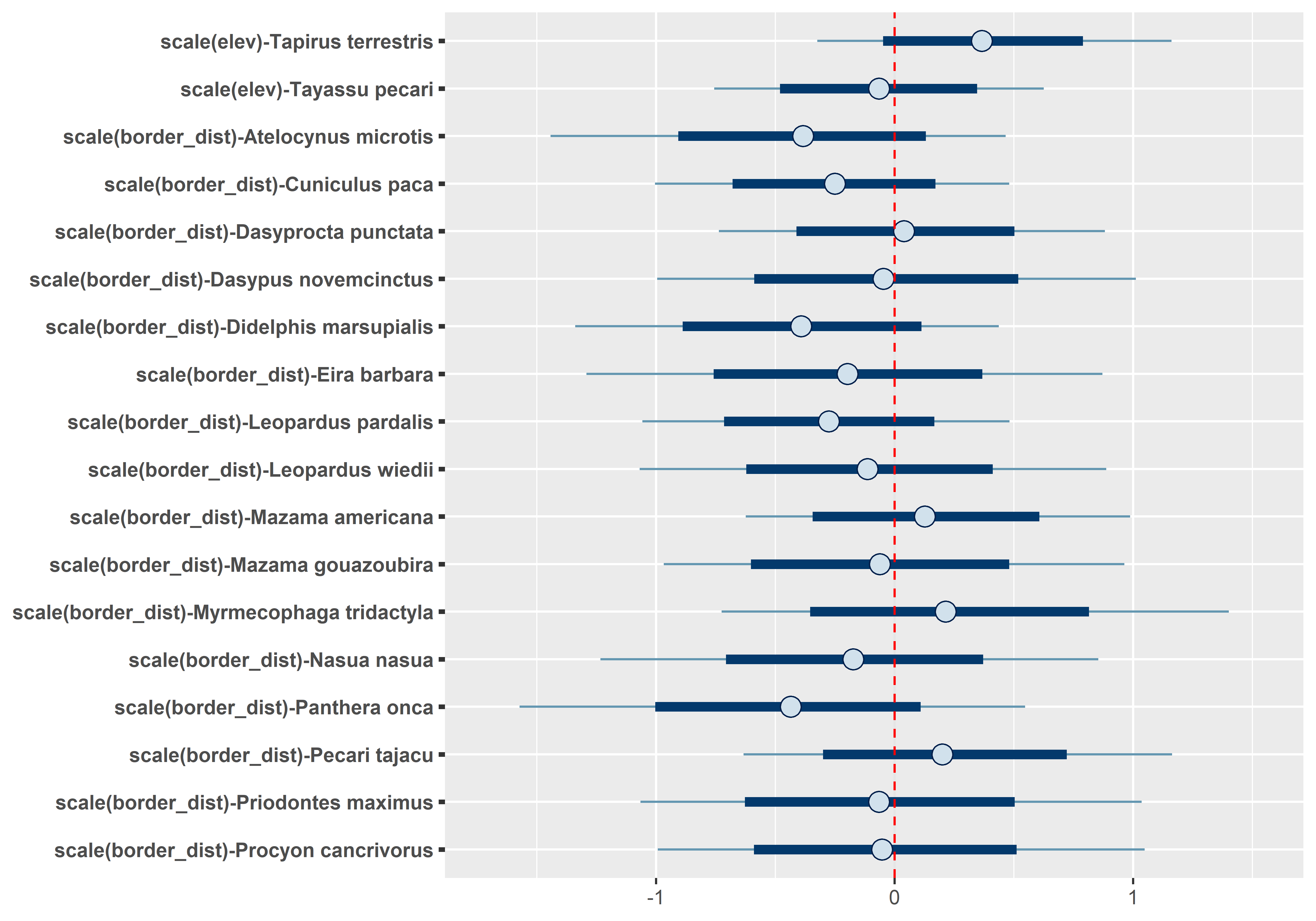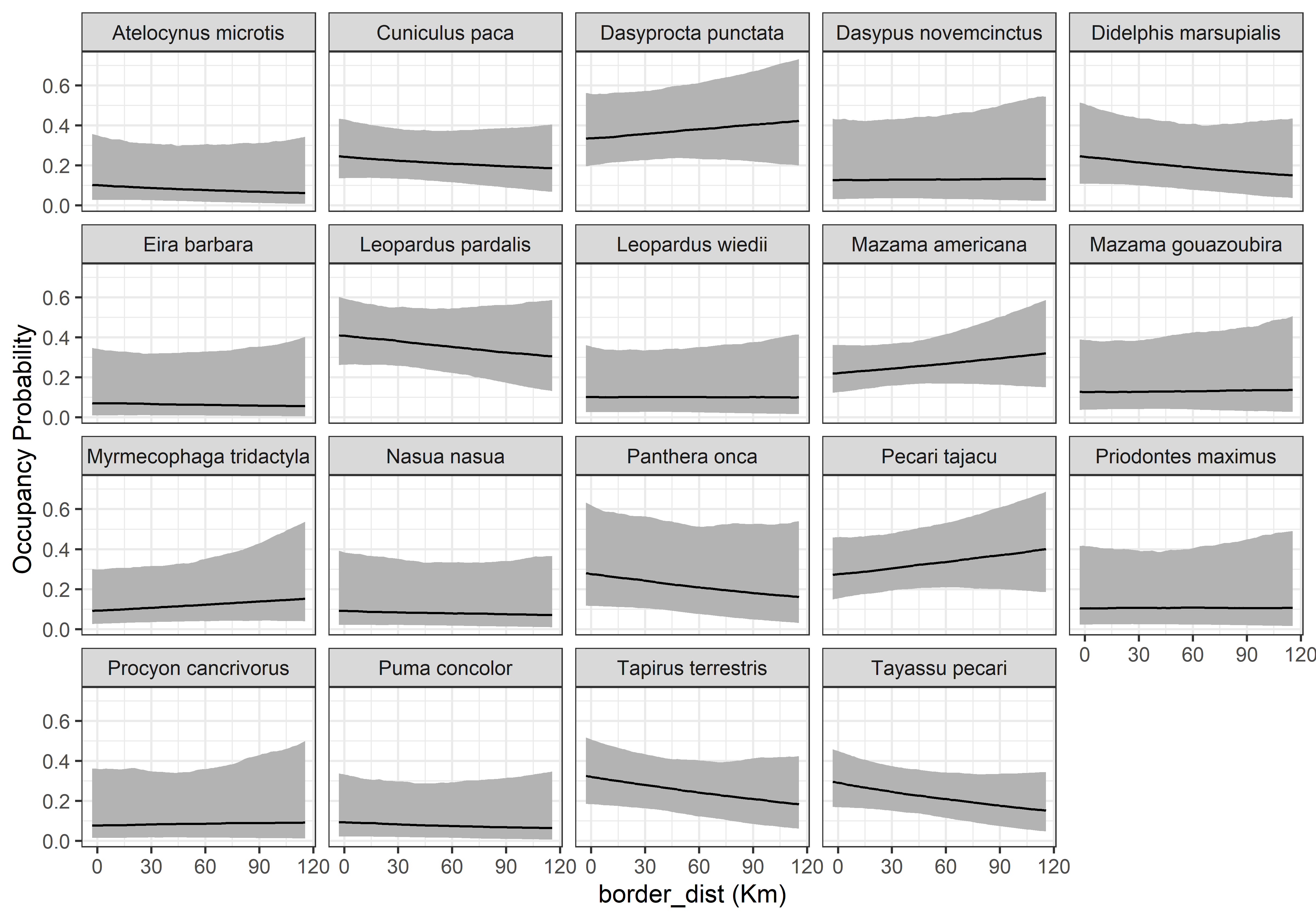 We want to asses the effect of protected areas on the occupancy of the species. We hypothesize that several mammal species have benefited of the conservation actions provided by protected areas, so we expect a decreases in occupancy from the interior of the protected area to the exterior as a function of the distance to the protected area border.