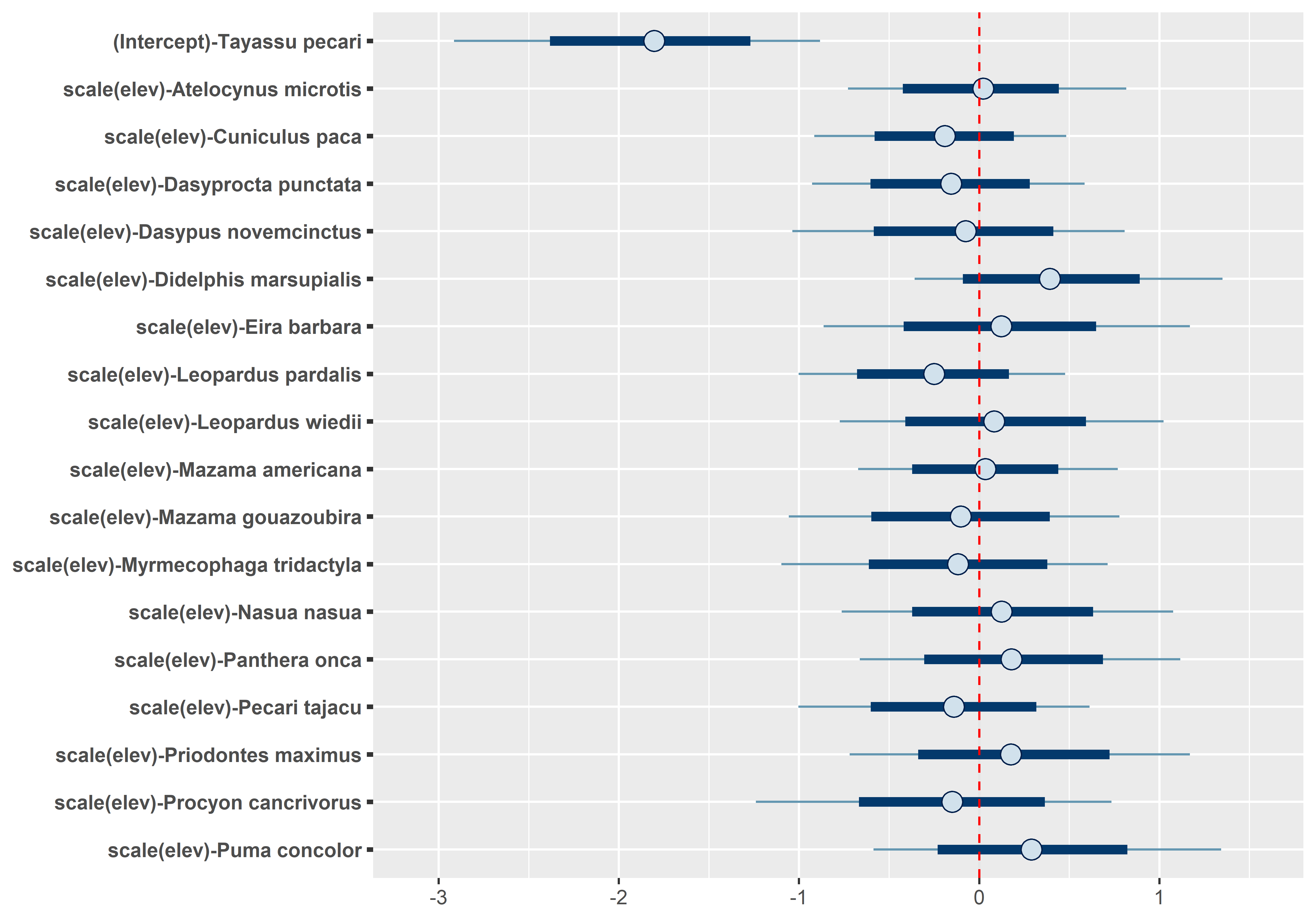 # Detection-nondetection data ---------# Species of interest, can select individually# curr.sp <- sort(unique(Ecu_14_15_16$.id))# c('BAWW', 'BLJA', 'GCFL')# sort(names(DetHist_list))selected.sp<-c("Atelocynus microtis" ,#"Coendou prehensilis" ,"Cuniculus paca", "Dasyprocta punctata", "Dasypus novemcinctus" , "Didelphis marsupialis", "Eira barbara", #"Herpailurus yagouaroundi","Leopardus pardalis", #"Leopardus tigrinus" ,"Leopardus wiedii", "Mazama americana","Mazama gouazoubira",#"Mitu tuberosum" ,#"Myoprocta pratti","Myrmecophaga tridactyla","Nasua nasua" ,# "Mazama americana", # "Myotis myotis", # "Nasua narica", # "Odocoileus virginianus", "Panthera onca" ,# "Procyon cancrivorus" ,"Pecari tajacu", #"Penelope jacquacu" ,"Priodontes maximus" ,"Procyon cancrivorus", # "Psophia leucoptera","Puma concolor" ,# "Puma yagouaroundi", # "Rattus rattus" ,# "Roedor sp.",# "Sciurus sp.", # "Sus scrofa", # "Sylvilagus brasiliensis", #"Tamandua tetradactyla", #"Tapirus pinchaque" ,"Tapirus terrestris","Tayassu pecari"#"Tinamus major" )# y.msom <- y[which(sp.codes %in% selected.sp), , ]# str(y.msom)# Use selectiony.selected<-ylist[selected.sp]######################################### three-dimensional array with dimensions corresponding to:#### species, sites, and replicates###################################### 1. Load the abind library to make arrays easily library(abind)my_array_abind<-abind(y.selected, # start from list along =3, # 3D array use.first.dimnames=TRUE)# keep names# Transpose the array to have:# species, sites, and sampling occasions in that order# The new order is (3rd dim, 1st dim, 2nd dim)transposed_array<-aperm(my_array_abind, c(3, 1, 2))#### site covssitecovs<-as.data.frame(st_drop_geometry(data_full_sf_UTM[,5:8]))sitecovs[, 1]<-as.vector((sitecovs[,1]))# scale numeric covariatessitecovs[, 1]<-as.numeric((sitecovs[,2]))# scale numeric covariatessitecovs[, 3]<-as.vector((sitecovs[,3]))# scale numeric covariatessitecovs[, 4]<-as.vector((sitecovs[,4]))# scale numeric covariates# sitecovs$fact <- factor(c("A", "A", "B")) # categorical covariatenames(sitecovs)<-c("elev", "in_AP", "FLII", "border_dist")# check consistancy equal number of spatial covariates and rows in data# identical(nrow(ylist[[1]]), nrow(covars)) # Base de datos para los análisis -----------------------------------------# match the names to "y" "occ.covs" "det.covs" "coords" data_list<-list(y =transposed_array, # Historias de detección occ.covs =sitecovs, # covs de sitio det.covs =list(effort =DetHist_list[[1]]$effort), coords =st_coordinates(data_full_sf_UTM))# agregamos el esfuerzo de muestreo como covariable de observación