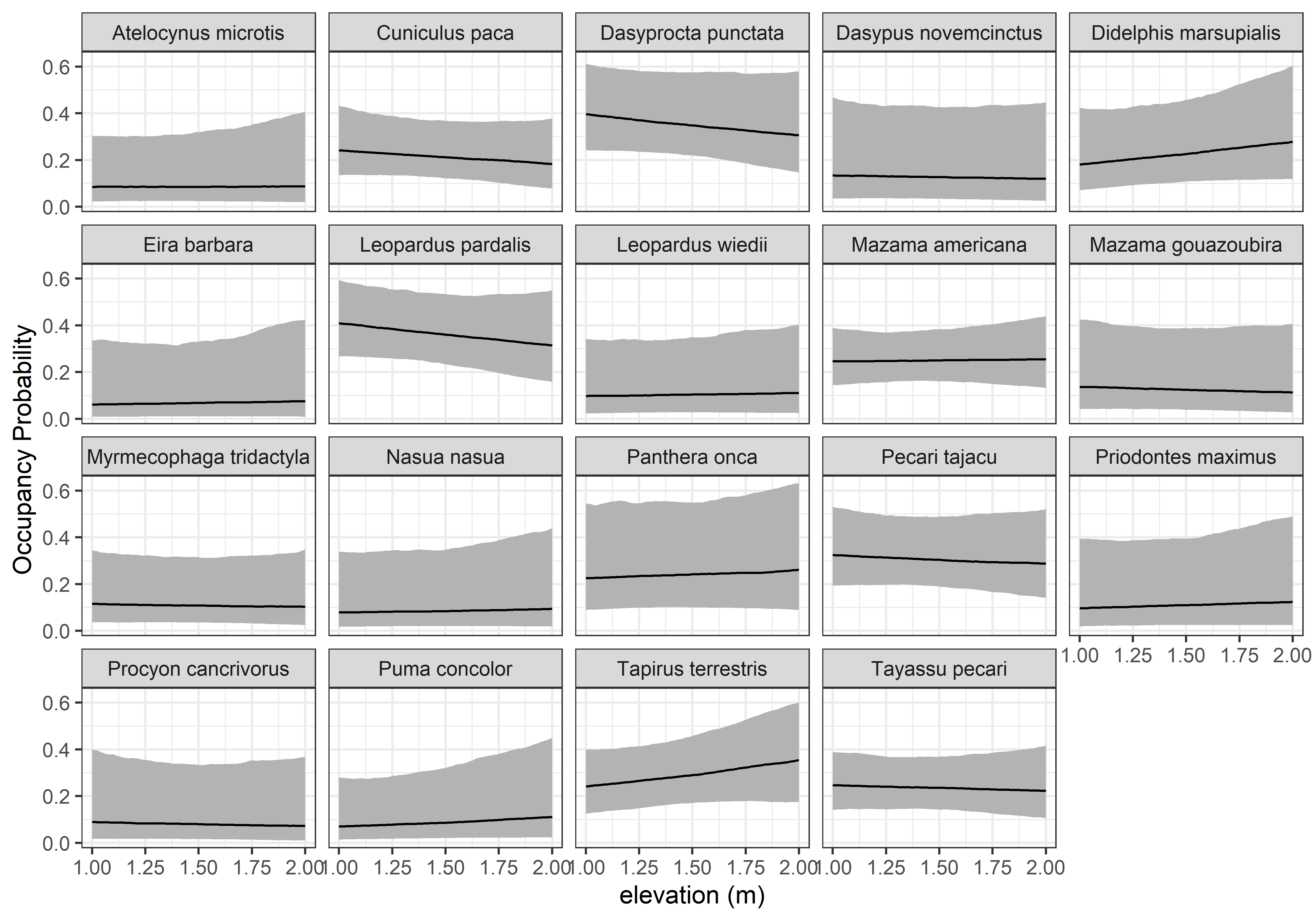 psi.0.quants<-apply(out.pred1$psi.0.samples, c(2, 3), quantile, prob =c(0.025, 0.5, 0.975))sp.codes<-attr(data_list$y, "dimnames")[[1]]psi.plot.dat<-data.frame(psi.med =c(t(psi.0.quants[2, , ])), psi.low =c(t(psi.0.quants[1, , ])), psi.high =c(t(psi.0.quants[3, , ])), elev =elev.pred.vals, sp.codes =rep(sp.codes, each =length(elev.pred.vals)))ggplot(psi.plot.dat, aes(x =elev, y =psi.med))+geom_ribbon(aes(ymin =psi.low, ymax =psi.high), fill ='grey70')+geom_line()+facet_wrap(vars(sp.codes))+theme_bw()+labs(x ='elevation (m)', y ='Occupancy Probability')