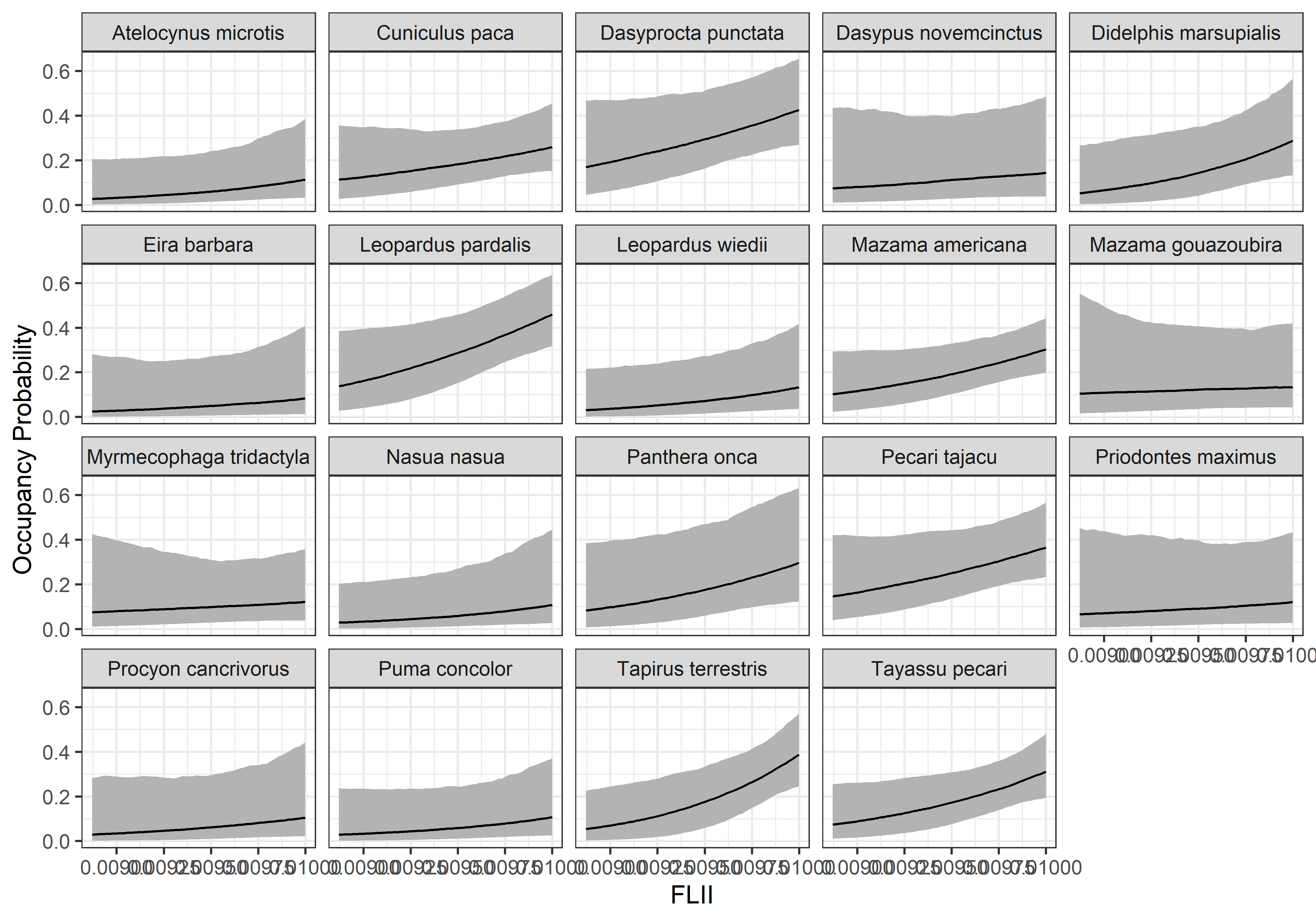 psi.0.quants<-apply(out.pred3$psi.0.samples, c(2, 3), quantile, prob =c(0.025, 0.5, 0.975))sp.codes<-attr(data_list$y, "dimnames")[[1]]psi.plot.dat<-data.frame(psi.med =c(t(psi.0.quants[2, , ])), psi.low =c(t(psi.0.quants[1, , ])), psi.high =c(t(psi.0.quants[3, , ])), FLII =FLII.pred.vals, sp.codes =rep(sp.codes, each =length(FLII.pred.vals)))ggplot(psi.plot.dat, aes(x =FLII/1000, y =psi.med))+geom_ribbon(aes(ymin =psi.low, ymax =psi.high), fill ='grey70')+geom_line()+facet_wrap(vars(sp.codes))+theme_bw()+labs(x ='FLII', y ='Occupancy Probability')