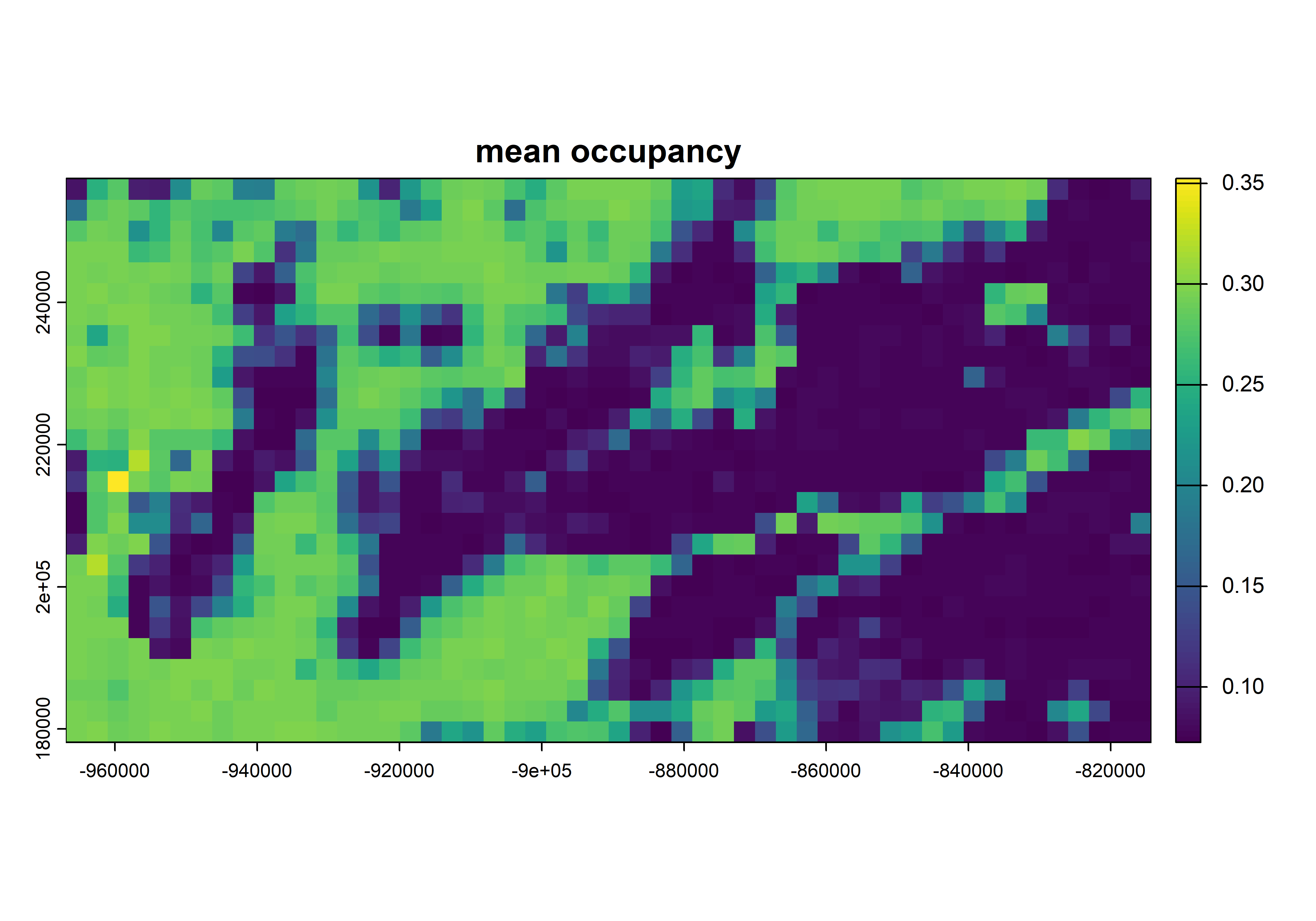 # get the meanpredicted_mean<-mean(predictad_raster_stack)plot(predicted_mean, main="mean occupancy")