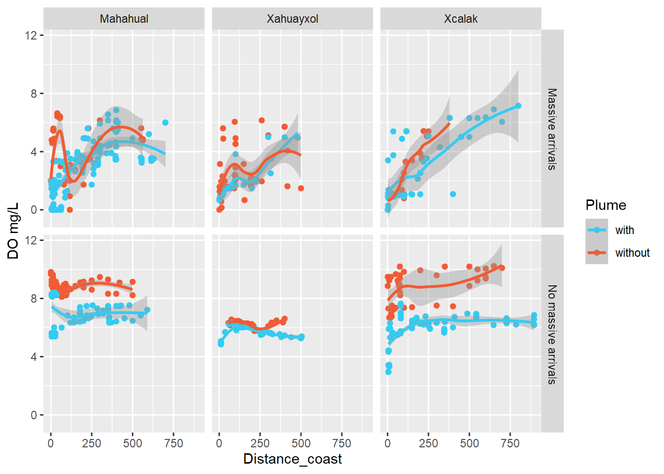 ggplot(sargasso, aes(x=Distance_coast, y=DO, color=Plume)) +