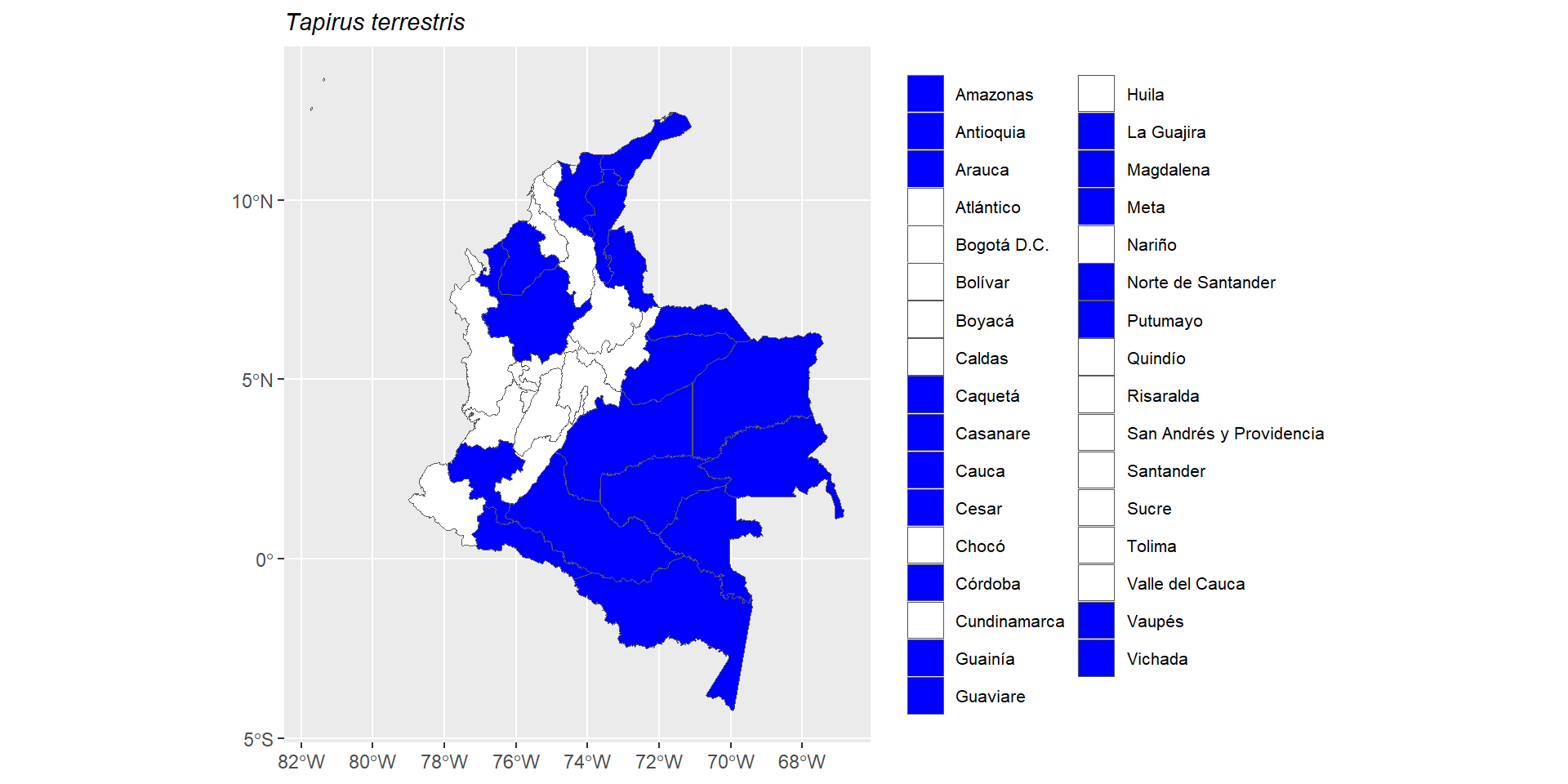 17 Caldas | Cauca | Chocó | Nariño | Quindío | Risaralda | Valle del Cauca | Amazonas | Caquetá | Cauca | Guainía | Guaviare | Meta | Nariño | Putumayo | Vaupés | Vichada | Antioquia | Arauca | Atlántico | Boyacá | Casanare | Cesar | Córdoba | Cundinamarca | Huila | La Guajira | Magdalena | Norte de Santander | Santander | Sucre | Tolima