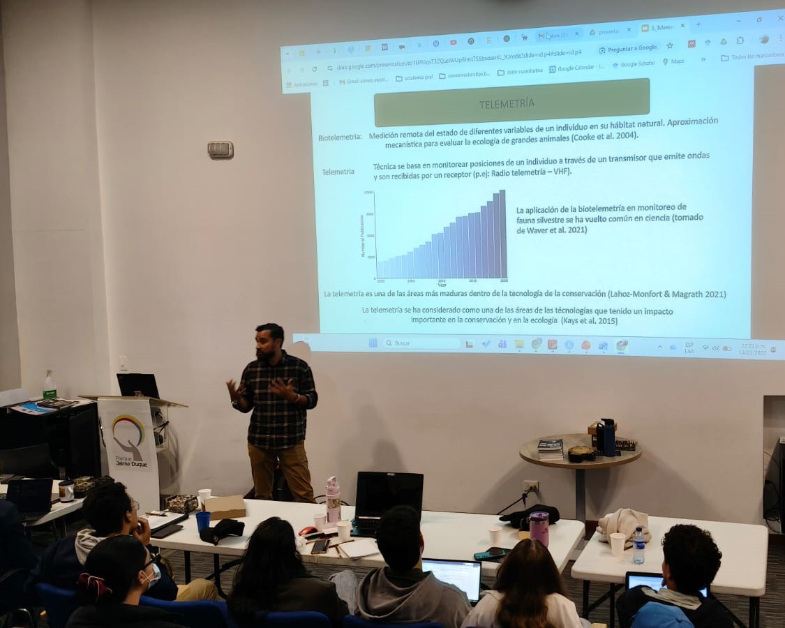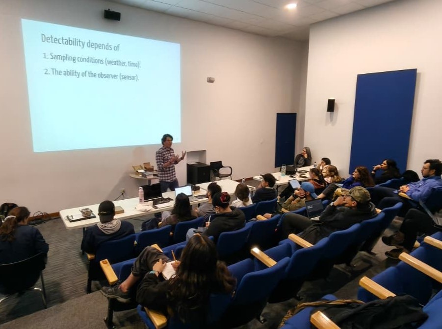 Laín Pardo sentó las bases mostrando el aspecto histórico y la importancia de la pregunta de investigación en el fototrampeo. Mauricio Vela nos contó sobre el paso siguiente al modelado de la ocupación y es entender el movimiento de los animales y la importancia del rango de hogar para diseñar un buen muestreo en los modelos de ocupación. Angélica Díaz ilustró el uso de wildlife insights y como esta herramienta ahorra tiempo valioso y facilita la colaboración. Luego vino una inmersión al aspecto histórico de los modelos de ocupación y la importancia de los muestreos repetidos para solucionar el problema de la detección imperfecta.